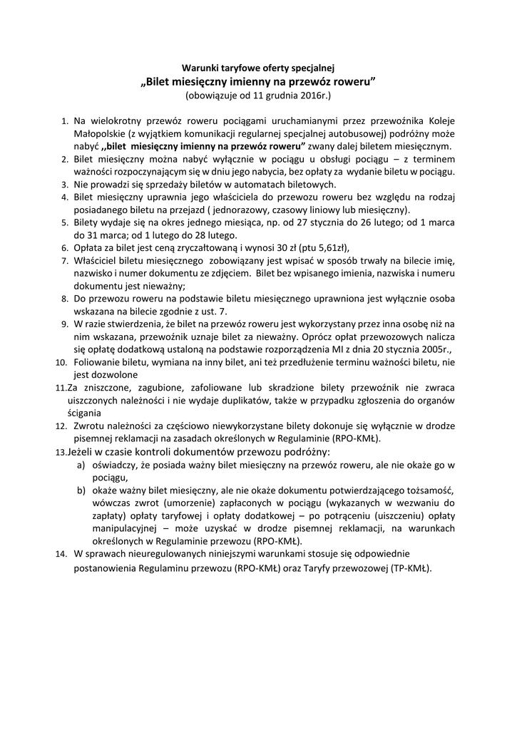Warunki taryfowe oferty specjalnej „Bilet miesięczny imienny na przewóz roweru” (obowiązuje od 11 grudnia 2016r.) 1. Na wielokrotny przewóz roweru pociągami uruchamianymi przez przewoźnika Koleje Małopolskie (z wyjątkiem komunikacji regularnej specjalnej autobusowej) podróżny może nabyć ,,bilet miesięczny imienny na przewóz roweru” zwany dalej biletem miesięcznym. 2. Bilet miesięczny można nabyć wyłącznie w pociągu u obsługi pociągu – z terminem ważności rozpoczynającym się w dniu jego nabycia, bez opłaty za wydanie biletu w pociągu. 3. Nie prowadzi się sprzedaży biletów w automatach biletowych. 4. Bilet miesięczny uprawnia jego właściciela do przewozu roweru bez względu na rodzaj posiadanego biletu na przejazd ( jednorazowy, czasowy liniowy lub miesięczny). 5. Bilety wydaje się na okres jednego miesiąca, np. od 27 stycznia do 26 lutego; od 1 marca do 31 marca; od 1 lutego do 28 lutego. 6. Opłata za bilet jest ceną zryczałtowaną i wynosi 30 zł (ptu 5,61zł), 7. Właściciel biletu miesięcznego zobowiązany jest wpisać w sposób trwały na bilecie imię, nazwisko i numer dokumentu ze zdjęciem. Bilet bez wpisanego imienia, nazwiska i numeru dokumentu jest nieważny; 8. Do przewozu roweru na podstawie biletu miesięcznego uprawniona jest wyłącznie osoba wskazana na bilecie zgodnie z ust. 7. 9. W razie stwierdzenia, że bilet na przewóz roweru jest wykorzystany przez inna osobę niż na nim wskazana, przewoźnik uznaje bilet za nieważny. Oprócz opłat przewozowych nalicza się opłatę dodatkową ustaloną na podstawie rozporządzenia MI z dnia 20 stycznia 2005r., 10. Foliowanie biletu, wymiana na inny bilet, ani też przedłużenie terminu ważności biletu, nie jest dozwolone 11.Za zniszczone, zagubione, zafoliowane lub skradzione bilety przewoźnik nie zwraca uiszczonych należności i nie wydaje duplikatów, także w przypadku zgłoszenia do organów ścigania 12. Zwrotu należności za częściowo niewykorzystane bilety dokonuje się wyłącznie w drodze pisemnej reklamacji na zasadach określonych w Regulaminie (RPO-KMŁ). 13.Jeżeli w czasie kontroli dokumentów przewozu podróżny: a) oświadczy, że posiada ważny bilet miesięczny na przewóz roweru, ale nie okaże go w pociągu, b) okaże ważny bilet miesięczny, ale nie okaże dokumentu potwierdzającego tożsamość, wówczas zwrot (umorzenie) zapłaconych w pociągu (wykazanych w wezwaniu do zapłaty) opłaty taryfowej i opłaty dodatkowej – po potrąceniu (uiszczeniu) opłaty manipulacyjnej – może uzyskać w drodze pisemnej reklamacji, na warunkach określonych w Regulaminie przewozu (RPO-KMŁ). 14. W sprawach nieuregulowanych niniejszymi warunkami stosuje się odpowiednie postanowienia Regulaminu przewozu (RPO-KMŁ) oraz Taryfy przewozowej (TP-KMŁ).