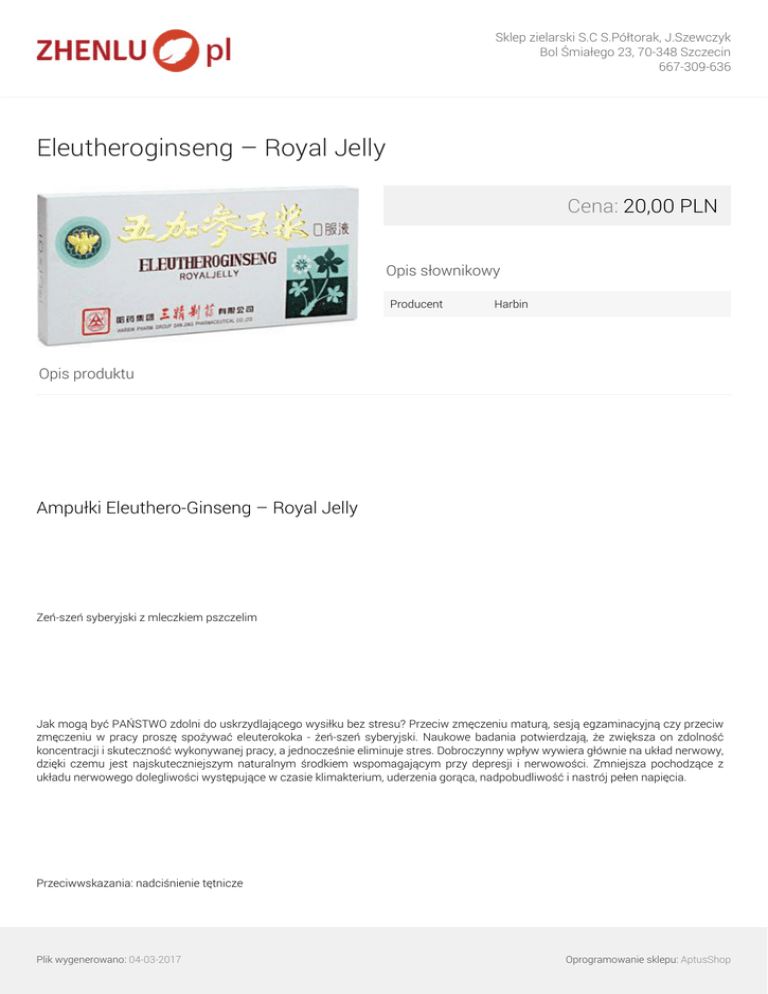 Sklep zielarski S.C S.Półtorak, J.Szewczyk Bol Śmiałego 23, 70-348 Szczecin 667-309-636 Eleutheroginseng – Royal Jelly Cena: 20,00 PLN Opis słownikowy Producent Harbin Opis produktu Ampułki Eleuthero-Ginseng – Royal Jelly Zeń-szeń syberyjski z mleczkiem pszczelim Jak mogą być PAŃSTWO zdolni do uskrzydlającego wysiłku bez stresu? Przeciw zmęczeniu maturą, sesją egzaminacyjną czy przeciw zmęczeniu w pracy proszę spożywać eleuterokoka - żeń-szeń syberyjski. Naukowe badania potwierdzają, że zwiększa on zdolność koncentracji i skuteczność wykonywanej pracy, a jednocześnie eliminuje stres. Dobroczynny wpływ wywiera głównie na układ nerwowy, dzięki czemu jest najskuteczniejszym naturalnym środkiem wspomagającym przy depresji i nerwowości. Zmniejsza pochodzące z układu nerwowego dolegliwości występujące w czasie klimakterium, uderzenia gorąca, nadpobudliwość i nastrój pełen napięcia. Przeciwwskazania: nadciśnienie tętnicze Plik wygenerowano: 04-03-2017 Oprogramowanie sklepu: AptusShop Sklep zielarski S.C S.Półtorak, J.Szewczyk Bol Śmiałego 23, 70-348 Szczecin 667-309-636 Skład preparatu: źeńszeń syberyjski, mleczko pszczele, woda Sposób użycia: 1 ampułka 2 razy dziennie Opakowanie: 10 ampułek po 10ml Cena za 1 litr: 200zł Treści zawarte w opisie produktu nie są podawane w celach reklamowych, są wyłącznie przytoczeniem informacji i wiedzy pochodzącej z badań i doświadczeń stosowanych w wielu innych krajach. Produkt posiada wymagane w Polsce zezwolenie GIS #℣佐⌡⌀䜁䈀眀渀攀最漀 䤀渀猀瀀攀欀琀漀爀愀 匀愀渀椀琀愀爀渀攀最漀⌡⍃倣℣ - w przypadku dietetycznych środków spożywczych, lub zezwolenia PZH (Państwowego Zakładu Higieny) - w przypadku kosmetyków. Wszystkie preparaty w naszym sklepie to suplementy diety. Nie należy przekraczać zalecanej porcji do spożycia w ciągu dnia. Suplementy diety powinny być przechowywane w sposób niedostępny dla małych dzieci. Suplementy diety nie mogą być stosowane jako substytut #℣佐⌡⌀稀愀洀椀攀渀渀椀欀⌡⍃倣℣ zróżnicowanej diety. Żadne oświadczenie, stwierdzenie, opinia lub informacja odnosząca się do któregokolwiek produktu nie stanowią i nie powinny być rozumiane jako porada medyczna. Plik wygenerowano: 04-03-2017 Powered by TCPDF (www.tcpdf.org) Oprogramowanie sklepu: AptusShop