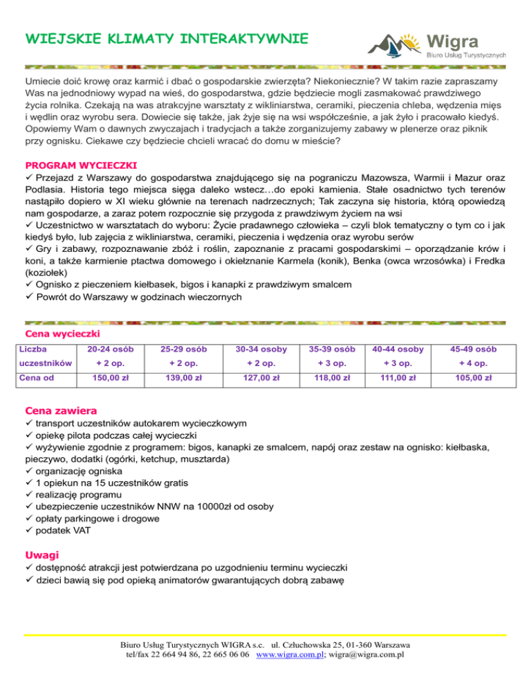 WIEJSKIE KLIMATY INTERAKTYWNIE Umiecie doić krowę oraz karmić i dbać o gospodarskie zwierzęta? Niekoniecznie? W takim razie zapraszamy Was na jednodniowy wypad na wieś, do gospodarstwa, gdzie będziecie mogli zasmakować prawdziwego życia rolnika. Czekają na was atrakcyjne warsztaty z wikliniarstwa, ceramiki, pieczenia chleba, wędzenia mięs i wędlin oraz wyrobu sera. Dowiecie się także, jak żyje się na wsi współcześnie, a jak żyło i pracowało kiedyś. Opowiemy Wam o dawnych zwyczajach i tradycjach a także zorganizujemy zabawy w plenerze oraz piknik przy ognisku. Ciekawe czy będziecie chcieli wracać do domu w mieście? PROGRAM WYCIECZKI Przejazd z Warszawy do gospodarstwa znajdującego się na pograniczu Mazowsza, Warmii i Mazur oraz Podlasia. Historia tego miejsca sięga daleko wstecz…do epoki kamienia. Stałe osadnictwo tych terenów nastąpiło dopiero w XI wieku głównie na terenach nadrzecznych; Tak zaczyna się historia, którą opowiedzą nam gospodarze, a zaraz potem rozpocznie się przygoda z prawdziwym życiem na wsi Uczestnictwo w warsztatach do wyboru: Życie pradawnego człowieka – czyli blok tematyczny o tym co i jak kiedyś było, lub zajęcia z wikliniarstwa, ceramiki, pieczenia i wędzenia oraz wyrobu serów Gry i zabawy, rozpoznawanie zbóż i roślin, zapoznanie z pracami gospodarskimi – oporządzanie krów i koni, a także karmienie ptactwa domowego i okiełznanie Karmela (konik), Benka (owca wrzosówka) i Fredka (koziołek) Ognisko z pieczeniem kiełbasek, bigos i kanapki z prawdziwym smalcem Powrót do Warszawy w godzinach wieczornych Cena wycieczki Liczba uczestników Cena od 20-24 osób 25-29 osób 30-34 osoby 35-39 osób 40-44 osoby 45-49 osób + 2 op. + 2 op. + 2 op. + 3 op. + 3 op. + 4 op. 150,00 zł 139,00 zł 127,00 zł 118,00 zł 111,00 zł 105,00 zł Cena zawiera transport uczestników autokarem wycieczkowym opiekę pilota podczas całej wycieczki wyżywienie zgodnie z programem: bigos, kanapki ze smalcem, napój oraz zestaw na ognisko: kiełbaska, pieczywo, dodatki (ogórki, ketchup, musztarda) organizację ogniska 1 opiekun na 15 uczestników gratis realizację programu ubezpieczenie uczestników NNW na 10000zł od osoby opłaty parkingowe i drogowe podatek VAT Uwagi dostępność atrakcji jest potwierdzana po uzgodnieniu terminu wycieczki dzieci bawią się pod opieką animatorów gwarantujących dobrą zabawę Biuro Usług Turystycznych WIGRA s.c. ul. Człuchowska 25, 01-360 Warszawa tel/fax 22 664 94 86, 22 665 06 06 www.wigra.com.pl; [email protected]
