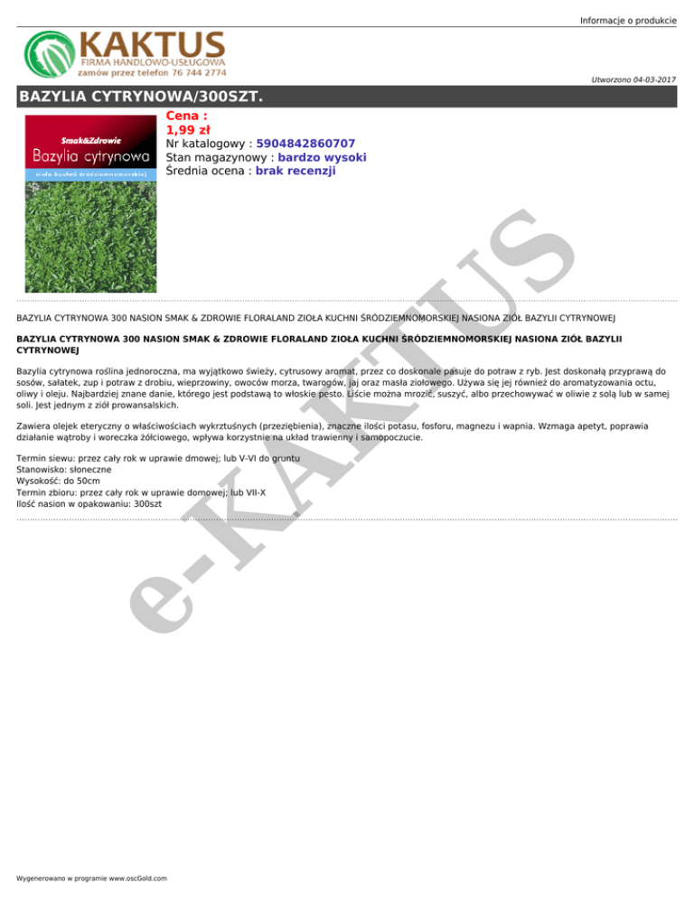 Informacje o produkcie Utworzono 04-03-2017 BAZYLIA CYTRYNOWA/300SZT. Cena : 1,99 zł AK TU S Nr katalogowy : 5904842860707 Stan magazynowy : bardzo wysoki Średnia ocena : brak recenzji BAZYLIA CYTRYNOWA 300 NASION SMAK & ZDROWIE FLORALAND ZIOŁA KUCHNI ŚRÓDZIEMNOMORSKIEJ NASIONA ZIÓŁ BAZYLII CYTRYNOWEJ BAZYLIA CYTRYNOWA 300 NASION SMAK & ZDROWIE FLORALAND ZIOŁA KUCHNI ŚRÓDZIEMNOMORSKIEJ NASIONA ZIÓŁ BAZYLII CYTRYNOWEJ Bazylia cytrynowa roślina jednoroczna, ma wyjątkowo świeży, cytrusowy aromat, przez co doskonale pasuje do potraw z ryb. Jest doskonałą przyprawą do sosów, sałatek, zup i potraw z drobiu, wieprzowiny, owoców morza, twarogów, jaj oraz masła ziołowego. Używa się jej również do aromatyzowania octu, oliwy i oleju. Najbardziej znane danie, którego jest podstawą to włoskie pesto. Liście można mrozić, suszyć, albo przechowywać w oliwie z solą lub w samej soli. Jest jednym z ziół prowansalskich. Zawiera olejek eteryczny o właściwościach wykrztuśnych (przeziębienia), znaczne ilości potasu, fosforu, magnezu i wapnia. Wzmaga apetyt, poprawia działanie wątroby i woreczka żółciowego, wpływa korzystnie na układ trawienny i samopoczucie. eK Termin siewu: przez cały rok w uprawie dmowej; lub V-VI do gruntu Stanowisko: słoneczne Wysokość: do 50cm Termin zbioru: przez cały rok w uprawie domowej; lub VII-X Ilość nasion w opakowaniu: 300szt Wygenerowano w programie www.oscGold.com