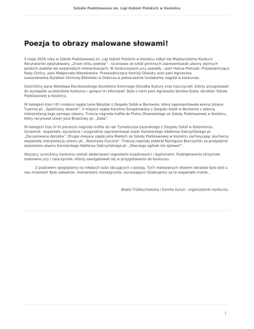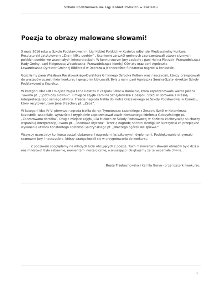 Szkoła Podstawowa im. Ligi Kobiet Polskich w Kozielcu Poezja to obrazy malowane słowami! 5 maja 2016 roku w Szkole Podstawowej im. Ligi Kobiet Polskich w Kozielcu odbył się Międzyszkolny Konkurs Recytatorski zatytułowany „Znam kilku poetów” . Uczniowie ze szkół gminnych zaprezentowali utwory słynnych polskich poetów we wspaniałych interpretacjach. W konkursowym jury zasiadły : pani Halina Pietrzak- Przewodnicząca Rady Gminy, pani Małgorzata Wesołowska- Przewodnicząca Komisji Oświaty oraz pani Agnieszka Lewandowska-Dyrektor Gminnej Biblioteki w Dobrczu-a jednocześnie fundatorka nagród w konkursie. Gościliśmy pana Wiesława Raczkowskiego-Dyrektora Gminnego Ośrodka Kultury oraz nauczycieli, którzy przygotowali do występów uczestników konkursu i gorąco im kibicowali. Była z nami pani Agnieszka Senska-Szala- dyrektor Szkoły Podstawowej w Kozielcu. W kategorii klas I-III I miejsce zajęła Lena Besztak z Zespołu Szkół w Borównie, która zaprezentowała wiersz Juliana Tuwima pt. „Spóźniony słownik”. II miejsce zajęła Karolina Sznajdrowska z Zespołu Szkół w Borównie z własną interpretacją tego samego utworu. Trzecia nagroda trafiła do Piotra Olszewskiego ze Szkoły Podstawowej w Kozielcu, który recytował utwór Jana Brzechwy pt. „Żaba”. W kategorii klas IV-VI pierwsza nagroda trafiła do rąk Tymoteusza Łazarskiego z Zespołu Szkół w Kotomierzu. Uczestnik wspaniale, wyraziście i oryginalnie zaprezentował utwór Konstantego Ildefonsa Gałczyńskiego pt. „Zaczarowana dorożka”. Drugie miejsce zajęła Julia Mieloch ze Szkoły Podstawowej w Kozielcu zachwycając słuchaczy wspaniałą interpretacją utworu pt. „Rozmowa liryczna”. Trzecią nagrodę odebrał Remigiusz Burczyński za przepiękne wykonanie utworu Konstantego Ildefonsa Gałczyńskiego pt. „Dlaczego ogórek nie śpiewa?”. Wszyscy uczestnicy konkursu zostali obdarowani nagrodami książkowymi i dyplomami. Podziękowania otrzymało szanowne jury i nauczyciele, którzy zaangażowali się w przygotowania do konkursu. Z podziwem spoglądamy na młodych ludzi obcujących z poezją. Tych malowanych słowem obrazów było dziś u nas mnóstwo! Było zabawnie, momentami nostalgicznie, wzruszająco! Dziękujemy za te wspaniałe chwile… Beata Trzebuchowska i Kamila Guryn - organizatorki konkursu. 1
