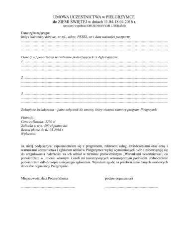 UMOWA UCZESTNICTWA w PIELGRZYMCE do ZIEMI ŚWIĘTEJ w dniach 11.04-18.04.2016 r. (prosimy wypełniać DRUKOWANYMI LITERAMI) Dane zgłaszającego: Imię i Nazwisko, data ur., nr tel., adres, PESEL, nr i data ważności paszportu ....................................................................................................................................................................... ....................................................................................................................................................................... ....................................................................................................................................................................... Dane (j.w.) pozostałych uczestników podróżujących ze Zgłaszającym: 1. ................................................................................................................................................................... ....................................................................................................................................................................... ....................................................................................................................................................................... 2. ................................................................................................................................................................... ....................................................................................................................................................................... ....................................................................................................................................................................... 3. ................................................................................................................................................................... ....................................................................................................................................................................... ....................................................................................................................................................................... Zakupione świadczenia – patrz załącznik do umowy, który stanowi ramowy program Pielgrzymki Płatność: Cena całkowita: 3200 zł Zaliczka w wys. 500 zł płatna do: Reszta płatne do 01.03.2016 r. Wpłacono: Ja, niżej podpisany/a, zapoznałem/am się z programem, zakresem usług, świadczeniami oraz ceną i warunkami uczestnictwa i zgłaszam udział w Pielgrzymce wyżej wymienionych osób i zobowiązuję się do uregulowania należności za ich udział w terminie przewidzianym „Warunkami uczestnictwa”, co potwierdzam w imieniu własnym i osób mi towarzyszących własnoręcznym podpisem. Jednocześnie potwierdzam odbiór kopii niniejszego zgłoszenia. Wyrażam zgodę na przetwarzanie danych osobowych do celów organizacji Pielgrzymki. Miejscowość, data Podpis klienta podpis organizatora …......................................................... …......................................................... WARUNKI UCZESTNICTWA 1. Zawarcie umowy. 1.1. Umowa – Zgłoszenie zostaje zawarta z chwilą podpisania jej przez Klienta i Organizatora. 1.2. Warunkiem dokonania i potwierdzenia rezerwacji świadczeń jest zawarcie Umowy Zgłoszenia oraz wpłata zaliczki (zgodnie z pkt. 2.1). 1.3. Podpisując Umowę – Zgłoszenie Uczestnik potwierdza, iż zapoznał się z Warunkami Uczestnictwa oraz programem Pielgrzymki i oświadcza że je akceptuje. 1.4. Osoba podpisująca Umowę – Zgłoszenie odpowiada za wykonanie przez wszystkich zgłoszonych w Umowie Uczestników Pielgrzymki i przejmuje tym samym odpowiedzialność dotrzymania wszystkich warunków umowy przez tychże uczestników. 1.5. Organizator oświadcza, że przekaże Klientowi informacje o obowiązujących przepisach wizowych, sanitarnych, o wymaganiach zdrowotnych dotyczących udziału w Pielgrzymce oraz zakresie ubezpieczenia następstw nieszczęśliwych wypadków i kosztów leczenia na max 7 dni przed wyjazdem. 1.6. W przypadku Klientów nieposiadających obywatelstwa polskiego ewentualne formalności związane z uzyskaniem odpowiedniej wizy wjazdowej obciążają Klienta. Brak dokumentów upoważniających do wjazdu na teren Państwa, w którym odbywa się Pielgrzymka lub ich nieterminowe złożenie jest równoznaczne z rezygnacją, z uczestnictwa, z przyczyn nie leżących po stronie Organizatora, zastosowanie tutaj mają warunki rezygnacji opisane w pkt. 4.1 - 4.6. 1.7. Podpisując Umowę Zgłoszenie Klient wyraża zgodę na przetwarzanie, uaktualnianie i udostępnianie danych osobowych niezbędnych do realizacji podroży zgodnie z postanowieniami ustawy z dnia 29 sierpnia 1997 r. o ochronie danych osobowych (t.j. Dz. U. 2002 r. Nr 101, poz. 926 ze zm.). 2. Zapłata. 2.1. Przy zawieraniu Umowy Klient dokonuje wpłaty zaliczki na poczet Pielgrzymki w wysokości 30% ustalonej ceny Pielgrzymki. 2.2. Wszelkie należności muszą zostać uiszczone do 35 dnia przed rozpoczęciem Pielgrzymki. 2.3. Organizator może podwyższyć cenę Pielgrzymki jedynie w przypadku udokumentowania wpływu na podniesienie ceny podczas wzrostu kosztów transportu, wzrostu opłat urzędowych, podatków, opłat należnych za takie usługi jak: lotniskowe, załadunkowe lub przeładunkowe w portach morskich lub lotniczych, wzrostu kursów walut. Podwyższenie ceny może nastąpić w terminie nie krótszym niż 21 dni przed rozpoczęciem Pielgrzymki. O zmianie ceny Organizator niezwłocznie poinformuje Klientów. 2.4. Jeżeli cena Pielgrzymki nie zostanie zapłacona w całości na 35 dni przez rozpoczęciem podroży (wyjątek - rezerwacja krotko przed rozpoczęciem Pielgrzymki) Organizator jest uprawniony do odstąpienia od Umowy i może obciążyć Klienta poniesionymi koszta