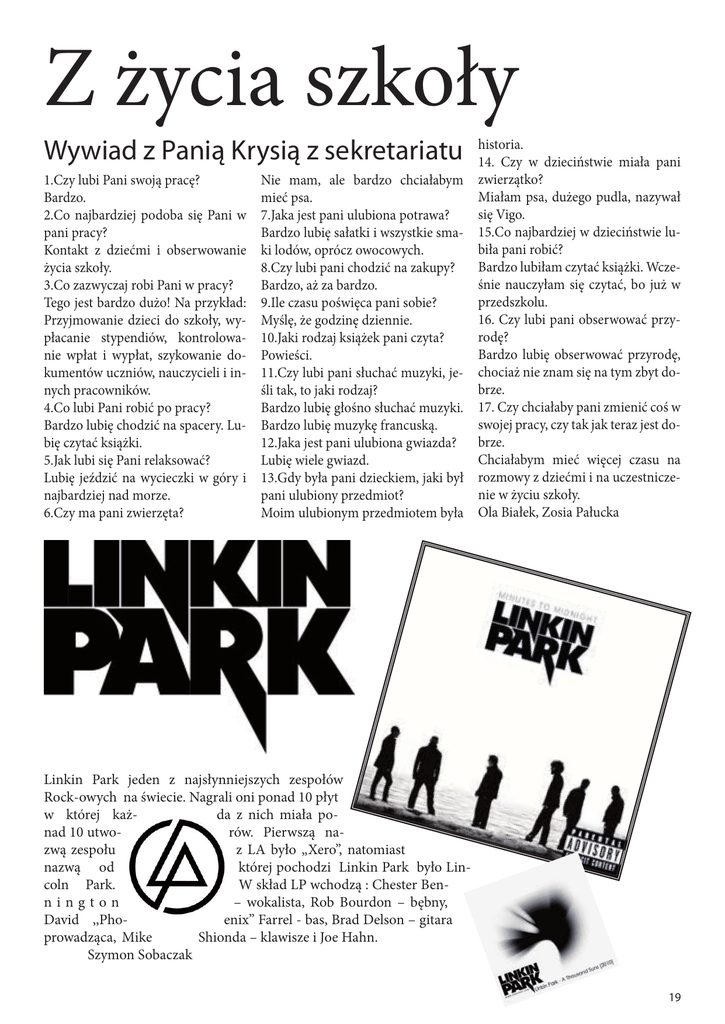 Z życia szkoły Wywiad z Panią Krysią z sekretariatu historia. 14. Czy w dzieciństwie miała pani Nie mam, ale bardzo chciałabym zwierzątko? 1.Czy lubi Pani swoją pracę? Miałam psa, dużego pudla, nazywał mieć psa. Bardzo. się Vigo. 2.Co najbardziej podoba się Pani w 7.Jaka jest pani ulubiona potrawa? Bardzo lubię sałatki i wszystkie sma- 15.Co najbardziej w dzieciństwie lupani pracy? biła pani robić? Kontakt z dziećmi i obserwowanie ki lodów, oprócz owocowych. Bardzo lubiłam czytać książki. Wcze8.Czy lubi pani chodzić na zakupy? życia szkoły. śnie nauczyłam się czytać, bo już w Bardzo, aż za bardzo. 3.Co zazwyczaj robi Pani w pracy? przedszkolu. Tego jest bardzo dużo! Na przykład: 9.Ile czasu poświęca pani sobie? 16. Czy lubi pani obserwować przyPrzyjmowanie dzieci do szkoły, wy- Myślę, że godzinę dziennie. rodę? płacanie stypendiów, kontrolowa- 10.Jaki rodzaj książek pani czyta? Bardzo lubię obserwować przyrodę, nie wpłat i wypłat, szykowanie do- Powieści. kumentów uczniów, nauczycieli i in- 11.Czy lubi pani słuchać muzyki, je- chociaż nie znam się na tym zbyt dobrze. śli tak, to jaki rodzaj? nych pracowników. Bardzo lubię głośno słuchać muzyki. 17. Czy chciałaby pani zmienić coś w 4.Co lubi Pani robić po pracy? swojej pracy, czy tak jak teraz jest doBardzo lubię chodzić na spacery. Lu- Bardzo lubię muzykę francuską. 12.Jaka jest pani ulubiona gwiazda? brze. bię czytać książki. Chciałabym mieć więcej czasu na Lubię wiele gwiazd. 5.Jak lubi się Pani relaksować? Lubię jeździć na wycieczki w góry i 13.Gdy była pani dzieckiem, jaki był rozmowy z dziećmi i na uczestniczenie w życiu szkoły. pani ulubiony przedmiot? najbardziej nad morze. Moim ulubionym przedmiotem była Ola Białek, Zosia Pałucka 6.Czy ma pani zwierzęta? Linkin Park jeden z najsłynniejszych zespołów Rock-owych na świecie. Nagrali oni ponad 10 płyt w której każda z nich miała ponad 10 utworów. Pierwszą nazwą zespołu z LA było „Xero”, natomiast nazwą od której pochodzi Linkin Park było Lincoln Park. W skład LP wchodzą : Chester Bennington – wokalista, Rob Bourdon – bębny, David ,,Phoenix’’ Farrel - bas, Brad Delson – gitara prowadząca, Mike Shionda – klawisze i Joe Hahn. Szymon Sobaczak 19