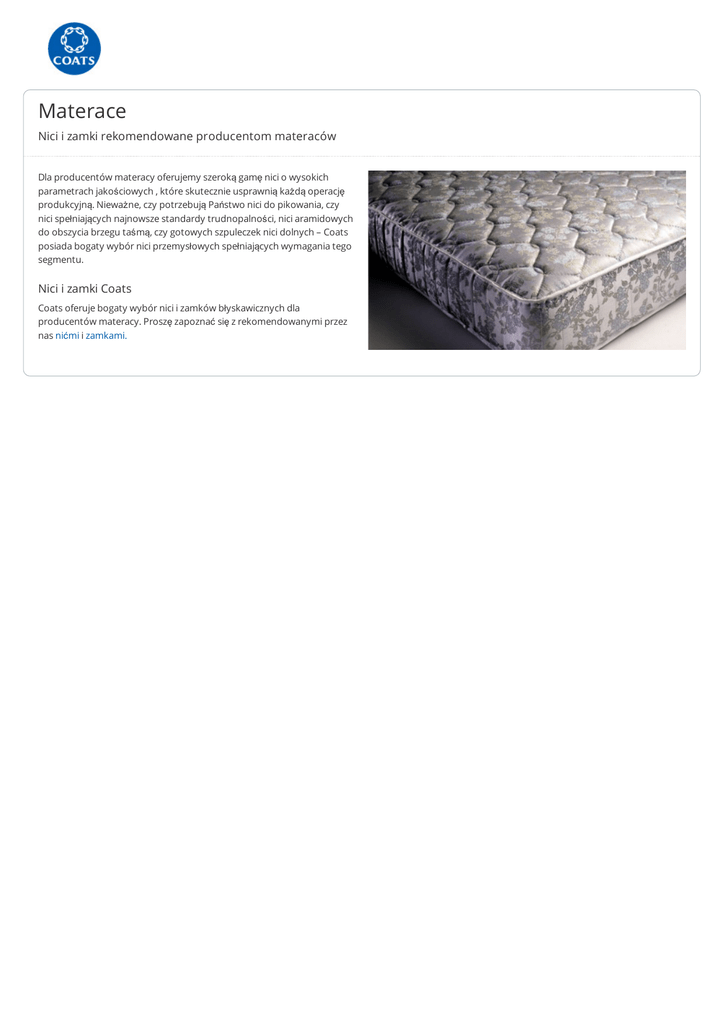 Materace Nici i zamki rekomendowane producentom materaców Dla producentów materacy oferujemy szeroką gamę nici o wysokich parametrach jakościowych , które skutecznie usprawnią każdą operację produkcyjną. Nieważne, czy potrzebują Państwo nici do pikowania, czy nici spełniających najnowsze standardy trudnopalności, nici aramidowych do obszycia brzegu taśmą, czy gotowych szpuleczek nici dolnych – Coats posiada bogaty wybór nici przemysłowych spełniających wymagania tego segmentu. Nici i zamki Coats Coats oferuje bogaty wybór nici i zamków błyskawicznych dla producentów materacy. Proszę zapoznać się z rekomendowanymi przez nas nićmi i zamkami. Numer ściegu 1 504 2 301 Rodzaj ściegu Produkt Łączenie kołnierza Ultimax lub Epic lamówki do lub Dual Duty pikówki (504 or 401) Stębnowanie rozpórki zagłówka Więcej Ultimax lub Epic lub Dual Duty Więcej Danfield lub Gral Więcej Ultimax lub Epic lub Dual Duty Więcej Doszycie uchwytu (301) Epic lub Star Więcej Obszycie Protos lub Protos Fil lub Epic lub Kieszenie na 3 4 401x2 401 sprężyny materaca (401x2) Przyszycie przodu buta (fartucha) do noska (301) 5 6 301 401 brzegu taśmą (401) Dual Duty lub Star Więcej Premium Nici przemysłowe Coats dostępne są w szerokiej gamie rodzajów włókien i wykończeń, z których każdy opracowany jest pod kątem konkretnych potrzeb naszych klientów. Zapraszamy do zapoznania się z naszą bogatą ofertą poniżej. W przypadku dostępności innych opcji, proszę wybrać odpowiednią opcję z listy. Wygląd szwu Rodzaj ściegu Numer ściegu Górna nitka Dolna nitka Produkt Tex Tkt Produkt Tex Tkt 1 Łączenie kołnierza lamówki do pikówki (504 or 401) 504 Ultimax lub Epic lub Dual Duty 60 lub 40 lub 40 50 lub 80 lub 75 Ultimax lub Epic lub Dual Duty 60 lub 40 lub 40 50 lub 80 lub 75 2 Stębnowanie rozpórki zagłówka 301 Ultimax lub Epic lub Dual Duty 40 lub 40 lub 40 80 lub 80 lub 75 Nymo lub Epic lub Dual Duty 40 lub 40 4 lub 5 lub 80 lub 75 401x2 Danfield lub Gral 50 lub 35 lub 40 60 lub 80 Danfield lub Gramax 35 90 401 Ultimax lub Epic lub Dual Duty 60 lub 60 lub 45 50 lub 50 lub 60 Ultimax lub Epic lub Dual Duty 60 lub 60 lub 45 50 lub 50 lub 60 301 Epic lub Star 80 lub 45 40 lub 60 Epic lub Star 80 lub 45 40 lub 60 401 Protos lub Protos Fil lub Epic lub Dual Duty lub Star 40 lub 50 lub 45 lub 105 lub 120 lub 80 lub 70 lub 45 75 lub 60 lub 70 lub 30 lub 25 lub 36 lub 40 lub 60 Protos lub Protos Fil lub Epic lub Dual Duty lub Star 40 lub 50 lub 45 lub 105 lub 120 lub 80 lub 70 lub 45 75 lub 60 lub 70 lub 30 lub 25 lub 36 lub 40 lub 60 Kieszenie na sprężyny materaca (401x2) Przyszycie przodu buta (fartucha) do noska (301) 3 4 5 Doszycie uchwytu (301) 6 Obszycie brzegu taśmą (401) Key: Nierozdzielczy = Nierozdzielczy; Rozdzielczy = Rozdzielczy; Dwustronnie rozdzielczy = Dwustronnie rozdzielczy; Dwustronnie nierozdzielczy = Dwustronnie nierozdzielczy; X-Forma / O-Forma Opti P Zastosowanie Opti RT Opcje specjalne Otwór/Wlot/Zapięcie Opti S Opcje specjalne Opcje specjalne P60 CE Wymienny RT10 OE Reversed, Metalizowana, Lurex, Z nadrukiem S80 CC FlameMaster, Jumbo P60 CC Wymienny RT10 CC Reversed, Metalizowana, Lurex, Z nadrukiem S80 OE FlameMaster, Jumbo S60 OE Reversed, Wymienny, Z nadrukiem, Znaczenia, FlameMaster, Jumbo - - - - - - - - S60 CC Reversed, Wymienny, Z nadrukiem, Znaczenia, FlameMaster, Jumbo - - - - S40 CC Reversed, Jumbo Suwaki Możemy wykonać indywidualną przywieszkę z logo twojej firmy. Bag Non-lock S40 NEVRESIM NFG bw Fulda Drop Non-lock Bulle Non-lock Body Non-lock Opcje specjalne Ponieważ rodzaje produktów i warunki zastosowania nici znacznie się między sobą różnią, Coats ani jego poszczególne oddziały nie mogą zagwarantować jednolitych rezultatów. Niniejsze zalecenia udzielone są w dobrej wierze, jednak bez gwarancji i odpowiedzialności ze strony firmy lub jej pracowników. Nie możemy zagwarantować, że produkt jest odpowiedni do określonego zastosowania. Klienci zawsze powinni przeprowadzić własne testy. W przypadku wątpliwości prosimy o odwołanie się do warunków użytkowania serwisu.