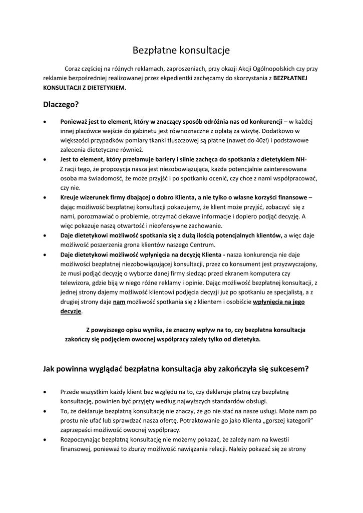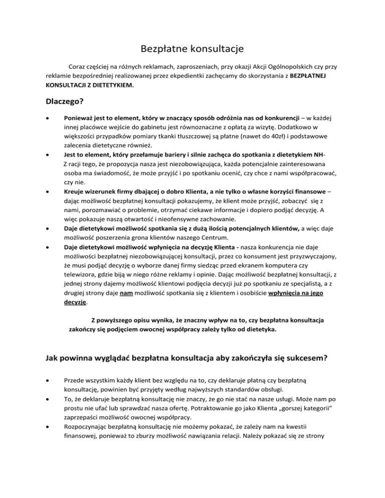 Bezpłatne konsultacje Coraz częściej na różnych reklamach, zaproszeniach, przy okazji Akcji Ogólnopolskich czy przy reklamie bezpośredniej realizowanej przez ekpedientki zachęcamy do skorzystania z BEZPŁATNEJ KONSULTACJI Z DIETETYKIEM. Dlaczego? Ponieważ jest to element, który w znaczący sposób odróżnia nas od konkurencji – w każdej innej placówce wejście do gabinetu jest równoznaczne z opłatą za wizytę. Dodatkowo w większości przypadków pomiary tkanki tłuszczowej są płatne (nawet do 40zł) i podstawowe zalecenia dietetyczne również. Jest to element, który przełamuje bariery i silnie zachęca do spotkania z dietetykiem NHZ racji tego, że propozycja nasza jest niezobowiązująca, każda potencjalnie zainteresowana osoba ma świadomość, że może przyjść i po spotkaniu ocenić, czy chce z nami współpracować, czy nie. Kreuje wizerunek firmy dbającej o dobro Klienta, a nie tylko o własne korzyści finansowe – dając możliwość bezpłatnej konsultacji pokazujemy, że klient może przyjść, zobaczyć się z nami, porozmawiać o problemie, otrzymać ciekawe informacje i dopiero podjąć decyzję. A więc pokazuje naszą otwartość i nieofensywne zachowanie. Daje dietetykowi możliwość spotkania się z dużą ilością potencjalnych klientów, a więc daje możliwość poszerzenia grona klientów naszego Centrum. Daje dietetykowi możliwość wpłynięcia na decyzję Klienta - nasza konkurencja nie daje możliwości bezpłatnej niezobowiązującej konsultacji, przez co konsument jest przyzwyczajony, że musi podjąć decyzję o wyborze danej firmy siedząc przed ekranem komputera czy telewizora, gdzie biją w niego różne reklamy i opinie. Dając możliwość bezpłatnej konsultacji, z jednej strony dajemy możliwość klientowi podjęcia decyzji już po spotkaniu ze specjalistą, a z drugiej strony daje nam możliwość spotkania się z klientem i osobiście wpłynięcia na jego decyzję. Z powyższego opisu wynika, że znaczny wpływ na to, czy bezpłatna konsultacja zakończy się podjęciem owocnej współpracy zależy tylko od dietetyka. Jak powinna wyglądać bezpłatna konsultacja aby zakończyła się sukcesem? Przede wszystkim każdy klient bez względu na to, czy deklaruje płatną czy bezpłatną konsultację, powinien być przyjęty według najwyższych standardów obsługi. To, że deklaruje bezpłatną konsultację nie znaczy, że go nie stać na nasze usługi. Może nam po prostu nie ufać lub sprawdzać nasza ofertę. Potraktowanie go jako Klienta „gorszej kategorii” zaprzepaści możliwość owocnej współpracy. Rozpoczynając bezpłatną konsultację nie możemy pokazać, że zależy nam na kwestii finansowej, ponieważ to zburzy możliwość nawiązania relacji. Należy pokazać się ze strony specjalisty, który najbardziej interesuje się daną osobą i jej problemem. W taki sposób zdobędziemy zaufanie Klienta i jego przychylne nastawienie. Konsultacja krok po kroku 1. Uśmiech i przywitanie Klienta. 2. Zapewnienie mu komfortowych warunków: wskazanie gdzie może pozostawić odzienie wierzchnie, zaproponowanie czegoś do picia. 3. Przeprowadzenie krótkiego wywiadu, który otworzy relację z klientem i pozwoli nam odkryć jego problem i potrzeby. Przykładowe pytania: W czym mogę Pani pomóc? Jeżeli jest Pani zainteresowana konsultacją i pomiarami to rozumiem, że chciałaby Pani coś zmienić pod względem diety i żywienia? Czy obecna waga Pani przeszkadza? Czy są inne rzeczy, na których Pani zależy, które chciałaby Pani zmienić? Czy odchudzała się Pani wcześniej? Jakimi sposobami? Czy udawało się uzyskać jakieś rezultaty? Co Pani nie odpowiadało w tych metodach? Jak Pani myśli, gdzie tkwi powód niepowodzeń? Itp. 4. Przedstawienie jak wygląda u nas odchudzanie i jak my możemy pomóc. Przedstawiając ofertę zaczynamy od tego, na czym Klientowi najbardziej zależy, co w kontekście jego potrzeb jest najcenniejszego w naszej ofercie. 5. Zaproponowanie pomiarów, którymi klient jest prawdopodobnie najbardziej zainteresowany. Klient ma sie rozebrać zostać zmierzony, zważony, określony typ budowy, dokonana analiza składu ciała. 6. Omówienie wyników. Wskazanie na kartach BMI, w którym przedziale klient się znajduje, wskazanie prawidłowej wagi oraz omówienie ile musiałby schudnąć aby jego waga była w przedziale prawidłowej wagi oraz ile go dzieli od wyższego progu zaawansowania problemu. 7. Propozycja pomocy w osiągnięciu celu. Proszę pamiętać, że celem nie zawsze musi być utrata wagi. Celem może być: nauka zdrowego sposobu odżywiania, wygładzenie cellulitu, wyeliminowanie zaparć i wzdęć, utrata centymetrów itp. 8. Informacja o cenie. Przedstawiamy cenę standardową: ok. 100zł tygodniowo, jeżeli widzimy rezygnacje klienta, należy dopytać co jest przeszkodą i jeżeli jest to cena zaproponować tańszą kurację. 9. Jeżeli Klient się decyduje to kontynuujemy wizytę, jeżeli nie to dajemy materiały informacyjne: karty do akcji, wskazania na lodówkę, książeczki, przepis i polecamy PesoPerfecto! Od początku do końca konsultacji, Klient ma być profesjonalnie obsłużony i pożegnany uśmiechem. Jeżeli się nie zdecydował, zawsze może przekazać swoje pozytywne wrażenia innym, w przeciwnym razie swoje zdegustowanie czy rozczarowanie prawdopodobnie przekaże różnymi kanałami: w rozmowie, na portalach społecznościowych, forach itp.