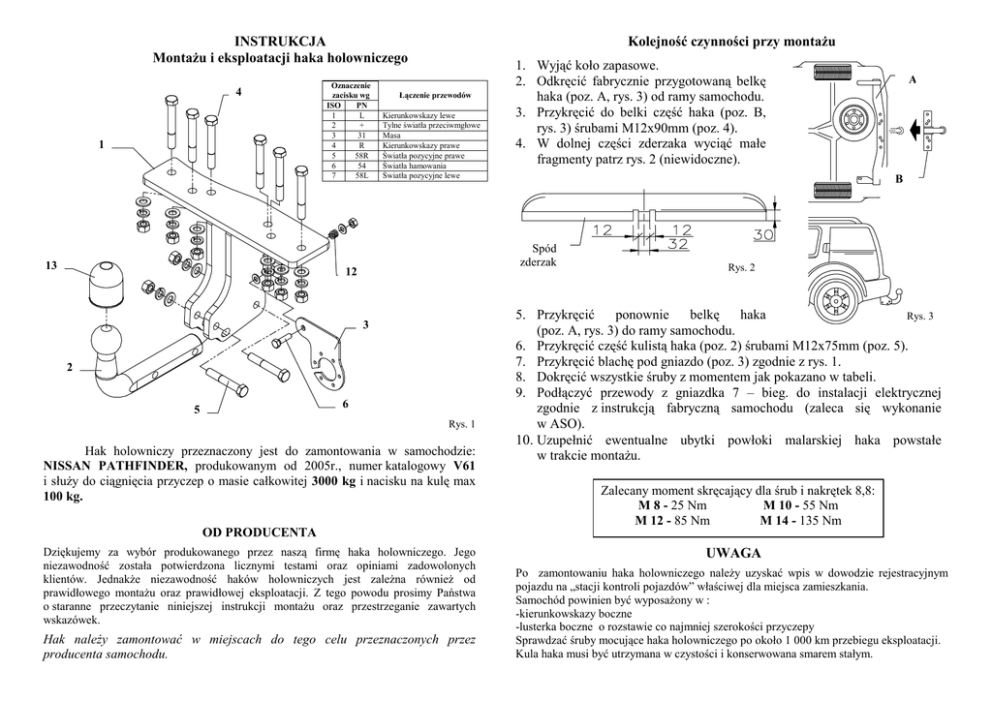 INSTRUKCJA MontaŜu i eksploatacji haka holowniczego 4 1 13 Oznaczenie zacisku wg ISO PN 1 L 2 + 3 31 4 R 5 58R 6 54 7 58L Kolejność czynności przy montaŜu Łączenie przewodów Kierunkowskazy lewe Tylne światła przeciwmgłowe Masa Kierunkowskazy prawe Światła pozycyjne prawe Światła hamowania Światła pozycyjne lewe 3 2 6 Rys. 1 Hak holowniczy przeznaczony jest do zamontowania w samochodzie: NISSAN PATHFINDER, produkowanym od 2005r., numer katalogowy V61 i słuŜy do ciągnięcia przyczep o masie całkowitej 3000 kg i nacisku na kulę max 100 kg. A B Spód zderzak a 12 5 1. Wyjąć koło zapasowe. 2. Odkręcić fabrycznie przygotowaną belkę haka (poz. A, rys. 3) od ramy samochodu. 3. Przykręcić do belki część haka (poz. B, rys. 3) śrubami M12x90mm (poz. 4). 4. W dolnej części zderzaka wyciąć małe fragmenty patrz rys. 2 (niewidoczne). Rys. 2 5. Przykręcić ponownie belkę haka Rys. 3 (poz. A, rys. 3) do ramy samochodu. 6. Przykręcić część kulistą haka (poz. 2) śrubami M12x75mm (poz. 5). 7. Przykręcić blachę pod gniazdo (poz. 3) zgodnie z rys. 1. 8. Dokręcić wszystkie śruby z momentem jak pokazano w tabeli. 9. Podłączyć przewody z gniazdka 7 – bieg. do instalacji elektrycznej zgodnie z instrukcją fabryczną samochodu (zaleca się wykonanie w ASO). 10. Uzupełnić ewentualne ubytki powłoki malarskiej haka powstałe w trakcie montaŜu. Zalecany moment skręcający dla śrub i nakrętek 8,8: M 8 - 25 Nm M 10 - 55 Nm M 12 - 85 Nm M 14 - 135 Nm OD PRODUCENTA Dziękujemy za wybór produkowanego przez naszą firmę haka holowniczego. Jego niezawodność została potwierdzona licznymi testami oraz opiniami zadowolonych klientów. JednakŜe niezawodność haków holowniczych jest zaleŜna równieŜ od prawidłowego montaŜu oraz prawidłowej eksploatacji. Z tego powodu prosimy Państwa o staranne przeczytanie niniejszej instrukcji montaŜu oraz przestrzeganie zawartych wskazówek. Hak naleŜy zamontować w miejscach do tego celu przeznaczonych przez producenta samochodu. UWAGA Po zamontowaniu haka holowniczego naleŜy uzyskać wpis w dowodzie rejestracyjnym pojazdu na „stacji kontroli pojazdów” właściwej dla miejsca zamieszkania. Samochód powinien być wyposaŜony w : -kierunkowskazy boczne -lusterka boczne o rozstawie co najmniej szerokości przyczepy Sprawdzać śruby mocujące haka holowniczego po około 1 000 km przebiegu eksploatacji. Kula haka musi być utrzymana w czystości i konserwowana smarem stałym. PPUH AUTO-HAK S.J. WyposaŜenie haka: Produkcja Haków Holowniczych Henryk & Zbigniew Nejman 76-200 SŁUPSK ul. Słoneczna 16K tel/fax (059) 8-414-414; 8-414-413 E-mail: [email protected] www. autohak.com.pl Hak holowniczy bez wyposaŜenia elektrycznego Klasa: A50-X Nr kat. V61 Przeznaczony do zamontowania w samochodzie: Producent: NISSAN Model: PATHFINDER produkowanym od 2005r. Dane techniczne: Wartość siły D: 14,41 kN maksymalna masa przyczepy: 3000 kg maksymalny nacisk na kulę: 100 kg Numer homologacji zgodnie z wytycznymi regulaminu EKG/ONZ 55.01: E20-55R-01 1741 KARTA GWARANCYJNA Producent udziela gwarancji niniejszą kartą gwarancyjną na okres 24 miesięcy licząc od dnia zakupu haka holowniczego do samochodu: INFORMACJA WSTĘPNA NISSAN PATHFINDER produkowanego od 2005r. Data produkcji .............................. Data zakupu............................................. Zakres gwarancji obejmuje wyłącznie wady jakościowe wynikające z winy producenta. Gwarancja nie obejmuje natomiast uszkodzeń zawinionych przez nabywcę, wynikających z niewłaściwego montaŜu, uŜytkowania lub konserwacji, uszkodzeń mechanicznych, normalnego zuŜycia podczas eksploatacji itp. Gwarancja udzielona na zakupiony towar nie wyłącza, nie ogranicza ani nie zawiesza uprawnień kupującego wynikających z niezgodności towaru z umową. Reklamacje naleŜy zgłaszać w punkcie sprzedaŜy, składając jednocześnie kartę gwarancyjną. Usunięcie "wady" następuje po stwierdzeniu przez punkt sprzedaŜy wspólnie z producentem słuszności złoŜonej reklamacji. Reklamacja powinna być załatwiona w ciągu 14 dni od dnia uznania reklamacji. Karta gwarancyjna jest niewaŜna jeŜeli nie jest wypełniona i podpisana. Data zgłoszenia reklamacji: ................................................................... Hak holowniczy jest skonstruowany zgodnie z zasadami bezpieczeństwa ruchu drogowego. Hak holowniczy jest elementem wpływającym na bezpieczeństwo jazdy i moŜe zostać zainstalowany wyłącznie przez personel wyspecjalizowany. Niedopuszczalne jest dokonywanie jakichkolwiek zmian w konstrukcji haka. Powoduje to wygaśniecie dopuszczenia do stosowania. W przypadku obecności masy izolacyjnej lub osłony podwozia w miejscu przylegania haka, naleŜy ją usunąć. Nieosłonięte miejsca karoserii oraz wywiercone otwory naleŜy pomalować farbą antykorozyjną. Informacjami wiąŜącymi odnośnie wartości obciąŜeń są dane podawane przez producenta samochodu, względnie wartości maksymalnej masy przyczepy oraz maksymalnego nacisku na kulę, przy czym wartości parametrów haka holowniczego nie mogą być przekroczone. Wzór do obliczania wartości siły D: Maks. masa przyczepy [kg] x Maks. masa samochodu [kg] Maks. masa przyczepy [kg] + Maks. masa samochodu [kg] X 9,81 = 1000 D [kN]