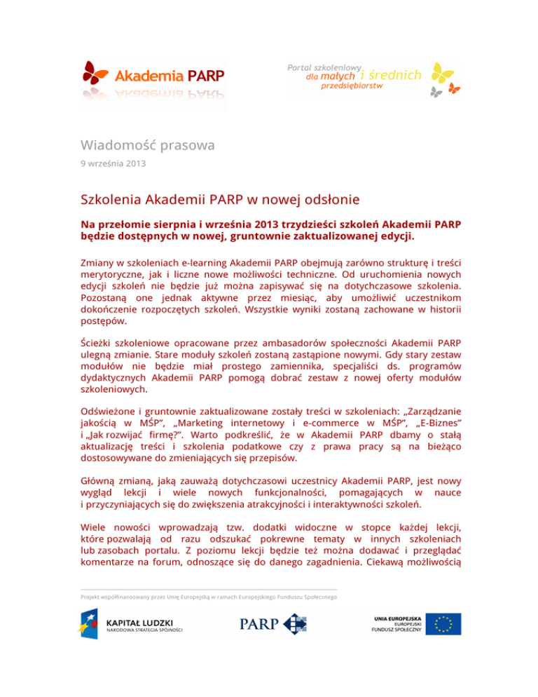 Wiadomość prasowa 9 września 2013 Szkolenia Akademii PARP w nowej odsłonie Na przełomie sierpnia i września 2013 trzydzieści szkoleń Akademii PARP będzie dostępnych w nowej, gruntownie zaktualizowanej edycji. Zmiany w szkoleniach e-learning Akademii PARP obejmują zarówno strukturę i treści merytoryczne, jak i liczne nowe możliwości techniczne. Od uruchomienia nowych edycji szkoleń nie będzie już można zapisywać się na dotychczasowe szkolenia. Pozostaną one jednak aktywne przez miesiąc, aby umożliwić uczestnikom dokończenie rozpoczętych szkoleń. Wszystkie wyniki zostaną zachowane w historii postępów. Ścieżki szkoleniowe opracowane przez ambasadorów społeczności Akademii PARP ulegną zmianie. Stare moduły szkoleń zostaną zastąpione nowymi. Gdy stary zestaw modułów nie będzie miał prostego zamiennika, specjaliści ds. programów dydaktycznych Akademii PARP pomogą dobrać zestaw z nowej oferty modułów szkoleniowych. Odświeżone i gruntownie zaktualizowane zostały treści w szkoleniach: „Zarządzanie jakością w MŚP”, „Marketing internetowy i e-commerce w MŚP”, „E-Biznes” i „Jak rozwijać firmę?”. Warto podkreślić, że w Akademii PARP dbamy o stałą aktualizację treści i szkolenia podatkowe czy z prawa pracy są na bieżąco dostosowywane do zmieniających się przepisów. Główną zmianą, jaką zauważą dotychczasowi uczestnicy Akademii PARP, jest nowy wygląd lekcji i wiele nowych funkcjonalności, pomagających w nauce i przyczyniających się do zwiększenia atrakcyjności i interaktywności szkoleń. Wiele nowości wprowadzają tzw. dodatki widoczne w stopce każdej lekcji, które pozwalają od razu odszukać pokrewne tematy w innych szkoleniach lub zasobach portalu. Z poziomu lekcji będzie też można dodawać i przeglądać komentarze na forum, odnoszące się do danego zagadnienia. Ciekawą możliwością Projekt współfinansowany przez Unię Europejską w ramach Europejskiego Funduszu Społecznego kontaktu z innymi uczestnikami będzie opcja czatu z osobami, które właśnie korzystają z tej samej lekcji. Wychodząc z lekcji, uczestnik będzie mógł pozostawić swoją opinię za pomocą ankiety satysfakcji. Kilka miesięcy temu portal Akademii PARP zmienił się, m. in. dostosowując się do potrzeb osób niepełnosprawnych. Teraz również aktualizowane lekcje szkoleń staną się bardziej przyjazne dla osób niedowidzących. We wrześniu niezmienione pozostaną tylko cztery szkolenia Akademii PARP: „Biznesplan”, „Profesjonalny sekretariat”, „Ekologiczny biznes” oraz „Umiejętności interpersonalne”. W tych szkoleniach pojawią się dodatkowe niespodzianki, ale o tym będzie można dowiedzieć się w przyszłym roku. Dzięki Akademii PARP polskie przedsiębiorstwa mogą sobie pozwolić na szkolenia e-learning, które operują przykładami z praktyki biznesowej i są dostosowane do realiów gospodarczych w Polsce. Na portalu szkoleniowym pod adresem www.akademiaparp.gov.pl znajduje się 35 bezpłatnych szkoleń e-learning. Ukończenie szkolenia promowane jest certyfikatem. Projekt jest realizowany na zlecenie Polskiej Agencji Rozwoju Przedsiębiorczości i współfinansowany ze środków UE w ramach Europejskiego Funduszu Społecznego. kontakt: [email protected] Infolinia 0-801 444 MSP (czyli 0-801 444 677) Projekt współfinansowany przez Unię Europejską w ramach Europejskiego Funduszu Społecznego