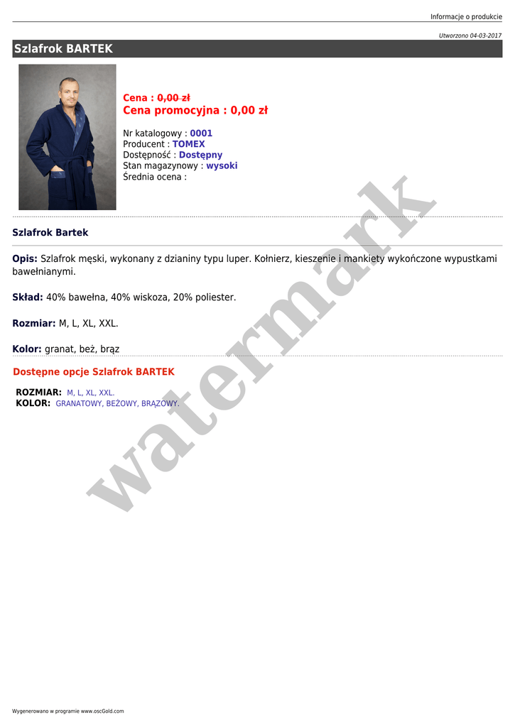 Informacje o produkcie Utworzono 04-03-2017 Szlafrok BARTEK Cena : 0,00 zł Cena promocyjna : 0,00 zł Szlafrok Bartek er m ar k Nr katalogowy : 0001 Producent : TOMEX Dostępność : Dostępny Stan magazynowy : wysoki Średnia ocena : Opis: Szlafrok męski, wykonany z dzianiny typu luper. Kołnierz, kieszenie i mankiety wykończone wypustkami bawełnianymi. Skład: 40% bawełna, 40% wiskoza, 20% poliester. Rozmiar: M, L, XL, XXL. Kolor: granat, beż, brąz Dostępne opcje Szlafrok BARTEK w at ROZMIAR: M, L, XL, XXL. KOLOR: GRANATOWY, BEŻOWY, BRĄZOWY. Wygenerowano w programie www.oscGold.com