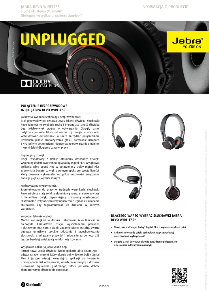 Jabra REVO WIRELESS INFORMACJA O PRODUKCIE Słuchawki stereo Bluetooth® Obsługują wszystkie urządzenia Bluetooth UNPLUGGED Całkowita swoboda technologii bezprzewodowej. Brak przewodów nie oznacza utraty jakości dźwięku. Słuchawki Revo Wireless to swoboda ruchu i imponująca jakość dźwięku bez jakichkolwiek przerw w odtwarzaniu. Okrągły panel dotykowy pozwala łatwo odtwarzać i przewijać utwory oraz wstrzymywać odtwarzanie, a także zarządzać połączeniami. Doskonała jakość przekazywania głosu, parowanie urządzeń z NFC jednym dotknięciem i nieprzerwane odtwarzanie ulubionej muzyki dzięki długiemu czasowi pracy. Imponujący dźwięk. Dzięki współpracy z Dolby® oferujemy doskonały dźwięk, wspierany dodatkowo technologią Dolby Digital Plus. Wyjątkowa aplikacja Jabra Sound App w połączeniu z Dolby Digital Plus zapewniają bogaty dźwięk o pełnym spektrum częstotliwości, który pozwala wykorzystać wszystkie możliwości urządzenia, nadając głębię i wymiar muzyce. Nadzwyczajna wytrzymałość. Zaprojektowane do pracy w trudnych warunkach, słuchawki Revo Wireless mają solidną aluminiową ramę, stalowe zawiasy i niełamliwy pałąk, zapewniający znakomitą elastyczność. Ekstremalne testy obejmowały upuszczanie, zginanie i składanie słuchawek, aby zagwarantować ich działanie w każdych warunkach. DLACZEGO WARTO WYBRAĆ SŁUCHAWKI JABRA REVO WIRELESS? Wygoda i łatwość obsługi. Mocne, ale miękkie w dotyku – słuchawki Revo Wireless są niezwykle komfortowe dzięki wyściełanemu pałąkowi i pluszowym muszlom z pianki zapamiętującej kształty. Zwarta budowa umożliwia szybkie składanie i przechowywanie słuchawek, a odłączany przewód i ładowanie za pomocą USB jeszcze bardziej zwiększają komfort użytkowania. Nowa jakość dźwięku Dolby® Digital Plus o wysokiej rozdzielczości Całkowita swoboda dzięki technologii bezprzewodowej i niezrównana wytrzymałość Okrągły panel dotykowy ułatwia zarządzanie połączeniami i sterowanie odtwarzaniem muzyki Wyjątkowa aplikacja Jabra Sound App. Poznaj nową jakość dźwięku dzięki aplikacji Jabra Sound App – odtwarzaczowi muzyki, który oferuje pełny dźwięk Dolby Digital Plus i jeszcze więcej. Korzystaj z aplikacji do tworzenia i przeglądania list odtwarzania, udostępniaj muzykę i dostosuj ustawienia equalizera graficznego, który pozwala dobrać charakterystykę dźwięku do upodobań. jabra.pl DOWIEDZ SIĘ WIĘCEJ! Znak słowny i logo Bluetooth® są własnością Bluetooth SIG Inc. i ich wykorzystanie przez firmę GN Netcom A/S podlega licencji. (Wygląd i specyfikacje mogą ulec zmianie bez powiadomienia) Połączenie bezprzewodowe dzięki Jabra Revo Wireless. Dolby i symbol podwójnego D są zarejestrowanymi znakami towarowymi firmy Dolby Laboratories. SKRÓCONA INSTRUKCJA OBSŁUGI – ZACZNIJ W MNIEJ NIŻ 5 MINUT 1 PODŁĄCZANIE POŁĄCZENIA PRZEWODOWE Gniazdo Jack 3,5 mm Czy urządzenie do odtwarzania muzyki ma gniazdo słuchawkowe? Dobrze. Możesz łatwo i szybko się do niego podłączyć. POŁĄCZENIA BEZPRZEWODOWE Bluetooth® 1. Przytrzymaj przełącznik Wł./wył./parowanie w położeniu parowania przez 3 s 2. W słuchawkach usłyszysz komunikat o włączeniu trybu parowania, a wskaźnik zacznie błyskać na niebiesko. WSKAZÓWKA: Podłączenie słuchawek za pomocą gniazda jack 3,5 mm uniemożliwia korzystanie z funkcji Bluetooth. 3. Postępuj zgodnie z głosowymi instrukcjami parowania, aby sparować urządzenie Bluetooth. Strefa NFC NFC 1. Włącz słuchawki Revo Wireless (ustaw przełącznik Wł./wył./parowanie w pozycji wł.). USB (Plug & Play) Chcesz słuchać muzyki z komputera? Znajdź wolne gniazdo USB w komputerze i podłącz słuchawki Jabra Revo Wireless za pomocą przewodu USB. 2. Umieść urządzenie NFC w strefie NFC słuchawek (lewa muszla). WSKAZÓWKA: Słuchawki możesz podłączyć bezprzewodowo do telefonu, a jednocześnie za pomocą przewodu USB do komputera. 2 Dowiedz się jak 3 MUZYKA I ROZMOWY ZA POMOCĄ PRZEWODU BEZPRZEWODOWO Regulowany pałąk Port Micro-USB Składane zawiasy Odtwarzanie/ wstrzymywanie odtwarzania Dotknij przycisku wielofunkcyjnego Zwiększanie/ zmniejszanie głośności Przesuń palcem po okrągłym panelu dotykowym, wykonując ruch okrężny Przewijanie utworów Dotknij dwukrotnie przednią lub tylną część okrągłego panelu dotykowego, aby przewijać utwory do przodu lub do tyłu, albo dotknij dwukrotnie/trzykrotnie przycisku wielofunkcyjnego na przewodzie* Odbieranie/kończenie połączeń* Dotknij przycisku wielofunkcyjnego Odrzucanie połączenia* Naciśnij i przytrzymaj (1 s) przycisk wielofunkcyjny Ponowne wybieranie ostatniego numeru* Dwukrotnie dotknij przycisku wielofunkcyjnego Aplikacja Jabra Sound App Dotknij przycisku Jabra Sound App, aby uruchomić aplikację Jabra Sound App na podłączonym urządzeniu (jeśli zainstalowano) F OF x2 Okrągły panel dotykowy Przycisk wielofunkcyjny Przycisk wielofunkcyjny Strefa NFC Przycisk Jabra Sound App Przełącznik włączania/ wyłączania/parowania Złącze jack 3,5 mm Wskaźnik stanu baterii i połączenia WAŻNE Pobierz aplikację Jabra Sound App dla urządzeń z systemem AndroidTM lub iOS, aby słuchanie muzyki było jeszcze przyjemniejsze. x2 * W trybie przewodowym zależne od modelu telefonu Pełne naładowanie baterii trwa ok. 2 godzin Nowa jakość dźwięku Dolby® Digital Plus o wysokiej rozdzielczości dzięki wyjątkowej aplikacji Jabra Sound App Wysoka jakość dźwięku zoptymalizowana dla urządzeń przenośnych Okrągły panel dotykowy ułatwia sterowanie muzyką i połączeniami Dożywotnia wytrzymałość i odporność na złamania oraz konstrukcja zapewniająca niezwykłą swobodę – Testowane w ekstremalnych warunkach: przewód (do 15 kg), zginanie (10 000 razy), składanie (3500 razy), upadek (z 2 m) – Materiały najwyższej jakości: pałąk z tytanu syntetycznego (lekkość i elastyczność), stalowe zawiasy i aluminiow