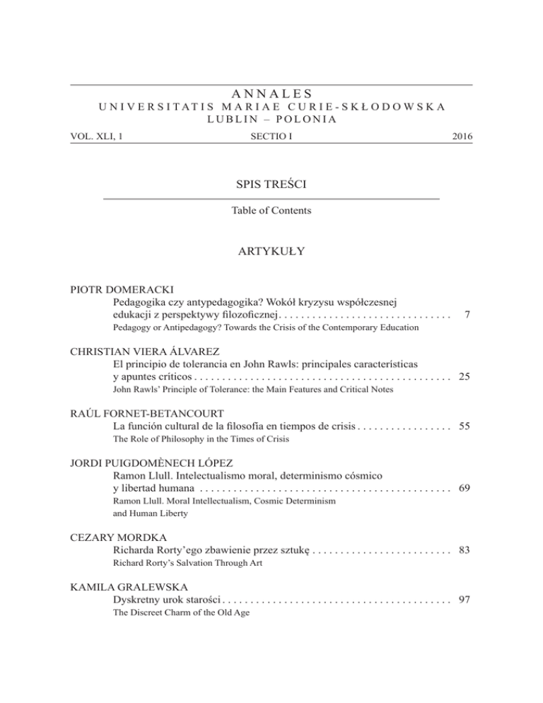 ANNALES U N I V E R S I TAT I S M A R I A E C U R I E - S K Ł O D O W S K A LUBLIN – POLONIA VOL. XLI, 1 SECTIO I 2016 SPIS TREŚCI Table of Contents ARTYKUŁY PIOTR DOMERACKI Pedagogika czy antypedagogika? Wokół kryzysu współczesnej edukacji z perspektywy filozoficznej. . . . . . . . . . . . . . . . . . . . . . . . . . . . . . . 7 Pedagogy or Antipedagogy? Towards the Crisis of the Contemporary Education CHRISTIAN VIERA ÁLVAREZ El principio de tolerancia en John Rawls: principales características y apuntes críticos. . . . . . . . . . . . . . . . . . . . . . . . . . . . . . . . . . . . . . . . . . . . . . 25 John Rawls’ Principle of Tolerance: the Main Features and Critical Notes RAÚL FORNET-BETANCOURT La función cultural de la filosofía en tiempos de crisis. . . . . . . . . . . . . . . . . 55 The Role of Philosophy in the Times of Crisis JORDI PUIGDOMÈNECH LÓPEZ Ramon Llull. Intelectualismo moral, determinismo cósmico y libertad humana . . . . . . . . . . . . . . . . . . . . . . . . . . . . . . . . . . . . . . . . . . . . . 69 Ramon Llull. Moral Intellectualism, Cosmic Determinism and Human Liberty CEZARY MORDKA Richarda Rorty’ego zbawienie przez sztukę. . . . . . . . . . . . . . . . . . . . . . . . . 83 Richard Rorty’s Salvation Through Art KAMILA GRALEWSKA Dyskretny urok starości. . . . . . . . . . . . . . . . . . . . . . . . . . . . . . . . . . . . . . . . . 97 The Discreet Charm of the Old Age 6 Spis Autor treści MATEUSZ BUCZEK Libertariańskie poglądy na policję i sądy w ujęciu Murraya Newtona Rothbarda. . . . . . . . . . . . . . . . . . . . . . . . . . . . . . . . . . . . . . . . . . . . 109 Libertarian Views on Police and Courts of Law by Murray Newton Rothbard RECENZJE MATEUSZ BUCZEK Libertariańska koncepcja wolnego społeczeństwa (John Hospers, Libertarianism. A Political Philosophy for Tomorrow, Leipzig 2013, ss. 298). . . . . . . . . . . . . . . . . . . . . . . . . . . . . . . . . . . . . . . . . . 121 Libertarian Concept of a Free Society (John Hospers, Libertarianism. A Political Philosophy for Tomorrow, Leipzig 2013, pp. 298) KRZYSZTOF POLIT Konstytucja Republiki Chile jako przykład współczesnego sporu filozoficznego o charakterze fundamentalnym (Jaime Bassa Mercado, Juan Carlos Ferrada Bórquez, Christian Viera Álavarez, La Constitución chilena. Una revisión crítica a su práctica política, LOM ediciones, Santiago de Chile 2015, ss. 338). . . . . . . . . . . . . . . . . . . . . . . . . . . . . . . . . . 125 The Constitution of the Republic of Chile as an Example of Modern Philosophical Dispute about the Fundamental Nature (Jaime Bassa Mercado, Juan Carlos Ferrada Bórquez, Christian Viera Álavarez, La Constitución chilena. Una revisión crítica a su práctica política, LOM ediciones, Santiago de Chile 2015, pp. 338) KRZYSZTOF POLIT Przykład klasycznej postaci sceptycyzmu (Gerardo López Sastre, Hume. Cuándo saber ser escéptico, Bonalletra Alcompas, Barcelona 2015, ss. 145). . . . . . . . . . . . . . . . . . . . . . . . . . . . . . . . . . . . . . . . . . . . . . . . . . . . . . 131 The Example of the Classical Form of Skepticism (Gerardo López Sastre, Hume. Cuándo saber ser escéptico, Bonalletra Alcompas,Barcelona 2015, pp. 145)