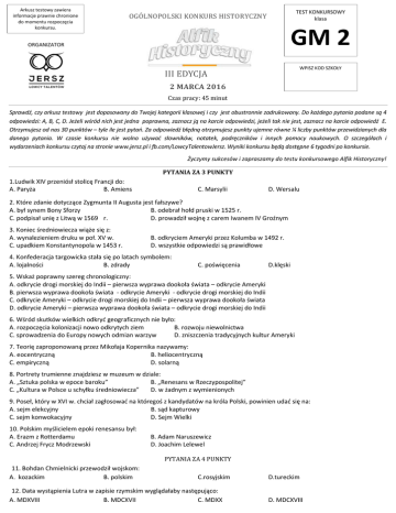Arkusz testowy zawiera informacje prawnie chronione do momentu rozpoczęcia konkursu. TEST KONKURSOWY klasa OGÓLNOPOLSKI KONKURS HISTORYCZNY GM 2 ORGANIZATOR WPISZ KOD SZKOŁY III EDYCJA 2 MARCA 2016 Czas pracy: 45 minut Sprawdź, czy arkusz testowy jest dopasowany do Twojej kategorii klasowej i czy jest obustronnie zadrukowany. Do każdego pytania podane są 4 odpowiedzi: A, B, C, D. Jeżeli wśród nich jest jedna poprawna, zaznacz ją na karcie odpowiedzi, jeżeli tak nie jest, zaznacz na karcie odpowiedź E. Otrzymujesz od nas 30 punktów – tyle ile jest pytań. Za odpowiedź błędną otrzymujesz punkty ujemne równe ¼ liczby punktów przewidzianych dla danego pytania. W czasie konkursu nie wolno używać słowników, notatek, podręczników i innych pomocy naukowych. O szczegółach i wydarzeniach konkursu czytaj na stronie www.jersz.pl i fb.com/LowcyTalentowJersz. Wyniki konkursu będą dostępne 6 tygodni po konkursie. Życzymy sukcesów i zapraszamy do testu konkursowego Alfik Historyczny! PYTANIA ZA 3 PUNKTY 1.Ludwik XIV przeniósł stolicę Francji do: A. Paryża B. Amiens C. Marsylii D. Wersalu 2. Które zdanie dotyczące Zygmunta II Augusta jest fałszywe? A. był synem Bony Sforzy B. odebrał hołd pruski w 1525 r. C. podpisał unię z Litwą w 1569 r. D. prowadził wojnę z carem Iwanem IV Groźnym 3. Koniec średniowiecza wiąże się z: A. wynalezieniem druku w poł. XV w. C. upadkiem Konstantynopola w 1453 r. B. odkryciem Ameryki przez Kolumba w 1492 r. D. wszystkie odpowiedzi są prawidłowe 4. Konfederacja targowicka stała się po latach symbolem: A. lojalności B. zdrady C. poświęcenia D.klęski 5. Wskaż poprawny szereg chronologiczny: A. odkrycie drogi morskiej do Indii – pierwsza wyprawa dookoła świata – odkrycie Ameryki B. pierwsza wyprawa dookoła świata - odkrycie Ameryki - odkrycie drogi morskiej do Indii C. odkrycie Ameryki – odkrycie drogi morskiej do Indii – pierwsza wyprawa dookoła świata D. odkrycie Ameryki – pierwsza wyprawa dookoła świata – odkrycie drogi morskiej do Indii 6. Wśród skutków wielkich odkryć geograficznych nie było: A. rozpoczęcia kolonizacji nowo odkrytych ziem B. rozwoju niewolnictwa C. sprowadzenia do Europy nowych odmian warzyw D. zniszczenia tradycyjnych kultur Ameryki 7. Teorię zaproponowaną przez Mikołaja Kopernika nazywamy: A. eocentryczną B. heliocentryczną C. empiryczną D. solarną 8. Portrety trumienne znajdziesz w muzeum w dziale: A. „Sztuka polska w epoce baroku” B. „Renesans w Rzeczypospolitej” C. „Kultura w Polsce u schyłku średniowiecza” D. w żadnym z wymienionych 9. Poseł, który w XVI w. chciał zagłosować na któregoś z kandydatów na króla Polski, powinien udać się na: A. sejm elekcyjny B. sąd kapturowy C. sejm konwokacyjny D. Sejm Wielki 10. Polskim myślicielem epoki renesansu był: A. Erazm z Rotterdamu C. Andrzej Frycz Modrzewski B. Adam Naruszewicz D. Joachim Lelewel PYTANIA ZA 4 PUNKTY 11. Bohdan Chmielnicki przewodził wojskom: A. kozackim B. polskim C.rosyjskim 12. Data wystąpienia Lutra w zapisie rzymskim wyglądałaby następująco: A. MDXVIII B. MDCXVII C. MDXX D.tureckim D. MDCXVIII 13. Opis doktryny o predestynacji znajdziesz na stronie internetowej poświęconej: A. ideom politycznym oświecenia B. głównym założeniom renesansu C. reformacji w XVI w. D. myślicielom XVII-wiecznym 14. Po trzecim rozbiorze Polski, Warszawa znalazła się pod zaborem: A. rosyjskim B. pruskim C. austriackim D. pozostała wolnym miastem 15. Główne idee rewolucji francuskiej zostały zawarte w: A. Deklaracji Niepodległości B. Powszechnej Deklaracji Praw Człowieka i Obywatela C. Powszechny Pakt Praw Politycznych D. Deklaracji Wolności 16. Stanisław Leszczyński nie był: A. autorem traktatu „Głos wolny wolność ubezpieczający” C. przeciwnikiem Augusta III Mocnego w drodze do tronu B. królem Polski D. władcą Saksonii 17. Francja podczas rządów Ludwika XIV stała się: A. monarchią despotyczną B. monarchią patrymonialną C. monarchią parlamentarną D. monarchią stanową 18. Artykułów henrykowskich nie podpisał: A. Stefan Batory B. Henryk Walezy C. Zygmunt II August D. Zygmunt III Waza 19. Król angielski, ogłaszając się głową Kościoła w Anglii, wydał: A. akt supresji B. akt superstycji C. akt supremacji D. akt supermicji 20. Którego z poniższych dzieł nie znajdziesz w katalogu dokonań Michała Anioła? A. „Dawid” B. „Stworzenie świata” C. „Szkoła ateńska” D. „Pieta” PYTANIA ZA 5 PUNKTÓW 21. W bitwie pod Kłuszynem zwycięzcą został: A. Stanisław Żółkiewski B. Jan Karol Chodkiewicz C. Wasyl Szujski D. Stefan Czarniecki 22. Szesnastowieczne wojny o Inflanty zakończył ostatecznie pokój: A. Oliwie B. Starej Wsi C. Altmarku D. Andruszowie 23. Gotthard Kettler był: A. wielkim mistrzem zakonu inflanckiego C. księciem pruskim B. renesansowym artystą tworzącym w Niderlandach D. dowódcą wojsk rosyjskich 24. Wśród podbitych plemion indiańskich w Ameryce Południowej byli: A. Siuksowie B. Inuici 25. Jakobini wzięli swoją nazwę od: A. imienia przywódcy C. głównego patrona Paryża C. Inkowie B. miejsca, w którym się spotykali D. imienia ostatniego króla Francji 26. W wojnie o niepodległość Stanów Zjednoczonych walczył: A. książę Józef Poniatowski B. późniejszy król Stanisław August Poniatowski C. Kazimierz Pułaski D. Stefan Czarniecki 27. O państwie jako wyniku umowy między obywatelami pisał: A. Niccolo Machiavelli B. Jean Jacques Russeau C. Thomas Hobbes D. Tomasz z Akwinu 28. Traktat w Tordesillas został zawarty między: A. Wielką Brytanią i Francją B. Hiszpanią i Portugalią C. Francją i Hiszpanią D. Wielką Brytanią i USA 29. Wskaż zdanie fałszywe: A. Galileusz został spalony na stosie za swoje poglądy na temat astronomii. B. Jan Gutenberg dokonał odkrycia ruchomej czcionki w połowie XV w. C. Nowo odkryty ląd nazwano „Ameryką” od imienia Amerigo Vespucciego