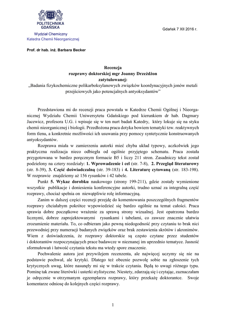Gdańsk 7 XII 2016 r. Wydział Chemiczny Katedra Chemii Nieorganicznej Prof. dr hab. inż. Barbara Becker Recenzja rozprawy doktorskiej mgr Joanny Drzeżdżon zatytułowanej: „Badania fizykochemiczne polikarboksylanowych związków koordynacyjnych jonów metali przejściowych jako potencjalnych antyoksydantów” Przedstawiona mi do recenzji praca powstała w Katedrze Chemii Ogólnej i Nieorganicznej Wydziału Chemii Uniwersytetu Gdańskiego pod kierunkiem dr hab. Dagmary Jacewicz, profesora U.G. i wpisuje się w ten nurt badań Katedry, który lokuje się na styku chemii nieorganicznej i biologii. Przedłożona praca dotyka bowiem tematyki tzw. reaktywnych form tlenu, a konkretnie możliwości ich usuwania przy pomocy syntetycznie konstruowanych antyoksydantów. Rozprawa miała w zamierzeniu autorki mieć chyba układ typowy, aczkolwiek jego praktyczna realizacja nieco odbiegła od ogólnie przyjętego schematu. Praca została przygotowana w bardzo poręcznym formacie B5 i liczy 211 stron. Zasadniczy tekst został podzielony na cztery rozdziały: 1. Wprowadzenie i cel (str. 7-8), 2. Przegląd literaturowy (str. 8-39), 3. Część doświadczalną (str. 39-183) i 4. Literaturę cytowaną (str. 183-198). W rozprawie znajdziemy aż 156 rysunków i 42 tabele. Punkt 5. Wykaz dorobku naukowego (strony 199-211), gdzie zostały wymienione wszystkie publikacje i doniesienia konferencyjne autorki, trudno uznać za integralną część rozprawy, chociaż spełnia on niewątpliwie rolę informacyjną. Zanim w dalszej części recenzji przejdę do komentowania poszczególnych fragmentów rozprawy chciałabym pokrótce wypowiedzieć się bardzo ogólnie na temat całości. Praca sprawia dobre początkowe wrażenie za sprawą strony wizualnej. Jest opatrzona bardzo licznymi, dobrze zaprojektowanymi rysunkami i tabelami, co zawsze znacznie ułatwia zrozumienie materiału. To, co odbieram jako pewną niedogodność przy czytaniu to brak nici przewodniej przy numeracji badanych związków oraz brak zestawienia skrótów i akronimów. Wiem z doświadczenia, że rozprawy doktorskie są często czytane przez studentów i doktorantów rozpoczynających prace badawcze w nieznanej im uprzednio tematyce. Jasność sformułowań i łatwość czytania tekstu ma wtedy spore znaczenie. Pochwalenie autora jest przywilejem recenzenta, ale najwięcej uczymy się nie na podstawie pochwał, ale krytyki. Dlatego też obecnie pozwolę sobie na zgłoszenie tych krytycznych uwag, które nasunęły mi się w trakcie czytania. Będą to uwagi różnego typu. Pominę tak zwane literówki i usterki stylistyczne. Niestety, zdarzają się i czytając, zaznaczałam je odręcznie w otrzymanym egzemplarzu rozprawy, który przekażę doktorantce. Swoje komentarze odniosę do kolejnych części rozprawy. 1 1. Wprowadzenie i cel rozprawy Interesujące i kompetentne wprowadzenie oraz jasne określenie celu powinno być obowiązkowe i zachęcać nas do czytania. Niestety, autorka jest mało precyzyjna i niektóre stwierdzenia powtarza. Za przykład może służyć zajmujące aż cztery wiersze tekstu zdanie w punkcie 1.1 „Zastosowanie syntetycznych antyoksydantów (…) terapii.” Nie wiadomo dlaczego przytoczono je aż dwukrotnie, bo trudno uznać zmianę tylko jednego słowa („również” na także”) za istotną różnicę. Mogę postawić kilka pytań, które nasunęły mi się już w trakcie pierwszego, pobieżnego czytania. Co autorka rozumie pod pojęciem np. metali przejściowych? Co chciała przekazać wzmiankując „gęstość ładunku” w odniesieniu do preparatów enzymatycznych? W króciutkim punkcie 1.2 omawiającym zakres i cel badań dowiadujemy się, że przedmiotem tychże badań będą związki kompleksowe Co2+, Ni2+, Cu2+ i VO2+ z ligandami polikarboksylanowymi oraz „wybranymi ligandami aromatycznych zasad azotowych”. Dlaczego autorka dokonała takiego wyboru jonów? Dlaczego zostały wybrane ligandy polikarboksylanowe? Jak należy rozumieć tekst zacytowany wyżej i opatrzony cudzysłowem? Chciałabym poznać uzasadnienie dokonanych wyborów. Podsumowując, ten bardzo ważny z punktu widzenia „umocowania problemu” fragment rozprawy uważam za zbyt krótki i lakoniczny. O ile nie uzyskam bliższych wyjaśnień w trakcie publicznej obrony, to z pewnością o nie zapytam. 2. Przegląd literaturowy Przegląd literaturowy porusza kilka tematów, które niejako zostały „dotknięte” we wprowadzeniu. Mamy więc trochę danych na temat związków kompleksowych Co2+, Ni2+, Cu2+ i VO2+ z ligandami polikarboksylanowymi. Na samym wstępie spotykamy się np. ze schematem związku kompleksowego [Cu(ida)(H2O)(phen)]4H2O (Rys. 1). Trzeba przyznać, że jest to technicznie najgorszy z rysunków zamieszczonych w pracy, wręcz nieczytelny. Dlaczego??? Pozostałym 155 rysunkom trudno cokolwiek zarzucić, są bowiem bardzo starannie wykonane i bardzo dobre. Od razu też zadajemy sobie pytanie co oznacza skrót ida użyty we wzorze związku, który w przeciwieństwie do phen i bpy nie jest powszechnie znany. Odpowiedź, że jest to anion kwasu iminodioctowego znajdziemy dopiero na kolejnej stronie, bo zestawienia często stosowanych w pracy skrótów brak. Zaraz obok wzmiankowane są aniony podobnych kwasów: diglikolowego (oda), tiodioctowego (tda) oraz N-metyloiminodioctowego (mida). Dopiero po przeczytaniu kolejnego rozdziału rozprawy zauważamy, że to właśnie do tych ligandów dikarboksylanowych autorka zawęziła swoje prace eksperymentalne. Przytoczone zostały reprezentatywne przykłady znanych i interesujących autorkę związków kompleksowych oraz ich dane strukturalne. O ile wśród tych ostatnich istotna jest na przykład informacja o sposobie koordynacji ligandu dikarboksylanowego (fac lub mer) i tym samym strukturze kompleksu, to przytaczanie wartości parametrów komórek elementarnych charakteryzujących strukturę kryształów związków wydaje się zbędne, a już na pewno zbędne jest podawanie