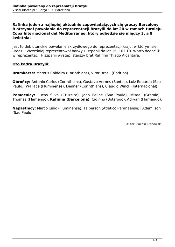 Rafinha powołany do reprzenatcji Brazylii ViscaElBarca.pl • Barça • FC Barcelona Rafinha jeden z najlepiej aktualnie zapowiadających się graczy Barcelony B otrzymał powołanie do reprezentacji Brazylii do lat 20 w ramach turnieju Copa Internacional del Mediterráneo, który odbędzie się między 3, a 8 kwietnia. Jest to debiutanckie powołanie skrzydłowego do reprezentacji kraju, w którym się urodził. Wcześniej reprezentował barwy Hiszpanii do lat 15, 16 i 19. Warto dodać iż w reprezentacji Hiszpanii wystąpi starszy brat Rafinhii Thiago Alcantara. Oto kadra Brazylii: Bramkarze: Mateus Caldeira (Corinthians), Vitor Brasil (Coritiba). Obrońcy: Antonio Carlos (Corinthians), Gustavo Vernes (Santos), Luiz Eduardo (Sao Paulo), Wallace (Fluminense), Denner (Corinthians), Claudio Winck (Internacional). Pomocnicy: Lucas Silva (Cruzeiro), Joao Felipe (Sao Paulo), Misael (Gremio), Thomaz (Flamengo), Rafinha (Barcelona), Cidinho (Botafogo), Adryan (Flamengo). Napastnicy: Marco Junio (Fluminense), Taiberson (Atlético Paranaense) i Ademilson (Sao Paulo). Autor: Łukasz Dębowski 1/1 Powered by TCPDF (www.tcpdf.org)