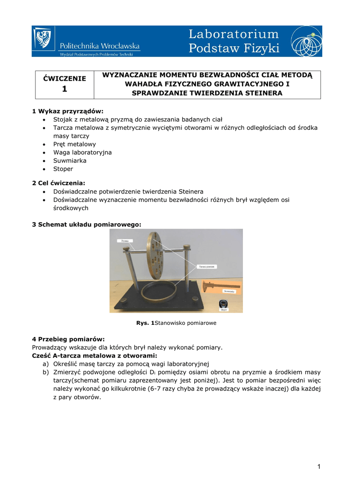 ĆWICZENIE 1 WYZNACZANIE MOMENTU BEZWŁADNOŚCI CIAŁ METODĄ WAHADŁA FIZYCZNEGO GRAWITACYJNEGO I SPRAWDZANIE TWIERDZENIA STEINERA 1 Wykaz przyrządów: Stojak z metalową pryzmą do zawieszania badanych ciał Tarcza metalowa z symetrycznie wyciętymi otworami w różnych odległościach od środka masy tarczy Pręt metalowy Waga laboratoryjna Suwmiarka Stoper 2 Cel ćwiczenia: Doświadczalne potwierdzenie twierdzenia Steinera Doświadczalne wyznaczenie momentu bezwładności różnych brył względem osi środkowych 3 Schemat układu pomiarowego: Rys. 1Stanowisko pomiarowe 4 Przebieg pomiarów: Prowadzący wskazuje dla których brył należy wykonać pomiary. Cześć A-tarcza metalowa z otworami: a) Określić masę tarczy za pomocą wagi laboratoryjnej b) Zmierzyć podwojone odległości Di pomiędzy osiami obrotu na pryzmie a środkiem masy tarczy(schemat pomiaru zaprezentowany jest poniżej). Jest to pomiar bezpośredni więc należy wykonać go kilkukrotnie (6-7 razy chyba że prowadzący wskaże inaczej) dla każdej z pary otworów. 1 d1 D1=2d1 c) Zawiesić tarczę na pryzmie na jednym z wybranych otworów, po czym dokonać pomiaru czasu 100 wahnięć. Należy pamiętać aby nie wychylać wahadła o kąt większy niż kilka stopni. d) Pomiary czasu wahnięć powtórzyć 5 razy. e) Punktu 3 i 4 powtórzyć dla pozostałych par otworów w tarczy. Część B-metalowy pierścień: a) Określić masę m pierścienia za pomocą wagi laboratoryjnej. b) Za pomocą suwmiarki wyznaczyć średnicę d wewnętrzną i zewnętrzną D pierścienia. c) Wyznaczyć czas 100 wahnięć pierścienia zawieszonego na pryzmie; pomiar powtórzyć kilkukrotnie. Cześć a) b) c) d) e) f) C-pręt metalowy: Określić masę pręta za pomocą wagi laboratoryjnej Określić długość pręta 𝑙 za pomocą suwmiarki (pomiar powtórzyć 6-7 razy) Wyznaczyć odległość osi obrotu 𝑑𝑖 od środka masy pręta (pomiary powtórzyć 6-7 razy) Zmierzyć czas 50 wahnięć pręta Pomiar czasu wahnięć powtórzyć 5 krotnie. Punkty 3 - 5 powtórzyć dal 4 innych odległości 𝑑𝑖 osi obrotu od środka masy 5. Opracowanie wyników: Sposób opracowania wyników wskazuje prowadzący Wariant I Część A (tarcza metalowa): a) Na podstawie wielokrotnych pomiarów D1, D2, D3… określić niepewność u(D1), u(D2), u(D3)... b) Określić odległość osi obrotu od środka masy 𝑑𝑖 = 𝐷𝑖 2 1 oraz jej niepewność 𝑈(𝑑𝑖 ) = 𝑢(𝐷𝑖 ) 2 c) Na podstawie pomiarów czasu 𝑡 100 wahnięć dla danej osi obrotu obliczyć uśredniony czas 𝑡̅ 100 wahnięć oraz jego niepewność 𝑢(𝑡̅). Czas reakcji człowieka można przyjąć na poziomie 0.5s. Obliczyć okres drgań wahadła dla poszczególnych osi obrotu 𝑇 = 𝑡̅/𝑛 (n – liczba wahnięć) oraz jego niepewność korzystając z wzoru na niepewność złożoną, niepewność liczby zliczeń przyjąć u(n)=1. potwierdzić zależność okresu drgań wahadła od momentu bezwładności. d) Obliczyć moment bezwładności tarczy względem określonej osi obrotu korzystając ze wzoru: 2 𝑇 2 𝑚𝑔𝑑 𝐼𝑑 = 4𝜋 2 i jego niepewność u(Id). Obliczenia przeprowadzić dla wszystkich odległości d. e) Potwierdzić twierdzenie Steinera, w tym celu należy sprawdzić czy wyrażenie 𝑇 2 𝑔𝑑 − 4𝜋 2 𝑑 2 = 𝐶 jest stałe dla wszystkich osi obrotu w granicy niepewności pomiarowej f) Obliczyć momenty bezwładności względem środkowej osi obrotu na podstawie wartości współczynnika C oraz określić jego niepewność. 𝐼0 = 𝑚 𝐶 4𝜋 2 g) Obliczyć moment bezwładności względem środkowej osi obrotu na podstawie twierdzenie Steinera dla poszczególnych osi obrotu oraz określić jego niepewność 𝐼0 = 𝐼𝑑 − 𝑚𝑑 2 h) Porównać uzyskane 𝐼0 obliczone przy wykorzystaniu dwóch metod Część a) b) c) B (pierścień metalowy): Obliczyć średni czas t dla 100 wahnięć i średni okres T oraz ich niepewności. Obliczyć moment bezwładności Id pierścienia względem osi obrotu i jego niepewność. Korzystając z twierdzenia Steinera, wyznaczyć moment bezwładności Io pierścienia względem osi przechodzącej przez środek masy i jego niepewność. d) Obliczyć moment bezwładności Io (tab. Io.st) pierścienia względem osi środkowej na podstawie wzoru tablicowego: 1 𝐼0.𝑠𝑡 = 𝑚(𝑑 2 + 𝐷2 ) 8 oraz obliczyć jego niepewność. e) Porównać wartości momentu bezwładności Io obliczone metodą dynamiczną i statyczną. Część C (pręt metalowy): a) Obliczyć niepewności pomiarowe długości pręta 𝑢(𝑙) oraz niepewności odległości 𝑢(𝑑) dla poszczególnych osi obrotu od środka masy. b) Na podstawie pomiarów czasu 𝑡 50 wahnięć dla danej osi obrotu obliczyć uśredniony czas 𝑡̅ 50 wahnięć oraz jego niepewność𝑢(𝑡̅). Czas reakcji człowieka można przyjąć na poziomie 0.5s. c) Obliczyć okres drgań wahadła dla danej osi obrotu 𝑇 = 𝑡̅/𝑛 (n – liczba wahnięć) oraz jego niepewność korzystając z wzoru na niepewność złożoną, niepewność liczby zliczeń przyjąć u(n)=1. Potwierdzić zależność okresu drgań wahadła od odległości osi obrotu od środka ciężkości d) Obliczyć moment bezwładności pręta względem określonej osi obrotu i jego niepewność uc(Id). Obliczenia przeprowadzić dla wszystkich odległości d. e) Potwierdzić twierdzenie Steinera, w tym celu należy sprawdzić czy wyrażenie 𝑇 2 𝑔𝑑 − 4𝜋 2 𝑑 2 = 𝐶 jest stałe dla wszystkich osi obrotu w granicy niepewności pomiarowej f) Obliczyć momenty bezwładności względem środkowej osi obrotu na podstawie wartości współczynnika C oraz określić jego niepewność. 𝐼0 = 𝑚 𝐶 4𝜋 2 g) Obliczyć moment bezwładności względem środkowej osi obrotu na podstawie wyników uzyskanych dla poszczególnych osi obrotu oraz określić jego niepewność 𝐼0 = 𝐼𝑑 − 𝑚𝑑 2 3 h) Porównać uzyskane 𝐼0 obliczone przy 