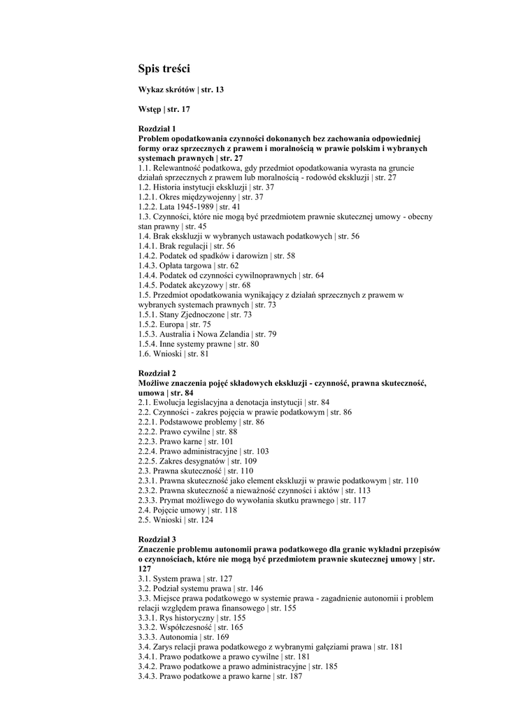 Spis treści Wykaz skrótów | str. 13 Wstęp | str. 17 Rozdział 1 Problem opodatkowania czynności dokonanych bez zachowania odpowiedniej formy oraz sprzecznych z prawem i moralnością w prawie polskim i wybranych systemach prawnych | str. 27 1.1. Relewantność podatkowa, gdy przedmiot opodatkowania wyrasta na gruncie działań sprzecznych z prawem lub moralnością - rodowód ekskluzji | str. 27 1.2. Historia instytucji ekskluzji | str. 37 1.2.1. Okres międzywojenny | str. 37 1.2.2. Lata 1945-1989 | str. 41 1.3. Czynności, które nie mogą być przedmiotem prawnie skutecznej umowy - obecny stan prawny | str. 45 1.4. Brak ekskluzji w wybranych ustawach podatkowych | str. 56 1.4.1. Brak regulacji | str. 56 1.4.2. Podatek od spadków i darowizn | str. 58 1.4.3. Opłata targowa | str. 62 1.4.4. Podatek od czynności cywilnoprawnych | str. 64 1.4.5. Podatek akcyzowy | str. 68 1.5. Przedmiot opodatkowania wynikający z działań sprzecznych z prawem w wybranych systemach prawnych | str. 73 1.5.1. Stany Zjednoczone | str. 73 1.5.2. Europa | str. 75 1.5.3. Australia i Nowa Zelandia | str. 79 1.5.4. Inne systemy prawne | str. 80 1.6. Wnioski | str. 81 Rozdział 2 Możliwe znaczenia pojęć składowych ekskluzji - czynność, prawna skuteczność, umowa | str. 84 2.1. Ewolucja legislacyjna a denotacja instytucji | str. 84 2.2. Czynności - zakres pojęcia w prawie podatkowym | str. 86 2.2.1. Podstawowe problemy | str. 86 2.2.2. Prawo cywilne | str. 88 2.2.3. Prawo karne | str. 101 2.2.4. Prawo administracyjne | str. 103 2.2.5. Zakres desygnatów | str. 109 2.3. Prawna skuteczność | str. 110 2.3.1. Prawna skuteczność jako element ekskluzji w prawie podatkowym | str. 110 2.3.2. Prawna skuteczność a nieważność czynności i aktów | str. 113 2.3.3. Prymat możliwego do wywołania skutku prawnego | str. 117 2.4. Pojęcie umowy | str. 118 2.5. Wnioski | str. 124 Rozdział 3 Znaczenie problemu autonomii prawa podatkowego dla granic wykładni przepisów o czynnościach, które nie mogą być przedmiotem prawnie skutecznej umowy | str. 127 3.1. System prawa | str. 127 3.2. Podział systemu prawa | str. 146 3.3. Miejsce prawa podatkowego w systemie prawa - zagadnienie autonomii i problem relacji względem prawa finansowego | str. 155 3.3.1. Rys historyczny | str. 155 3.3.2. Współczesność | str. 165 3.3.3. Autonomia | str. 169 3.4. Zarys relacji prawa podatkowego z wybranymi gałęziami prawa | str. 181 3.4.1. Prawo podatkowe a prawo cywilne | str. 181 3.4.2. Prawo podatkowe a prawo administracyjne | str. 185 3.4.3. Prawo podatkowe a prawo karne | str. 187 3.5. Znaczenie statusu prawa podatkowego dla wykładni przepisów o czynnościach, które nie mogą być przedmiotem prawnie skutecznej umowy | str. 189 3.6. Wnioski | str. 198 Rozdział 4 Normy konstytucyjne oraz zasady prawa podatkowego i postępowania w sprawach podatkowych determinujące wykładnię przepisów o czynnościach, które nie mogą być przedmiotem prawnie skutecznej umowy | str. 200 4.1. Zasada podatkowa | str. 200 4.2. Zarys procesu kształtowania się zasad podatkowych - przegląd wybranych systemów, teorii oraz doktryn | str. 203 4.3. Wykładnia prawa a zasady prawa | str. 215 4.4. Zasady prawa podatkowego a zasady podatkowe | str. 223 4.5. Wybrane zasady prawa podatkowego o randze konstytucyjnej | str. 227 4.5.1. Katalog zasad | str. 227 4.5.2. Zasada demokratycznego państwa prawa | str. 229 4.5.2.1. Zasada zaufania | str. 231 4.5.2.2. Zasada niedziałania prawa wstecz | str. 234 4.5.2.3. Zasada określoności | str. 235 4.5.3. Zasada sprawiedliwości i zasada sprawiedliwości podatkowej | str. 238 4.5.4. Zasada równości | str. 243 4.5.5. Zasada powszechności | str. 248 4.5.6. Zasada praworządności | str. 251 4.6. Wybrane zasady gałęzi prawa podatkowego | str. 254 4.6.1. Katalog zasad | str. 254 4.6.2. Zasada rozstrzygania wątpliwości na korzyść podatnika | str. 256 4.6.3. Zasada respektowania pojęć przejętych z innych dziedzin prawa | str. 262 4.7. Wnioski | str. 263 Rozdział 5 Prawo podatkowe Unii Europejskiej a kwalifikacja czynności jako będącej przedmiotem prawnie skutecznej albo prawnie nieskutecznej umowy | str. 267 5.1. Prawo podatkowe Unii Europejskiej | str. 267 5.2. Wybrane aspekty wykładni prawa podatkowego Unii Europejskiej | str. 283 5.2.1. Przesłanki identyfikacji kluczowych dla wykładni kwestii | str. 283 5.2.2. Wielojęzyczność prawa unijnego | str. 284 5.2.3. Wielokulturowość prawa | str. 289 5.2.4. Wykładnia celowościowa prawa Unii Europejskiej | str. 291 5.2.5. Zakres wykładni prawa podatkowego Unii Europejskiej | str. 295 5.2.6. Zarys roli orzecznictwa Trybunału Sprawiedliwości Unii Europejskiej w wykładni i stosowaniu prawa podatkowego Unii Europejskiej | str. 296 5.3. Wybrane problemy wykładni i stosowania krajowego prawa podatkowego z uwzględnieniem prawa podatkowego Unii Europejskiej | str. 301 5.3.1. Zasada praworządności a prawo Unii | str. 301 5.3.2. Wykładnia prounijna | str. 303 5.3.3. Niezgodność ustawy z prawem unijnym | str. 308 5.4. Wspólny system podatku od wartości dodanej a krajowa ekskluzja w podatku VAT czynności, które nie mogą być przedmiotem prawnie skutecznej umowy | str. 311 5.4.1. Harmonizacja | str. 311 5.4.2. Zasada powszechności i zasada neutralności wspólnego systemu podatku od wartości dodanej | str. 314 5.4.2.1. Zasada powszechności | str. 317 5.4.2.2. Zasada neutralności | str. 318 5.4.3. Instytucja czynności, które nie mogą być przedmiotem prawnie skutecznej umowy, jako apostazja od zasad powszechności i neutralności opodatkowania VAT | str. 320 5.5. Wnioski | str. 331 Rozdział 6 Koherencja i denotacja ekskluzji | str. 335 6.1. Koherencja jako pożądana cecha zbioru desygnatów | str. 335 6.2. Denotacja instytucji prawa podatkowego a różnice konstrukcyjne podatków | str. 338 6.3. Wyłączenie spod opodatkowania a prawo właściwe | str. 340 6.4. Zakres wyłączenia | str. 354 6.5. Entropia, multicentry