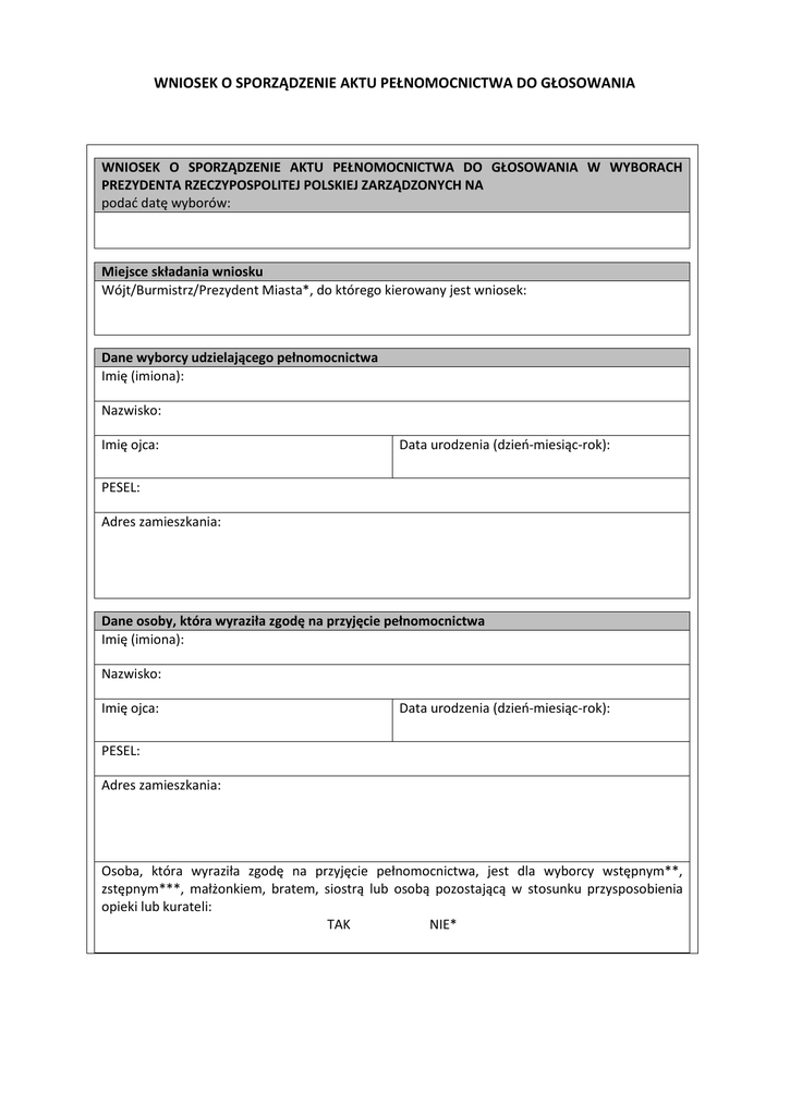 WNIOSEK O SPORZĄDZENIE AKTU PEŁNOMOCNICTWA DO GŁOSOWANIA WNIOSEK O SPORZĄDZENIE AKTU PEŁNOMOCNICTWA DO GŁOSOWANIA W WYBORACH PREZYDENTA RZECZYPOSPOLITEJ POLSKIEJ ZARZĄDZONYCH NA podad datę wyborów: Miejsce składania wniosku Wójt/Burmistrz/Prezydent Miasta*, do którego kierowany jest wniosek: Dane wyborcy udzielającego pełnomocnictwa Imię (imiona): Nazwisko: Imię ojca: Data urodzenia (dzieo-miesiąc-rok): PESEL: Adres zamieszkania: Dane osoby, która wyraziła zgodę na przyjęcie pełnomocnictwa Imię (imiona): Nazwisko: Imię ojca: Data urodzenia (dzieo-miesiąc-rok): PESEL: Adres zamieszkania: Osoba, która wyraziła zgodę na przyjęcie pełnomocnictwa, jest dla wyborcy wstępnym**, zstępnym***, małżonkiem, bratem, siostrą lub osobą pozostającą w stosunku przysposobienia opieki lub kurateli: TAK NIE* Do wniosku załączono 1. pisemną zgodę osoby, która wyraziła zgodę na przyjęcie pełnomocnictwa; 2. kopię aktualnego orzeczenia właściwego organu orzekającego o ustalenie stopnia niepełnosprawności wyborcy (nie dotyczy wyborcy, który najpóźniej w dniu głosowania kooczy 75 lat); 3. kopię zaświadczenia o prawie do głosowania wydanego osobie, która wyraziła zgodę na przyjęcie pełnomocnictwa (załącza się wyłącznie w przypadku, gdy osoba, która wyraziła zgodę na przyjęcie pełnomocnictwa, nie jest wpisana do rejestru wyborców w tej samej gminie, co wyborca udzielający pełnomocnictwa do głosowania); 4. kopię dokumentu potwierdzającego pozostawanie wyborcy z osobą, która wyraziła zgodę na przyjęcie pełnomocnictwa, w stosunku przysposobienia/opieki/kurateli* (załącza się wyłącznie w przypadku, gdy taki stosunek istnieje). Miejsce sporządzenia aktu pełnomocnictwa do głosowania (wypełnid jedynie w przypadku, gdy ma byd ono inne niż miejsce zamieszkania wyborcy udzielającego pełnomocnictwa do głosowania): Oświadczenia Oświadczam, że wszystkie dane zawarte we wniosku są zgodne z prawdą. Wyborca wyraża zgodę na to, by w postępowaniu w sprawie sporządzenia aktu pełnomocnictwa był reprezentowany przez osobę, która wyraziła zgodę na przyjęcie pełnomocnictwa: TAK NIE* Wyborca nie może lub nie umie złożyd podpisu: TAK NIE* Data wypełnienia (dzieo-miesiąc-rok): - - Podpis wyborcy (w przypadku gdy wyborca nie może lub nie umie złożyd podpisu, w miejscu tym podpis składa osoba, która wyraziła zgodę na przyjęcie pełnomocnictwa) ………………………………………………………………………………….. Pouczenie Akt pełnomocnictwa do głosowania sporządzony: - przed dniem pierwszego głosowania (tzw. I tura) uprawnia również do oddania głosu w głosowaniu ponownym (tzw. II tura), jeżeli zostanie ono przeprowadzone; - po dniu pierwszego głosowania uprawnia wyłącznie do oddania głosu w głosowaniu ponownym (tzw. II tura), jeżeli zostanie ono przeprowadzone. Adnotacje urzędowe Numer wniosku: Uwagi: Podpis przyjmującego wniosek: ……………………………………………………………………………… * niepotrzebne skreślid ** wstępnym jest ojciec, matka, dziadek, babka itd. *** zstępnym jest syn, córka, wnuk, wnuczka itd. ZGODA NA PRZYJĘCIE PEŁNOMOCNICTWA DO GŁOSOWANIA Miejsce składania wniosku Wójt/Burmistrz/Prezydent Miasta*, do którego kierowany jest wniosek: Wyrażam zgodę na przyjęcie pełnomocnictwa do głosowania w wyborach Prezydenta Rzeczypospolitej Polskiej zarządzonych na (podad datę wyborów): Dane osoby, która wyraziła zgodę na przyjęcie pełnomocnictwa Imię (imiona): Nazwisko: Imię ojca: Data urodzenia (dzieo-miesiąc-rok): PESEL: Adres zamieszkania: Osoba, która wyraziła zgodę na przyjęcie pełnomocnictwa, jest dla wyborcy wstępnym**, zstępnym***, małżonkiem, bratem, siostrą lub osobą pozostającą w stosunku przysposobienia opieki lub kurateli: TAK NIE* Dane wyborcy udzielającego pełnomocnictwa Imię (imiona): Nazwisko: Imię ojca: PESEL: Adres zamieszkania: Data urodzenia (dzieo-miesiąc-rok): Oświadczenia i wnioski Proszę o pozostawienie aktu pełnomocnictwa do głosowania do odbioru w urzędzie gminy/doręczenie na wskazany poniżej adres*: …............................................................................................................................................................................ ............................................................................................................................................................................... ............................................................................................................................................................................... ............................................................................................................................................................................... ............................................................................................................................................................................... Informuję, że wyraziłam/ wyraziłem* już zgodę na przyjęcie pełnomocnictwa do głosowania od (należy podad imię i nazwisko PESEL, oraz adres zamieszkania wyborcy): ............................................................................................................................................................................... ............................................................................................................................................................................... ............................................................................................................................................................................... ............................................................................................................................................................................... .....................................