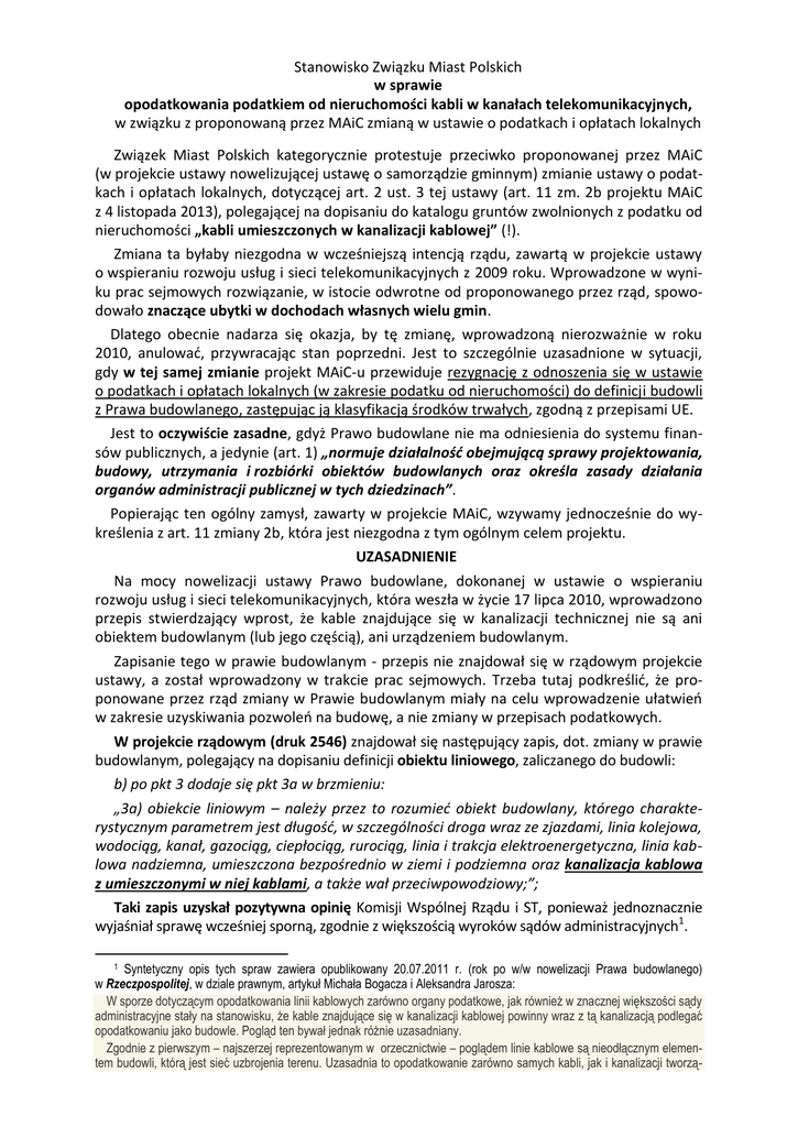 Stanowisko Związku Miast Polskich w sprawie opodatkowania podatkiem od nieruchomości kabli w kanałach telekomunikacyjnych, w związku z proponowaną przez MAiC zmianą w ustawie o podatkach i opłatach lokalnych Związek Miast Polskich kategorycznie protestuje przeciwko proponowanej przez MAiC (w projekcie ustawy nowelizującej ustawę o samorządzie gminnym) zmianie ustawy o podatkach i opłatach lokalnych, dotyczącej art. 2 ust. 3 tej ustawy (art. 11 zm. 2b projektu MAiC z 4 listopada 2013), polegającej na dopisaniu do katalogu gruntów zwolnionych z podatku od nieruchomości „kabli umieszczonych w kanalizacji kablowej” (!). Zmiana ta byłaby niezgodna w wcześniejszą intencją rządu, zawartą w projekcie ustawy o wspieraniu rozwoju usług i sieci telekomunikacyjnych z 2009 roku. Wprowadzone w wyniku prac sejmowych rozwiązanie, w istocie odwrotne od proponowanego przez rząd, spowodowało znaczące ubytki w dochodach własnych wielu gmin. Dlatego obecnie nadarza się okazja, by tę zmianę, wprowadzoną nierozważnie w roku 2010, anulować, przywracając stan poprzedni. Jest to szczególnie uzasadnione w sytuacji, gdy w tej samej zmianie projekt MAiC-u przewiduje rezygnację z odnoszenia się w ustawie o podatkach i opłatach lokalnych (w zakresie podatku od nieruchomości) do definicji budowli z Prawa budowlanego, zastępując ją klasyfikacją środków trwałych, zgodną z przepisami UE. Jest to oczywiście zasadne, gdyż Prawo budowlane nie ma odniesienia do systemu finansów publicznych, a jedynie (art. 1) „normuje działalność obejmującą sprawy projektowania, budowy, utrzymania i rozbiórki obiektów budowlanych oraz określa zasady działania organów administracji publicznej w tych dziedzinach”. Popierając ten ogólny zamysł, zawarty w projekcie MAiC, wzywamy jednocześnie do wykreślenia z art. 11 zmiany 2b, która jest niezgodna z tym ogólnym celem projektu. UZASADNIENIE Na mocy nowelizacji ustawy Prawo budowlane, dokonanej w ustawie o wspieraniu rozwoju usług i sieci telekomunikacyjnych, która weszła w życie 17 lipca 2010, wprowadzono przepis stwierdzający wprost, że kable znajdujące się w kanalizacji technicznej nie są ani obiektem budowlanym (lub jego częścią), ani urządzeniem budowlanym. Zapisanie tego w prawie budowlanym - przepis nie znajdował się w rządowym projekcie ustawy, a został wprowadzony w trakcie prac sejmowych. Trzeba tutaj podkreślić, że proponowane przez rząd zmiany w Prawie budowlanym miały na celu wprowadzenie ułatwień w zakresie uzyskiwania pozwoleń na budowę, a nie zmiany w przepisach podatkowych. W projekcie rządowym (druk 2546) znajdował się następujący zapis, dot. zmiany w prawie budowlanym, polegający na dopisaniu definicji obiektu liniowego, zaliczanego do budowli: b) po pkt 3 dodaje się pkt 3a w brzmieniu: „3a) obiekcie liniowym – należy przez to rozumieć obiekt budowlany, którego charakterystycznym parametrem jest długość, w szczególności droga wraz ze zjazdami, linia kolejowa, wodociąg, kanał, gazociąg, ciepłociąg, rurociąg, linia i trakcja elektroenergetyczna, linia kablowa nadziemna, umieszczona bezpośrednio w ziemi i podziemna oraz kanalizacja kablowa z umieszczonymi w niej kablami, a także wał przeciwpowodziowy;”; Taki zapis uzyskał pozytywna opinię Komisji Wspólnej Rządu i ST, ponieważ jednoznacznie wyjaśniał sprawę wcześniej sporną, zgodnie z większością wyroków sądów administracyjnych1. 1 Syntetyczny opis tych spraw zawiera opublikowany 20.07.2011 r. (rok po w/w nowelizacji Prawa budowlanego) w Rzeczpospolitej, w dziale prawnym, artykuł Michała Bogacza i Aleksandra Jarosza: W sporze dotyczącym opodatkowania linii kablowych zarówno organy podatkowe, jak również w znacznej większości sądy administracyjne stały na stanowisku, że kable znajdujące się w kanalizacji kablowej powinny wraz z tą kanalizacją podlegać opodatkowaniu jako budowle. Pogląd ten bywał jednak różnie uzasadniany. Zgodnie z pierwszym – najszerzej reprezentowanym w orzecznictwie – poglądem linie kablowe są nieodłącznym elementem budowli, którą jest sieć uzbrojenia terenu. Uzasadnia to opodatkowanie zarówno samych kabli, jak i kanalizacji tworzą- W sprawozdaniu podkomisji, którą kierował poseł J. Piechociński, fragment ten brzmiał już ODWROTNIE niż w projekcie rządowym (zapewne w wyniku lobbingu firm telekomunikacyjnych): b) po pkt 3 dodaje się pkt 3a w brzmieniu: „3a) obiekcie liniowym – należy przez to rozumieć obiekt budowlany, którego charakterystycznym parametrem jest długość, w szczególności droga wraz ze zjazdami, linia kolejowa, wodociąg, kanał, gazociąg, ciepłociąg, rurociąg, linia i trakcja elektroenergetyczna, linia kablowa nadziemna i, umieszczona bezpośrednio w ziemi, podziemna, wał przeciwpowodziowy oraz kanalizacja kablowa, przy czym kable w niej umieszczone nie stanowią obiektu budowlanego lub jego części ani urządzenia budowlanego;”; Niestety podkomisja nie przedstawiła skutków finansowych proponowanej zmiany, była więc ona de facto niezgodna z art. 50 ust. 2 ustawy o finansach publicznych oraz z art. 36 ust. 6 Regulaminu Sejmu (organizacje samorządowe nie wiedziały o zmianie wprowadzonej przez podkomisję wbrew projektowi rządowemu). W sprawozdaniu Komisji Infrastruktury (druk 2834) zapis ten brzmi identycznie, podobnie jak w art. 65 ostatecznie uchwalonej ustawie z dnia 7 maja 2010 r. o wspieraniu rozwoju usług i sieci telekomunikacyjnych (Dz. U. 2010 nr 106 poz. 675) Nowelizacja prawa budowlanego, zaproponowana przez rząd w ramach tej ustawy, miała na celu ułatwienia w budowie sieci telekomunikacyjnych, a nie uderzenie w dochody gmin. Tymczasem zmiana wprowadzona przez posłów nie miała żadnego znaczenia dla Prawa budowlanego, w istocie dotycząc wyłącznie definicji budowli na użytek ich opodatkowania podatkiem od nieruchomości. Po wejściu w życie ustawy telekomunikacyjnej w w