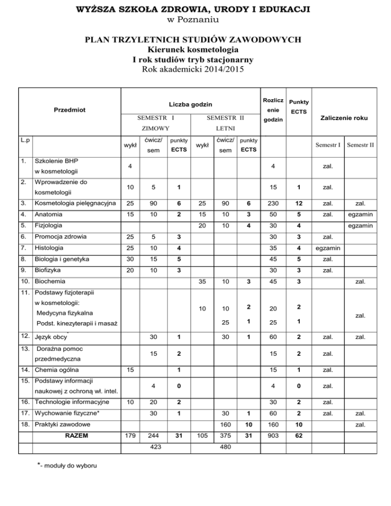 WYŻSZA SZKOŁA ZDROWIA, URODY I EDUKACJI w Poznaniu PLAN TRZYLETNICH STUDIÓW ZAWODOWYCH Kierunek kosmetologia I rok studiów tryb stacjonarny Rok akademicki 2014/2015 Przedmiot L.p 1. wykł Szkolenie BHP w kosmetologii 2. Wprowadzenie do kosmetologii Rozlicz Punkty enie ECTS Liczba godzin SEMESTR I SEMESTR II ZIMOWY LETNI ćwicz/ punkty sem ECTS wykł Zaliczenie roku godzin ćwicz/ punkty sem Semestr I ECTS 4 4 10 5 1 Semestr II zal. 15 1 zal. 3. Kosmetologia pielęgnacyjna 25 90 6 25 90 6 230 12 zal. zal. 4. Anatomia 15 10 2 15 10 3 50 5 zal. egzamin 5. Fizjologia 20 10 4 30 4 6. Promocja zdrowia 25 5 3 30 3 zal. 7. Histologia 25 10 4 35 4 egzamin 8. Biologia i genetyka 30 15 5 45 5 zal. 9. Biofizyka 20 10 3 30 3 zal. 10. Biochemia egzamin 35 10 3 45 3 zal. 10 10 2 20 2 25 1 25 1 30 1 60 2 zal. 11. Podstawy fizjoterapii w kosmetologii: Medycyna fizykalna zal. Podst. kinezyterapii i masaż 12. Język obcy* 13. Doraźna pomoc przedmedyczna 14. Chemia ogólna 1 15 2 15 2 zal. 1 15 1 zal. 4 0 4 0 zal. 20 2 30 2 zal. 30 1 zal. 15 15. Podstawy informacji naukowej z ochroną wł. intel. 16. Technologie informacyjne 30 10 17. Wychowanie fizyczne* 18. Praktyki zawodowe RAZEM 179 244 423 *- moduły do wyboru 31 105 30 1 60 2 160 10 160 10 375 31 903 62 480 zal. zal. zal. WYŻSZA SZKOŁA ZDROWIA, URODY I EDUKACJI w Poznaniu PLAN TRZYLETNICH STUDIÓW ZAWODOWYCH Kierunek kosmetologia II rok studiów tryb stacjonarny Rok akademicki 2014/2015 Przedmiot L.p Rozlicz Liczba godzin enie SEMESTR III SEMESTR IV ZIMOWY LETNI wykł ćwicz/ punkty sem ECTS 80 6 wykł sem Kosmetologia pielęgnacyjna 2. Kosmetologia upiększająca 40 120 3. Dermatologia 20 15 4. Patofizjologia 5. Podstawy fizjoterapii Zaliczenie roku ECTS ćwicz/ punkty 1. 30 godzin Punkty ECTS Semestr Semestr III IV 110 6 egzamin 9 160 9 egzamin 3 35 3 zal. 20 10 3 30 3 zal 10 10 3 20 3 egzamin 25 1 25 1 zal. 10 10 2 20 2 zal. 20 15 3 35 3 zal. 2 30 2 2 60 3 zal. zal. 2 55 4 zal. zal. 2 35 2 zal. zal. 2 30 2 w kosmetologii: Medycyna fizykalna Podst. kinezyterapii i masaż 6. Edukacyjne aspekty komunikacji społecznej/ Komunikacja z pacjentem z elementami poradnictwa* 7. Elementy psychologii 8. Pedagogika zdrowia/ 30 Socjologia w zdrowiu* 9. Język obcy* 30 1 30 egzamin 10. Chemia i receptura kosmetyczna Chemia kosmetyczna 30 2 Receptura kosmetyczna 25 5 30 11. Higiena 30 12. Mikrobiologia 20 10 3 30 3 zal. 13. Immunologia 20 10 4 30 4 egzamin 30 1 30 1 zal. 14. Kształtowanie sylwetki i postawy ciała 15. Praktyki zawodowe RAZEM 190 230 420 *- moduły do wyboru 31 120 160 10 160 10 355 30 895 61 475 zal. zal. WYŻSZA SZKOŁA ZDROWIA, URODY I EDUKACJI w Poznaniu PLAN TRZYLETNICH STUDIÓW ZAWODOWYCH Kierunek kosmetologia III rok studiów tryb stacjonarny Rok akademicki 2014/2015 Przedmiot Liczba godzin SEMESTR V ZIMOWY L.p wykł 1. ćwicz punkty sem ECTS SEMESTR VILETNI wykł ćwicz punkty sem ECTS Rozlicze nie godzin Punkty ECTS Zaliczenie roku Semestr V Semestr VI Kosmetologia lecznicza z el. medycyny estetycznej/ 2 20 2 30 2 1 15 1 1 45 3 1 15 1 15 260 28 zal. 25 3 egzamin 30 1 1 25 1 zal. 1 15 1 zal. 20 Substancje roślinne w zal. żywności i kosmetologii* 2. Podstawy żywienia z elementami dietetyki 3. Podstawy chirurgii plast. 4. Farmakologia 5. Farmakognozja 6. 7. Specjalności: - Podologia - Wizaż i stylizacja - Kosmetologia z el. metodyki kształcenia zaw.* Dermatologia 8. Podstawy zarządzania 20 10 2 15 30 2 15 15 15 110 13 15 10 3 i kontroli jakości/ Podstawy 10 125 1 30 egzamin zal. zal. zal. zal. zal. zal. statystyki* 9. Podstawy ekonomii i prawa 20 10. Podstawy sensoryki 15 11. Chemia i receptura 5 kosmetyczna Chemia kosmetyczna Receptura kosmetyczna 12. Estetyka 13. Podstawy marketingu 14. Etyka zawodu 15. Metodologiczne podstawy 20 badań własnych 16. Seminarium dyplomowe* 17. Fakultet – Nowości w 2 30 2 10 2 30 2 30 1 - moduły do wyboru 10 1 zal. zal. 15 1 15 1 zal. 15 1 15 1 zal. 170 20 4 40 6 60 10 zal. zal. 35 2 35 2 70 4 zal. zal. 230 34 225 30 735 64 400 * egzamin 30 20 kosmetyce i kosmetologii* RAZEM 5 5 110 335