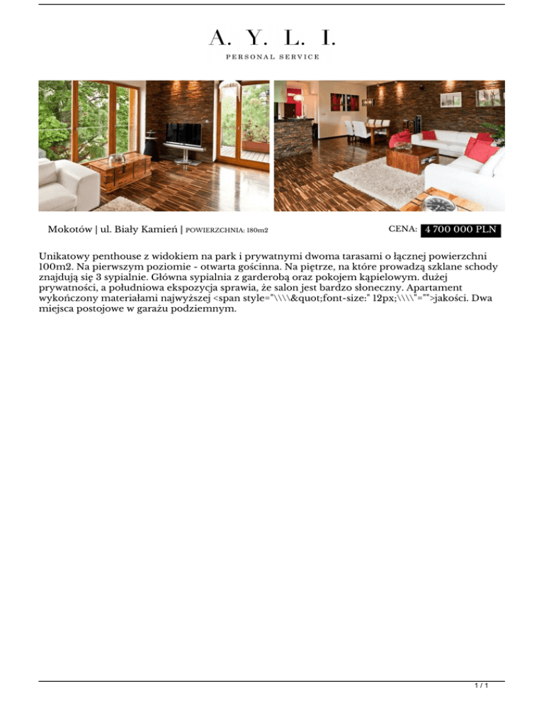 Mokotów | ul. Biały Kamień | POWIERZCHNIA: 180m2 CENA: 4 700 000 PLN Unikatowy penthouse z widokiem na park i prywatnymi dwoma tarasami o łącznej powierzchni 100m2. Na pierwszym poziomie - otwarta gościnna. Na piętrze, na które prowadzą szklane schody znajdują się 3 sypialnie. Główna sypialnia z garderobą oraz pokojem kąpielowym. dużej prywatności, a południowa ekspozycja sprawia, że salon jest bardzo słoneczny. Apartament wykończony materiałami najwyższej <span style="\\\\"font-size:" 12px;\\\\"="">jakości. Dwa miejsca postojowe w garażu podziemnym. 1/1 Powered by TCPDF (www.tcpdf.org)