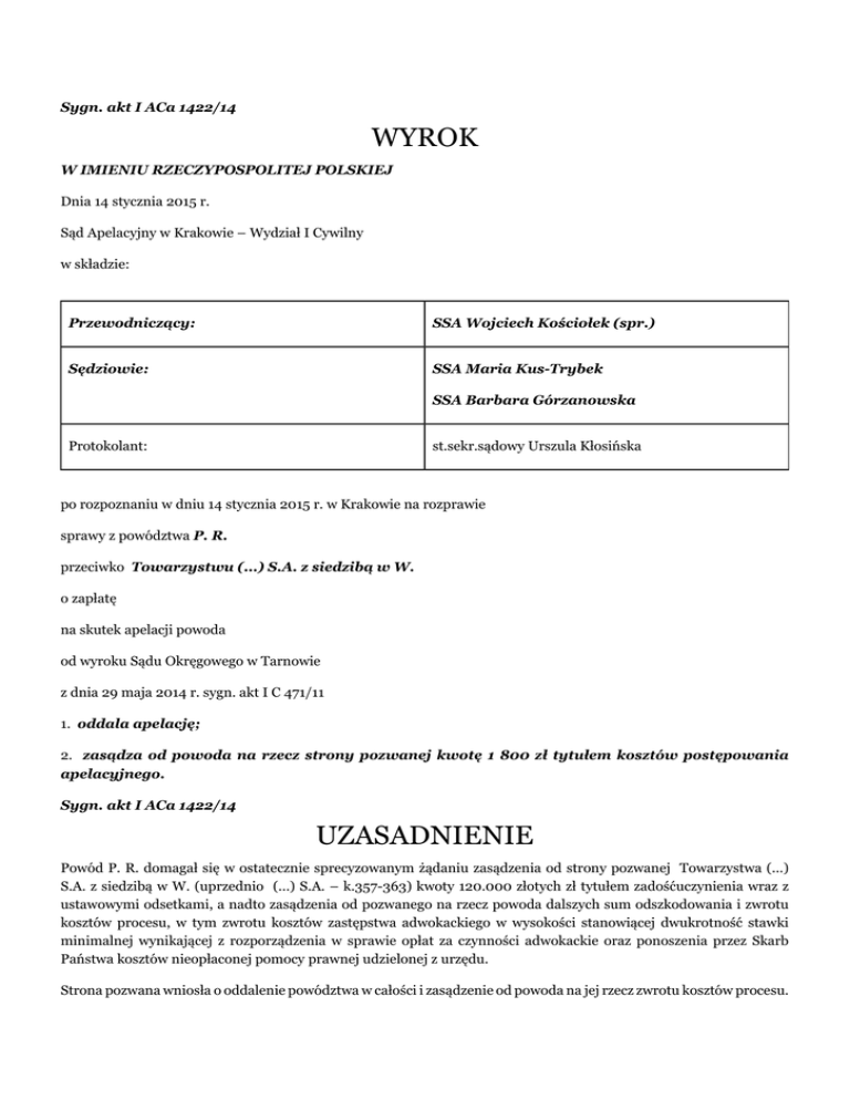 Sygn. akt I ACa 1422/14 WYROK W IMIENIU RZECZYPOSPOLITEJ POLSKIEJ Dnia 14 stycznia 2015 r. Sąd Apelacyjny w Krakowie – Wydział I Cywilny w składzie: Przewodniczący: SSA Wojciech Kościołek (spr.) Sędziowie: SSA Maria Kus-Trybek SSA Barbara Górzanowska Protokolant: st.sekr.sądowy Urszula Kłosińska po rozpoznaniu w dniu 14 stycznia 2015 r. w Krakowie na rozprawie sprawy z powództwa P. R. przeciwko Towarzystwu (...) S.A. z siedzibą w W. o zapłatę na skutek apelacji powoda od wyroku Sądu Okręgowego w Tarnowie z dnia 29 maja 2014 r. sygn. akt I C 471/11 1. oddala apelację; 2. zasądza od powoda na rzecz strony pozwanej kwotę 1 800 zł tytułem kosztów postępowania apelacyjnego. Sygn. akt I ACa 1422/14 UZASADNIENIE Powód P. R. domagał się w ostatecznie sprecyzowanym żądaniu zasądzenia od strony pozwanej Towarzystwa (...) S.A. z siedzibą w W. (uprzednio (...) S.A. – k.357-363) kwoty 120.000 złotych zł tytułem zadośćuczynienia wraz z ustawowymi odsetkami, a nadto zasądzenia od pozwanego na rzecz powoda dalszych sum odszkodowania i zwrotu kosztów procesu, w tym zwrotu kosztów zastępstwa adwokackiego w wysokości stanowiącej dwukrotność stawki minimalnej wynikającej z rozporządzenia w sprawie opłat za czynności adwokackie oraz ponoszenia przez Skarb Państwa kosztów nieopłaconej pomocy prawnej udzielonej z urzędu. Strona pozwana wniosła o oddalenie powództwa w całości i zasądzenie od powoda na jej rzecz zwrotu kosztów procesu. Zaskarżoną częścią wyroku Sąd Okręgowy w Tarnowie oddalił żądanie zapłaty zadośćuczynienia ponad zasądzoną od strony pozwanej kwotę 50.755,00 złotych z ustawowymi odsetkami od kwoty 50.000 zł (jako wartością zadośćuczynienia) od dnia 12 stycznia 2011r., nadto zasądził od powoda na rzecz strony pozwanej kwotę 251,85 zł tytułem zwrotu kosztów procesu, a pozostałe koszty procesu między stronami wzajemnie zniósł; a nadto nakazał ściągnięcie na rzecz Skarbu Państwa - Sądu Okręgowego w Tarnowie od powoda z zasądzonego na jego rzecz wyroku roszczenia kwoty: 3.788 zł tytułem opłaty sądowej i 995,15 zł tytułem wydatków, zaś od strony pozwanej kwotę 2.538 zł tytułem opłaty sądowej. U podstaw faktycznych rozstrzygnięcia wskazał Sąd Okręgowy na okoliczności związane z przebiegiem wypadku drogowego z 24 kwietnia 2010 roku w B. w wyniku czego powód jako pasażer samochodu P. R. doznał obrażeń ciała stanowiących podstawę roszczeń zgłoszonych wobec ubezpieczyciela sprawcy wypadku, a pozwanego w niniejszej sprawie. Nadto ustalił Sąd Okręgowy szczegółowe skutki wypadku na zdrowi powoda. A w szczególności, że bezpośrednio po wypadku samochodowym został przewieziony do Szpitala (...) w B. na Oddział Chirurgii Ogólnej i Urazowej z rozpoznaniem rozległej rany płatowej głowy, ranami kończyn oraz licznymi otarciami skóry, kończyn. Po zaopatrzeniu chirurgicznym rany w ramach bloku operacyjnego został przeniesiony w tym samym dniu na Oddział Anestezjologii i Intensywnej Terapii celem dalszego leczenia, gdzie przebywał do dnia 5 maja 2010r. Przy przyjęciu stwierdzono stan ogólny ciężki, powód był zaintubowany, wentylowany sztucznie. W dniu 25 kwietnia 2010r. został odłączony od respiratora, zastosowano tlenoterapię bierną. Przeprowadzone badanie tomografem komputerowym potwierdziło obrażenia twarzoczaszki tj. złamanie z wgnieceniem przedniej i bocznej ściany lewej zatoki szczękowej, złamanie bocznej i lewej ściany lewego oczodołu, złamanie z wgnieceniem lewego łuku jarzmowego oraz wklinowanie tkanki miękkiej dołu podskroniowego w szczelinę złamania bocznej ściany lewej zatoki szczękowej. Przeprowadzono również badanie RTG płuc, które wykazało złamanie żeber po lewej stronie oraz bezpowietrzny szczyt lewego płuca. W trakcie pobytu w szpitalu uzyskano stabilizację krążeniowo-oddechową i w dniu 5 maja 2010 r. przekazano powoda do Oddziału Klinicznego Chirurgii Szczękowo-Twarzowej Wojewódzkiego Szpitala (...) w K. do dalszego leczenia. W trakcie pobytu w dniu 12 maja 2010r. wykonano u powoda zabieg operacyjny obejmujący nastawienie i osteosyntezę mikropłytkową lewej kości jarzmowej, rekonstrukcję dna oczodołu przeszczepem z przedniej ściany lewej zatoki szczękowej. Po przeprowadzeniu powyżej wskazanych zabiegów poszkodowany został wypisany z Oddziału Klinicznego Chirurgii Szczękowo-Twarzowej Wojewódzkiego Szpitala (...) w K. w dniu 14 maja 2010 r. Przy wypisie przepisano leki, zalecono dietę miękką przez 2 tygodnie, ustalono wizytę w rejonowej Poradni Chirurgicznej na 17 maja 2010 r. celem usunięcia szwów z powieki dolnej i na dzień 26 maja2010r. w poradni szpitala w K. celem kontroli, usunięcia szwów wewnątrzustnych oraz ustalenia dalszego postępowania. Powód po opuszczeniu szpitala odbywał wizyty kontrolne w Poradni Chirurgii Szczękowo-Twarzowej Szpitala (...) w K., Poradni Chirurgicznej Szpitala (...) w B., Poradni Patofizjologii i Neurookulistyki Szpitala (...) w K.. W placówkach tych miał m.in. wystawiane zwolnienia lekarskie obejmujące okres po pobycie w szpitalu do 30 lipca 2010r. Kolejny raz powód przebywał w Szpitalu (...) w K. w okresie od 26 do 27 lipca 2011r. na Oddziale Lecz.Op. i Chir.Plast. W trakcie pobytu wykonano zabieg operacyjny wycięcia blizny i plastyki miejscowej skóry. Na skutek wypadku z dnia 24 kwietnia 2010 roku powód w obrębie twarzoczaszki doznał złamania jarzmowooczodołowego po stronie lewej z ubytkiem dna oczodołu lewego, a także dwóch rozległych ran skóry głowy – jednej w okolicy potylicznej prawej, a drugiej w okolicy zausznej prawej. Aktualnie występują blizny w okolicy dolnej powieki lewego oka, jamy ustnej po lewej stronie oraz w okolicy potylicznej. Należy uznać, iż blizny te są przyczyną niewielkiego zaburzenia estetyki. Blizna o długości ok.4 cm w okolicy powieki dolnej oka lewego jest linijna, estetyczna. Nie występuje zabur
