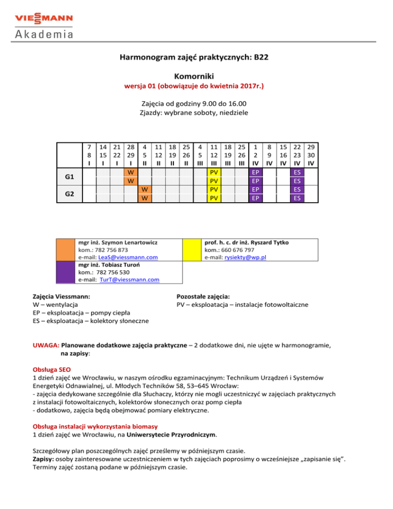Harmonogram zajęć praktycznych: B22 Komorniki wersja 01 (obowiązuje do kwietnia 2017r.) Zajęcia od godziny 9.00 do 16.00 Zjazdy: wybrane soboty, niedziele 7 8 I G1 G2 14 21 28 15 22 29 I I I W W 4 5 II 11 18 25 4 11 18 25 12 19 26 5 12 19 26 II II II III III III III PV PV W PV W PV mgr inż. Szymon Lenartowicz kom.: 782 756 873 e-mail: [email protected] mgr inż. Tobiasz Turoń kom.: 782 756 530 e-mail: [email protected] Zajęcia Viessmann: W – wentylacja EP – eksploatacja – pompy ciepła ES – eksploatacja – kolektory słoneczne 1 8 15 22 29 2 9 16 23 30 IV IV IV IV IV EP ES EP ES EP ES EP ES prof. h. c. dr inż. Ryszard Tytko kom.: 660 676 797 e-mail: [email protected] Pozostałe zajęcia: PV – eksploatacja – instalacje fotowoltaiczne UWAGA: Planowane dodatkowe zajęcia praktyczne – 2 dodatkowe dni, nie ujęte w harmonogramie, na zapisy: Obsługa SEO 1 dzień zajęć we Wrocławiu, w naszym ośrodku egzaminacyjnym: Technikum Urządzeń i Systemów Energetyki Odnawialnej, ul. Młodych Techników 58, 53–645 Wrocław: - zajęcia dedykowane szczególnie dla Słuchaczy, którzy nie mogli uczestniczyć w zajęciach praktycznych z instalacji fotowoltaicznych, kolektorów słonecznych oraz pomp ciepła - dodatkowo, zajęcia będą obejmować pomiary elektryczne. Obsługa instalacji wykorzystania biomasy 1 dzień zajęć we Wrocławiu, na Uniwersytecie Przyrodniczym. Szczegółowy plan poszczególnych zajęć prześlemy w późniejszym czasie. Zapisy: osoby zainteresowane uczestniczeniem w tych zajęciach poprosimy o wcześniejsze „zapisanie się”. Terminy zajęć zostaną podane w późniejszym czasie. UWAGA. Aby otrzymać uprawnienia firmy Viessmann należy uczestniczyć w zajęciach Viessmann i zaliczyć je: - ewentualne nieobecności na zajęciach można odrobić z inną grupą lub w innym oddziale szkoły – po wcześniejszym uzyskaniu zgody prowadzącego dane zajęcia na ich odrabianie przez Słuchacza - odrobić zajęcia można również na szkoleniach organizowanych przez firmę Viessmann, które odbywają się w dni powszednie – Kalendarz szkoleń znajduje się na stronie: viessmann-szkolenia.pl; rejestrując się na dane szkolenie, w polu „nazwa firmy” proszę wpisać: Akademia Viessmann (dla Słuchaczy naszej szkoły szkolenia są bezpłatne) - po odbyciu szkolenia w firmie Viessmann, proszę o przesłanie takiej informacji na adres e-mail: [email protected], aby odnotować odrobienie danych zajęć praktycznych. Harmonogram zajęć praktycznych może ulec zmianie. Ewentualne pytania i wątpliwości prosimy kierować do Opiekuna kursu: Krzysztof Gnyra tel. 602 231 407 e-mail: [email protected]