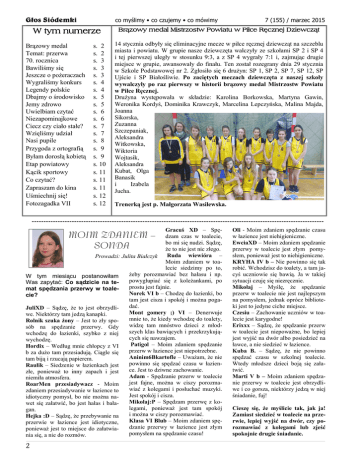 Głos Siódemki co myślimy • co czujemy • co mówimy 7 (155) / marzec 2015 _______________________________________________________________________________________________________________________________________________________________________________________________________________________________________________________________________________________________________________________________________________________________________________________ W tym numerze Brązowy medal Temat: przerwa 70. rocznica Bawiliśmy się Jeszcze o pożeraczach Wygraliśmy konkurs Legendy polskie Dbajmy o środowisko Jemy zdrowo Uwielbiam czytać Niezapominajkowe Ciecz czy ciało stałe? Wzięliśmy udział Nasi pupile Przygoda z ortografią Byłam dorosłą kobietą Etap powiatowy Kącik sportowy Co czytać? Zapraszam do kina Uśmiechnij się! Fotozagadka VII s. 2 s. 2 s. 3 s. 3 s. 3 s. 4 s. 4 s. 5 s. 5 s. 6 s. 6 s. 7 s. 7 s. 8 s. 9 s. 9 s. 10 s. 11 s. 11 s. 11 s. 12 s. 12 Brązowy medal Mistrzostw Powiatu w Piłce Ręcznej Dziewcząt 14 stycznia odbyły się eliminacyjne mecze w piłce ręcznej dziewcząt na szczeblu miasta i powiatu. W grupie nasze dziewczęta walczyły ze szkołami SP 2 i SP 4 i tej pierwszej uległy w stosunku 9:3, a z SP 4 wygrały 7:1 i, zajmując drugie miejsce w grupie, awansowały do finału. Ten został rozegrany dnia 29 stycznia w Szkole Podstawowej nr 2. Zgłosiło się 6 drużyn: SP 1, SP 2, SP 7, SP 12, SP Ujście i SP Białośliwie. Po zaciętych meczach dziewczęta z naszej szkoły wywalczyły po raz pierwszy w historii brązowy medal Mistrzostw Powiatu w Piłce Ręcznej. Drużyna występowała w składzie: Karolina Borkowska, Martyna Gawin, Weronika Kordyś, Dominika Krawczyk, Marcelina Lepczyńska, Malina Majda, Joanna Sikorska, Zuzanna Szczepaniak, Aleksandra Witkowska, Wiktoria Wojtasik, Aleksandra Kubat, Olga Banasik i Izabela Jucha. Trenerką jest p. Małgorzata Wasilewska. ---------------------------------------------------------------------------------------------------------------------------Gracuś XD – Spędzam czas w toalecie, bo mi się nudzi. Sądzę, że to nie jest nic złego. Ruda wiewióra – Prowadzi: Julita Białczyk Moim zdaniem w toalecie siedzimy po to, żeby porozmawiać bez hałasu i np. W tym miesiącu postanowiłam powygłupiać się z koleżankami, po Was zapytać: Co sądzicie na teprostu jest fajnie. mat spędzania przerwy w toaleNorek VI b – Chodzę do łazienki, bo cie? tam jest cisza i spokój i można pogadać. JuliXD – Sądzę, że to jest obrzydliMont gomery ;) VI – Denerwuje we. Niektórzy tam jedzą kanapki. mnie to, że kiedy wchodzę do toalety, Rolnik szuka żony – Jest to zły spowidzę tam mnóstwo dzieci z młodsób na spędzanie przerwy. Gdy szych klas bawiących i przekrzykująwchodzę do łazienki, szybko z niej cych się nawzajem. wychodzę. Patigol – Moim zdaniem spędzanie Hordix – Według mnie chłopcy z VI przerw w łazience jest niepotrzebne. b za dużo tam przesiadują. Ciągle się Aninim6Bkartofle – Uważam, że nie tam biją i rzucają papierem. powinno się spędzać czasu w łazienRaulik – Siedzenie w łazienkach jest ce. Jest to dziwne zachowanie. złe, ponieważ to inny zapach i jest Adam - Spędzanie przerw w toalecie niemiła atmosfera. jest fajne, można w ciszy porozmaRoarMen przesiadywacz - Moim wiać z kolegami i posłuchać muzyki. zdaniem przesiadywanie w łazience to Jest spokój i cisza. idiotyczny pomysł, bo nie można naMikołaj:P – Spędzam przerwę z kowet się załatwić, bo jest hałas i bałalegami, ponieważ jest tam spokój gan. i można w ciszy porozmawiać. Hejka :D – Sądzę, że przebywanie na Klasa VI Blub – Moim zdaniem spęprzerwie w łazience jest idiotyczne, dzanie przerwy w łazience jest złym ponieważ jest to miejsce do załatwiapomysłem na spędzanie czasu! nia się, a nie do rozmów. MOIM ZDANIEM – SONDA Oli - Moim zdaniem spędzanie czasu w łazience jest niehigieniczne. EwciaXD – Moim zdaniem spędzanie przerwy w toalecie jest złym pomysłem, ponieważ jest to niehigieniczne. KRYHA IV b – Nie powinno się tak robić. Wchodzisz do toalety, a tam jacyś uczniowie się bawią. Ja w takiej sytuacji czuję się niezręcznie. Mikołaj – Myślę, że spędzanie przerw w toalecie nie jest najlepszym na pomysłem, jednak oprócz biblioteki jest to jedyne ciche miejsce. Czesiu – Zachowanie uczniów w toalecie jest karygodne! Erixxx – Sądzę, że spędzanie przerw w toalecie jest niepoważne, bo lepiej jest wyjść na dwór albo posiedzieć na ławce, a nie siedzieć w łazience. Kuba B. – Sądzę, że nie powinno spędzać czasu w szkolnej toalecie. Wtedy młodsze dzieci boją się załatwić. Marti V b – Moim zdaniem spędzanie przerwy w toalecie jest obrzydliwe i co gorsza, niektórzy jedzą w niej śniadanie, fuj! Cieszę się, że myślicie tak, jak ja! Zamiast siedzieć w toalecie na przerwie, lepiej wyjść na dwór, czy porozmawiać z kolegami lub zjeść spokojnie drugie śniadanie. __________________________________________________________________________________________________________________________________________________________________________________________________________________________________________________________________________________________________________________________________________________________________________________________________________________________________________________________________________ 2