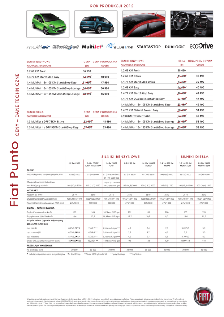 ROK PRODUKCJI 2012 START&STOP SILNIKI BENZYNOWE Fiat Punto CENY – DANE TECHNICZNE NADWOZIE 3 DRZWIOWE CENA C ENA PROMOCYJNA (z∏) OD (z∏) 1.2 69 KM Fresh 36 990 1.4 77 KM Start&Stop Easy 44 990 DUALOGIC SILNIKI BENZYNOWE NADWOZIE 5 DRZWIOWE 1.2 69 KM Fresh CENA CENA PROMOCYJNA (z∏) OD (z∏) 38 490 40 990 1.2 69 KM Estiva 41 490 36 490 51 990 47 990 1.4 77 KM Start&Stop Estiva 43 490 39 490 1.4 MultiAir 16v 105 KM Start&Stop Lounge 54 990 50 990 1.2 69 KM Easy 44 490 40 490 1.4 MultiAir 16v 135KM Start&Stop Lounge 56 990 1.4 77 KM Start&Stop Easy 46 490 42 490 1.4 77 KM Dualogic Start&Stop Easy 51 490 47 490 1.4 MultiAir 16v 105 KM Start&Stop Easy 53 490 49 490 1.4 70 KM Natural Power Easy 58 490 54 490 0.9 85KM TwinAir Turbo 52 490 48 490 1.4 MultiAir 16v 105 KM Start&Stop Easy SILNIKI DIESL A NADWOZIE 5 DRZWIOWE 60 990 CENA C ENA PROMOCYJNA (z∏) OD (z∏) 1.3 Multijet z DPF 75KM Estiva 52 490 48 490 1.4 MultiAir 16v 105 KM Start&Stop Lounge 56 490 52 490 1.3 Multijet II z DPF 95KM Start&Stop Easy 57 490 53 490 1.4 MultiAir 16v 135 KM Start&Stop Lounge 62 490 58 490 SILNIKI BENZYNOWE SILNIKI DIESLA 1,2 8v 69 KM 1,4 8v 77 KM/ 1,4 8v 77 KM MTA* 1,4 8v 70 KM CNG 0,9 8v 85 KM 1,4 16v 105 KM MultiAir 1,4 16v 135 KM MultiAir 1,3 16v 75 KM Multijet z DPF 1,3 16v 95 KM Multijet II z DPF 50 (69) 5500 57 (77) 6000 57 (77) 6000 benz. 62 (85) 5500 77 (105) 6500 99 (135) 5000 55 (75) 4000 70 (95) 4000 145 (14,8) 2000 130 (13,2) 4000 206 (21) 1750 190 (19,4) 1500 200 (20,4) 1500 SILNIK Moc maksymalna kW (KM) przy obr./min 51 (70) 6000 gaz Maksymalny moment obrotowy Nm (kGm) przy obr./min 115 (11,7) 3250 benz. 102 (10,4) 3000 115 (11,7) 3250 104 (10,6) 3000 gaz WYMIARY Rozstaw osi (mm) Długość/szerokość/wysokość (mm) 2510 2510 2510 2510 2510 2510 2510 2510 4065/1687/1490 4065/1687/1490 4065/1687/1490 4065/1687/1490 4065/1687/1490 4065/1687/1490 4065/1687/1490 4065/1687/1490 275/1030 275/1030 200/950 275/1030 275/1030 275/1030 275/1030 275/1030 Pojemność przestrzeni bagażowej (VDA, dm3) OSIĄGI – ZUŻYCIE PALIWA Prędkość maksymalna (km/h) 156 165 162 benz./156 gaz 172 185 200 165 178 Przyspieszenie (s) 0-100 km/h 14,4 13,2 14,9 benz./16,9 gaz 12,7 10,8 8,5 13,6 11,7 cykl miejski 6,6/6,7/7,2 7,4/6,7 ** 7,9 benz./5,4 gaz*** 4,9 7,4 7,3 5,2 /5,5 5,3 cykl pozamiejski 4,3/4,4/4,4 4,7/4,6 ** 5,4 benz./3,5 gaz*** 3,8 4,7 4,6 3,5 3,5 5,1/5,2/5,4 5,7/5,4 ** 6,3 benz./4,2 gaz*** 4,2 5,7 5,6 4,1 /4,2 4,2 119/123/126 132/124 ** 149 benz./115 gaz 98 133 129 108 /112 110 30 000 30 000 30 000 30 000 30 000 30 000 35 000 Zużycie paliwa (zgodnie z dyrektywą 2004/3/WE (l/100 km) cykl mieszany Emisje CO2 w cyklu mieszanym (g/km) PRZEGLĄDY OKRESOWE Po przebiegu (km) z dłuższymi przełożeniami skrzyni biegów 30 000 z Start&Stop * Wersja MTA tylko dla 5D ** przy Dualogic *** kg/100km Wszystkie samochody osobowe marki Fiat (z wyłączeniem Sedici) sprzedane od 1.01.2012 i zakupione w punktach sprzedaży dealerów Fiata w Polsce, posiadają 2-letnią gwarancję bez limitu kilometrów. W całym okresie ważności tej gwarancji Klient otrzymuje usługę ASSISTANCE 24h, ważną na terenie całej Europy. Podane informacje na temat gwarancji pojazdu nie stanowią udzielenia kupującemu gwarancji, w szczególności w rozumieniu art. 13 Ustawy z dnia 27 lipca 2002 r. o szczególnych warunkach sprzedaży konsumenckiej oraz o zmianie Kodeksu cywilnego. Gwarancja zostanie udzielona przy sprzedaży pojazdu, a jej warunki zostaną określone w dokumencie gwarancyjnym. Fiat zastrzega sobie prawo do wprowadzenia w dowolnym momencie zmian w modelach opisanych w niniejszym cenniku z powodów natury technicznej lub handlowej. Szczegóły w salonie sprzedaży. ROK PRODUKCJI 2012 009 407 733 228 028 421 011 878 48F 500 502 082 048 4GE 052 692 5EM 5M1 112 182 499 008 018 023 025 041 070 097 108 132 140 150 195 208 212 320 347 352 365 388 392 400 410 416 41A 42F 433 434 435 439 450 452 4AY 4GA 4GS 4J3 4JF 4M5 4SU 4UE 4YD 505 508 511 52Y 5DE 5IY 5J8 5J9 614 61A 623 65W 68R 6L2 710 823 923 926 976 980 989 FRESH ESTIVA EASY TWINAIR LOUNGE • – – • • – • • • • • – • – • • – – • • • 500 zł – – 4 000 zł 550 zł – 800 zł 1 000 zł – – – 650 zł 1 000 zł – 500 zł – 50 zł – 400 zł 1 000 zł – – – 1 200 zł – – – – – 650 zł 1 000 zł – 0 zł – 990 zł – 350 zł – 200 zł – 1 250 zł – 400 zł – 1 000 zł 250 zł – – 1 550 zł 100 zł – – 250 zł – – 400 zł – – 100 zł 250 zł 250 zł • – –/• • • – • • • • • • • – • • – – • • • • – – • 550 zł – 800 zł 1 000 zł – – – 650 zł 1 000 zł – 500 zł – 50 zł – 400 zł 1 000 zł – – – 1 200 zł – – – – – 650 zł 1 000 zł – 0 zł – 990 zł – 350 zł – 200 zł – 1 250 zł – 400 zł –/ 500 zł 1 000 zł/• 250 zł – – 1 550 zł 100 zł – – 250 zł – – 400 zł – – • 250 zł 250 zł • –/• –/• • • – • • • • • • • – • • • – • • • • 200 zł –/ 850 zł • 550 zł 500 zł 800 zł 1 000 zł 550 zł 2 500 zł 500 zł • 1 000 zł 4 500 zł • 650 zł • –/ 850 zł 400 zł 1 000 zł/• 4 000 zł 500 zł 1 500 zł • 600 zł –/ 1 900 zł –/ 1 900 zł –/ 1 900 zł 1 500 zł • 1 000 zł 1 500 zł 0 zł – – –/ 1 000 zł 350 zł – –/ 200 zł 250 zł 1 250 zł 1 300 zł 400 zł –/ 500 zł –/• –/ 250 zł 250 zł 250 zł • • 750 zł 990 zł 250 zł –/ 350 zł – 400 zł 500 zł 750 zł • –/250 zł 250 zł • – – • • • • – • • • • • • • • • – • • • • 200 zł 850 zł • • 500 zł 800 zł – 550 zł 2 500 zł 500 zł • – 4 500 zł • 650 zł • 850 zł 400 zł 1 000 zł 4 000 zł 500 zł 1 500 zł • 600 zł 1 900 zł 1 900 zł 1 900 zł 1 500 zł • 1 000 zł 1 500 zł 0 zł 1 000 zł – 1 000 zł 350 zł – 200 zł 250 zł 1 25