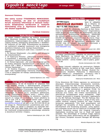 Tygodnik Nenckiego Numer 7 (100) Rok III 19 lutego 2007 Nakład: 380 egz. Szanowni Państwo, Oto setny numer TYGODNIKA NENCKIEGO. Mamy nadzieję, że jest on przydatnym forum wymiany informacji w naszym Instytucie. Dziękujemy serdecznie p. Justynie Osmulskiej oraz p. Agnieszce Kowaluk za sto złożeń tygodnika! Dyrekcja Instytutu Rada Naukowa 23 lutego (piątek) odbędzie się kolejne posiedzenie Rady Naukowej Instytutu Nenckiego. Pierwsza część posiedzenia, rozpoczynająca się o godz. 10:30, będzie częścią otwartą, poświęconą sprawozdaniu z działalności Instytutu za rok 2006. Przewidywane są prezentacje wybranych osiągnięć naukowych oraz wystąpienie dyrektora Instytutu, prof. Jerzego Duszyńskiego. Oto nazwiska wybranych osób wraz z tytułami ich wystąpień: 1. Dr Mariusz Więckowski: „Czy p66Shc jest przyjazne dla mitochondriów?; 2. Dr Katarzyna Piwocka: „Zaburzenia kontroli mitozy w komórkach z ekspresją Bcr-Abl - rola w progresji nowotworu i śmierci komórkowej”; 3. Dr Michał Dąbrowski: „Od wzorców ekspresji genów do analizy obszarów regulatorowych – rola miejsc wiążących E2F i NR2F w wyciszaniu ekspresji w trakcie rozwoju hipokampa”; 4. Dr Ewelina Knapska: „Zróżnicowanie aktywności jąder ciała migdałowatego mierzonej ekspresją białka c-Fos w zależności od rodzaju zastosowanej stymulacji emocjonalnej” Jolanta Rędowicz (tel. 456) Dział Współpracy z Zagranicą Przypominamy, że do 16 kwietnia br. placówki PAN mogą składać wnioski o dofinansowanie projektów naukowych w ramach Norweskiego Mechanizmu Finansowego i Mechanizmu Finansowego EOG. Szczegółowe informacje na temat wdrażania tego mechanizmu finansowego w Polsce (m.in. procedura aplikacyjna, zasady finansowania, kryteria oceny i wyboru wniosków) przedstawione zostaną na szkoleniu, organizowanym 21 lutego br. w Krakowie. Koszt szkolenia to 190 zł (lub 170 zł, przy zapisie dwóch osób z jednej instytucji). Zapisy przyjmowane są pod adresem: [email protected] lub pod nr tel. 012 633-58-63 do 16 lutego br. Potwierdzeniem uczestnictwa jest wniesienie opłaty za udział w szkoleniu na rachunek bankowy nr 80 1020 2892 0000 5302 0187 3587. Istnieje też możliwość przeprowadzenia powyższego szkolenia w dowolnym terminie i miejscu. Joanna Kołodziejczyk (tel. 378) Kongres FEBS W dniach 7-12 lipca br odbędzie się w Wiedniu 32 Kongres Europejskich Towarzystw Biochemicznych Pt. „Molecular Machines & their Dynamics in Fundamental Cellular Functions”. Organizatorzy nadal dysponują stypendiami dla doktorantów oraz dla samodzielnych pracowników naukowych. DEADLINE dla tańszej opłaty konferencyjne mija 28 lutego. DEADLINE dla aplikacji o stypendia mija 31 marca. Organizatorzy obiecują, że znacząca liczba wykładowców zostanie wybrana ze zgłoszonych abstraktów (DEADLINE mija 28 lutego). Szczegółowe informacje o kongresie można przeczytać na stronie: www.febs2007.org Adam Szewczyk (tel. 269) Seminaria / Wykłady 19 lutego (poniedziałek) odbędzie się seminarium Zakładu Biochemii, na którym doc. dr hab. Jolanta Rędowicz wygłosi referat p.t.: „Molekularne podstawy ruchów komórki - omnia mobile”, sala II piętro, godzina 15.00 Dorota Janiszewska (tel. 250) 20 lutego (wtorek) odbędzie się seminarium Zakładu Biologii Komórki, na którym dr hab. nauk farm. Halina Ostrowska (Kierownik Zakładu Biologii, Wydział Farmaceutyczny Akademii Medycznej w Białymstoku) wygłosi referat p.t.: „Proteasomy - struktura i rola w fizjologii i patologii:, sala II piętro, godz. 14.30 Katarzyna Kwiatkowska (tel. 463) Firma Bioscience BD Polska zaprasza na seminarium dotyczące trójwymiarowego obrazowania komórek, które poprowadzi Pan Neil Vincent. Seminarium odbędzie się 27 lutego (wtorek) w sali konferencyjne na II piętrze. Otwarcie seminarium o godzinie 15.00. Po wykładzie ok. godziny 16.30 firma BD zaprasza na dyskusje przy kawie. Oto krótkie wprowadzenie do seminarium przygotowane przez prelegenta: “High Content Screening & Imaging Cytometry Applications on the BD Pathway Bioimager. The BD Pathway Bioimager instrument line comprises a range of fully automated confocal imaging systems for High Content Screening applications. This brief presentation will highlight the versatility of these systems for Assay Development and Screening purposes, using application examples across the full spectrum of possible High Content Screening assays and Imaging Cytometry Applications involving both live or fixed cell based samples. The advantages of Confocal image capture for improving assay performance will be highlighted.” Neil Vincent, European Account Manager BD Bioimaging Wanda Kłopocka (tel. 306) Instytut Biologii Doświadczalnej im. M. Nenckiego PAN ul. Pasteura 3, 02-093 Warszawa e-mail: [email protected] skład: Justyna Osmulska (tel. 486)