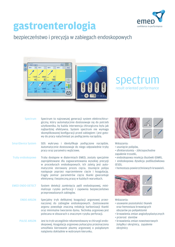 gastroenterologia bezpieczeństwo i precyzja w zabiegach endoskopowych spectrum result oriented performance Spectrum Spectrum to najnowszej generacji system elektrochirurgiczny, który automatycznie dostosowuje się do potrzeb użytkownika, by każda interwencja chirurgiczna była jak najbardziej efektywna. System spectrum nie wymaga skomplikowanej konfiguracji przed zabiegiem i jest gotowy do pracy natychmiast po podłączeniu narzędzia. SmartDevice System SDS wykrywa i identyfikuje podłączone narzędzie. Automatycznie dostosowuje do niego odpowiednie tryby pracy oraz parametry wyjściowe. Tryby endoskopowe Tryby dostępne w diatermiach EMED, zostały specjalnie zaprojektowane dla zagwarantowania wysokiej precyzji w procedurach endoskopowych. Ich zaletą jest automatycznie sterowany proces cięcia. Usunięcie polipa następuje poprzez naprzemienne cięcie i koagulację. Ciągły pomiar parametrów cięcia tkanki gwarantuje efektywną i bezpieczną pracę w każdych warunkach. EMED ENDO-DETECT System detekcji zamknięcia pętli endoskopowej, minimalizuje ryzyko perforacji i zapewnia bezpieczeństwo przeprowadzanych zabiegów. ENDO ARGON Specjalny tryb delikatnej koagulacji argonowej przeznaczonej do zabiegów endoskopowych. Zastosowanie argonu powoduje znaczną redukcję karbonizacji tkanki oraz minimalne tworzenie dymu. Technika argonowa jest polecana w obszarach o znacznym ryzyku perforacji. PULSE ARGON Jest to tryb szczególnie rekomendowany w chirurgii endoskopowej. Koagulacja argonowa pulsacyjna przeznaczona umożliwia kierowanie plazmy argonowej o pożądanym natężeniu dokładnie w wybranym kierunku. Wskazania: • usunięcie polipów, • sfinkterotomia – żółciopochodne zapalenie trzustki, • endoskopowa resekcja śluzówki (EMR), • endoskopowa dysekcja podśluzówkowa (ESD), • hemostaza powierzchniowych krwawień. Wskazania: • usuwanie pozostałości tkanek oraz hemostaza krwawiących obszarów po polipektomii • krwawienia zmian angiodysplastycznych • przerost stentów • krwawienia zmian nowotworowych żołądka i okrężnicy, zapalenie okrężnicy Pętla do polipektomii owalna, kanał rob. 2,3mm E 17/25 owalna duża, Ø 40mm E 17/23 owalna średnia, Ø 30mm E 17/22 owalna mała, Ø 25mm Pętla do polipektomii heksagonalna, kanał rob. 2,3mm 100-013 Aparat Elektrochirurgiczny spectrum E 18/25 hexagonalna duża, Ø 40mm E 18/23 hexagonalna średnia, Ø 30mm E 18/22 hexagonalna mała, Ø 25mm R1-100 Rączka sterująca do pętli E30-2 - Papillotom podstawowy, dł. cięciwy 25mm, do rękojeści R2-50 E30-3 - Papillotom podstawowy, dł. cięciwy 30mm R2-50 Rączka sterująca do papillotomu 080-100 Wózek SpectrumLine do aparatów EMED, z szafką na butle argonowe (2x 5L/10L), koszyk 281-03S Kabel monopolarny do narzędzi endoskopowych, dł. 3m, gniazdo żeńskie 3mm, wtyk SDS Giętka sonda argonowa, wielorazowa 932-148 Ø 1.5 mm, długość 1.5m 932-149 Ø 2.3 mm, długość 2.2 m 932-150 Ø 3.2 mm, długość 2.2 m 932-151 Ø 1.5 mm, długość 3 m 932-152 Ø 2.3 mm, długość 3 m 100-313 Włącznik nożny 2-przyciskowy MultiSwitch, bezprzewodowy 432-46S Kabel monopolarny do giętkiej elektrody argonowej, dł. 3,5m, wtyk SDS /LuerLock, złącze owalne Pełen wybór akcesoriów znajdą Państwo w naszym katalogu. Więcej informacji u przedstawicieli regionalnych i na stronie www.emed.pl EMED SP. Z O. O. SP. K. | ul. Ryżowa 69a | 05-816 Opacz Kolonia tel: +48 (22) 723 08 00 | fax: +48 (22) 723 00 81 | email: [email protected] | www.emed.pl Listopad 2014