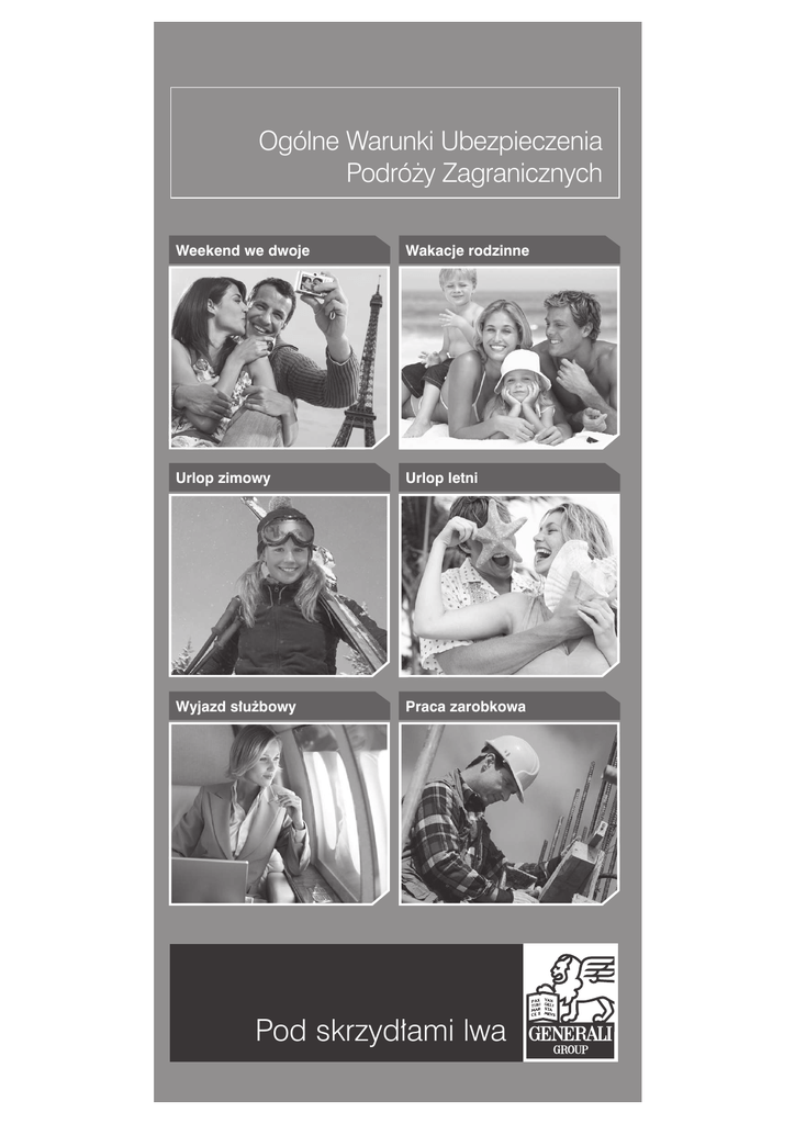 Ogólne Warunki Ubezpieczenia Podró˝y Zagranicznych Weekend we dwoje Wakacje rodzinne Urlop zimowy Urlop letni Wyjazd s∏u˝bowy Praca zarobkowa Pod skrzyd∏ami lwa SPIS TREŒCI OGÓLNE WARUNKI UBEZPIECZENIA PODRÓ¯Y ZAGRANICZNYCH 1. 2. 3. 4. 5. 6. ZAKRES UBEZPIECZENIA ............................................................................3 DEFINICJE .....................................................................................................3 ZAWARCIE UMOWY UBEZPIECZENIA .........................................................8 ZAKRES OCHRONY ......................................................................................8 RODZAJE UMÓW UBEZPIECZENIA .............................................................9 UMOWA UBEZPIECZENIA ZAWARTA W FORMIE POLISY OTWARTEJ ....................................................................9 7. POCZ¥TEK I KONIEC ODPOWIEDZIALNOŒCI ...........................................10 8. ODST¥PIENIE OD UMOWY UBEZPIECZENIA ............................................11 9. SK£ADKA UBEZPIECZENIOWA ..................................................................11 10. ŒWIADCZENIA .............................................................................................12 11. ROSZCZENIE REGRESOWE .......................................................................13 UBEZPIECZENIE KOSZTÓW LECZENIA I POMOCY ASSISTANCE 12. 13. 14. 15. PRZEDMIOT I ZAKRES UBEZPIECZENIA KLiASS .....................................13 SUMA UBEZPIECZENIA KLiASS .................................................................22 WY£¥CZENIA ODPOWIEDZIALNOŒCI W ZAKRESIE KLiASS ..................22 POSTÊPOWANIE PRZY WYST¥PIENIU ZDARZENIA W RAMACH KLiASS ....................................................................................24 UBEZPIECZENIE NASTÊPSTW NIESZCZÊŒLIWYCH WYPADKÓW 16. 17. 18. 19. 20. 21. PRZEDMIOT I ZAKRES UBEZPIECZENIA NNW .........................................25 USTALENIE ŒWIADCZEÑ W RAMACH NNW .............................................27 PRZESZKOLENIE ZAWODOWE INWALIDÓW ............................................28 SUMA UBEZPIECZENIA NNW ....................................................................28 WY£¥CZENIA ODPOWIEDZIALNOŒCI W RAMACH NNW .........................28 POSTÊPOWANIE PRZY WYST¥PIENIU ZDARZENIA W RAMACH NNW ........................................................................................30 UBEZPIECZENIE ODPOWIEDZIALNOŒCI CYWILNEJ W ¯YCIU PRYWATNYM ZA SZKODY NA OSOBIE I NA RZECZY 22. 23. 24. 25. PRZEDMIOT I ZAKRES UBEZPIECZENIA OC ............................................30 SUMA UBEZPIECZENIA OC .......................................................................31 WY£¥CZENIA ODPOWIEDZIALNOŒCI W RAMACH OC ............................31 POSTÊPOWANIE PRZY WYST¥PIENIU ZDARZENIA W RAMACH OC .....32 UBEZPIECZENIE BAGA¯U PODRÓ¯NEGO 26. 27. 28. 29. 30. 31. 32. PRZEDMIOT I ZAKRES UBEZPIECZENIA BP .............................................33 OPÓ;NIENIE W DOSTARCZENIU BAGA¯U PODRÓ¯NEGO .....................34 SUMA UBEZPIECZENIA BP ........................................................................34 WY£¥CZENIA ODPOWIEDZIALNOŒCI W RAMACH BP ...........................34 POSTÊPOWANIE PRZY WYST¥PIENIU ZDARZENIA W RAMACH BP ......35 USTALENIE WYSOKOŒCI ODSZKODOWANIA W RAMACH BP ................36 ODZYSKANIE SKRADZIONYCH LUB ZAGUBIONYCH PRZEDMIOTÓW .......................................................37 1 UBEZPIECZENIE SPRZÊTU SPORTOWEGO 33. 34. 35. 36. 37. 38. PRZEDMIOT I ZAKRES UBEZPIECZENIA SS .............................................37 SUMA UBEZPIECZENIA SS ........................................................................39 WY£¥CZENIA ODPOWIEDZIALNOŒCI W RAMACH SS .............................38 POSTÊPOWANIE PRZY WYST¥PIENIU ZDARZENIA W RAMACH SS .....39 USTALENIE WYSOKOŒCI ODSZKODOWANIA W RAMACH SS ................40 ODZYSKANIE SKRADZIONYCH LUB ZAGUBIONYCH PRZEDMIOTÓW .......................................................40 UBEZPIECZENIE KOSZTÓW ODWO£ANIA UCZESTNICTWA W ZAGRANICZNEJ IMPREZIE TURYSTYCZNEJ LUB TE¯ WCZEŒNIEJSZEGO Z NIEJ POWROTU 39. 40. 41. 42. 43. PRZEDMIOT I ZAKRES UBEZPIECZENIA OI ..............................................40 SUMA UBEZPIECZENIA OI .........................................................................41 WY£¥CZENIA ODPOWIEDZIALNOŒCI W RAMACH OI ..............................42 USTALENIE WYSOKOŒCI ODSZKODOWANIA W RAMACH OI .................42 POSTÊPOWANIE PRZY WYST¥PIENIU ZDARZENIA W RAMACH OI ......43 UBEZPIECZENIE KOSZTÓW ODWO£ANIA NOCLEGÓW 44. 45. 46. 47. PRZEDMIOT I ZAKRES UBEZPIECZENIA ON ............................................43 SUMA UBEZPIECZENIA ON .......................................................................44 WY£¥CZENIA ODPOWIEDZIALNOŒCI W RAMACH ON ............................44 POSTÊPOWANIE PRZY WYST¥PIENIU ZDARZENIA W RAMACH ON ...........................................................................................45 UBEZPIECZENIE KOSZTÓW ODWO£ANIA BILETU LOTNICZEGO 48. 49. 50. 51. PRZEDMIOT I ZAKRES UBEZPIECZENIA OB ............................................45 SUMA UBEZPIECZENIA OB ........................................................................46 WY£¥CZENIA ODPOWIEDZIALNOŒCI W RAMACH OB ............................46 POSTÊPOWANIE PRZY WYST¥PIENIU ZDARZENIA W RAMACH OB ...........................................................................................47 52. POSTANOWIENIA KOÑCOWE ....................................................................47 2 OGÓLNE WARUNKI UBEZPIECZENIA PODRÓ¯Y ZAGRANICZNYCH § 1 ZAKRES UBEZPIECZENIA 1. 2. 3. 4. Niniejsze Ogólne Warunki Ubezpieczenia Podró¿y Zagranicznych, zwane dalej OWU, stosuje siê do umów ubezpieczenia zawieranych pomiêdzy Generali Towarzystwo Ubezpieczeñ Spó³ka Akcyjna (Ubezpieczyciel), zwanym dalej Generali a osobami fizycznymi, prawnymi lub jednostkami organi