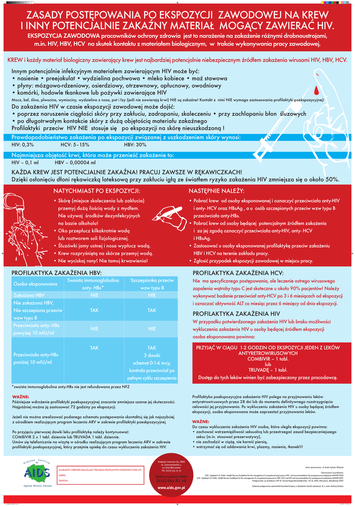 ZASADY POSTĘPOWANIA PO EKSPOZYCJI ZAWODOWEJ NA KREW I INNY POTENCJALNIE ZAKAŹNY MATERIAŁ MOGĄCY ZAWIERAĆ HIV. EKSPOZYCJA ZAWODOWA pracowników ochrony zdrowia jest to narażenie na zakażenie różnymi drobnoustrojami, m.in. HIV, HBV, HCV na skutek kontaktu z materiałem biologicznym, w trakcie wykonywania pracy zawodowej. KREW i każdy materiał biologiczny zawierający krew jest najbardziej potencjalnie niebezpiecznym źródłem zakażenia wirusami HIV, HBV, HCV. Innym potencjalnie infekcyjnym materiałem zawierającym HIV może być: • nasienie • preejakulat • wydzielina pochwowa • mleko kobiece • maź stawowa • płyny: mózgowo-rdzeniowy, osierdziowy, otrzewnowy, opłucnowy, owodniowy • komórki, hodowle tkankowe lub pożywki zawierające HIV Mocz, kał, ślina, plwocina, wymiociny, wydzielina z nosa, pot i łzy (jeśli nie zawierają krwi) NIE są zakaźne! Kontakt z nimi NIE wymaga zastosowania profilaktyki poekspozycyjnej! Do zakażenia HIV w czasie ekspozycji zawodowej może dojść: • poprzez naruszenie ciągłości skóry przy zakłuciu, zadrapaniu, skaleczeniu • przy zachlapaniu błon śluzowych • po długotrwałym kontakcie skóry z dużą objętością materiału zakaźnego Profilaktyki przeciw HIV NIE stosuje się po ekspozycji na skórę nieuszkodzoną ! Prawdopodobieństwo zakażenia po ekspozycji związanej z uszkodzeniem skóry wynosi: HIV: 0,3% HCV: 5–15% HBV: 30% Najmniejsza objętość krwi, która może przenieść zakażenie to: HIV – 0,1 ml HBV – 0,00004 ml KAŻDA KREW JEST POTENCJALNIE ZAKAŹNA! PRACUJ ZAWSZE W RĘKAWICZKACH! Dzięki osłonięciu dłoni rękawiczką lateksową przy zakłuciu igłą ze światłem ryzyko zakażenia HIV zmniejsza się o około 50%. NATYCHMIAST PO EKSPOZYCJI: NASTĘPNIE NALEŻY: • Skórę (miejsce skaleczenia lub zakłucia) przemyj dużą ilością wody z mydłem. Nie używaj środków dezynfekcyjnych na bazie alkoholu! • Oko przepłucz kilkakrotnie wodą lub roztworem soli fizjologicznej. • Śluzówki jamy ustnej i nosa wypłucz wodą. • Krew rozpryśniętą na skórze przemyj wodą. • Nie wyciskaj rany! Nie tamuj krwawienia! • Pobrać krew od osoby eksponowanej i oznaczyć przeciwciała anty-HIV i anty- HCV oraz HBsAg , a u osób szczepionych przeciw wzw typu B przeciwciała anty-HBs. • Pobrać krew od osoby będącej potencjalnym źródłem zakażenia i za jej zgodą oznaczyć przeciwciała anty-HIV, anty- HCV i HBsAg. • Zastosować u osoby eksponowanej profilaktykę przeciw zakażeniu HBV i HCV na terenie zakładu pracy. • Zgłosić przypadek ekspozycji zawodowej w miejscu pracy. PROFILAKTYKA ZAKAŻENIA HBV: Osoba eksponowana Zakażona HBV Nie zakażona HBV, Nie szczepiona przeciw wzw typu B Przeciwciała anty- HBs powyżej 10 mIU/ml PROFILAKTYKA ZAKAŻENIA HCV: Swoista immunoglobulina anty- HBs* NIE Szczepionka przeciw wzw typu B NIE TAK TAK Przeciwciała anty-HBs poniżej 10 mIU/ml Nie ma specyficznego postępowania, ale leczenie ostrego wirusowego zapalenia wątroby typu C jest skuteczne u około 90% pacjentów! Należy wykonywać badanie przeciwciał anty-HCV po 3 i 6 miesiącach od ekspozycji i oznaczać aktywność ALT co miesiąc przez 6 miesięcy od dnia ekspozycji. PROFILAKTYKA ZAKAŻENIA HIV W przypadku potwierdzonego zakażenia HIV lub braku możliwości wykluczenia zakażenia HIV u osoby będącej źródłem ekspozycji osoba eksponowana powinna: NIE NIE TAK TAK 3 dawki schemat 0-1-6 m-cy, kontrola przeciwciał po pełnym cyklu szczepienia PRZYJĄĆ W CIĄGU 1-2 GODZIN OD EKSPOZYCJI JEDEN Z LEKÓW ANTYRETROWIRUSOWYCH COMBIVIR – 1 tabl. lub TRUVADĘ – 1 tabl. Dostęp do tych leków winien być zabezpieczony przez pracodawcę. *swoista immunoglobulina anty-HBs nie jest refundowana przez NFZ WAŻNE: Późniejsze wdrożenie profilaktyki poekspozycyjnej znacznie zmniejsza szanse jej skuteczności. Najpóźniej można ją zastosować 72 godziny po ekspozycji. Jeżeli nie można zrealizować podanego schematu postępowania skontaktuj się jak najszybciej z ośrodkiem realizującym program leczenia ARV w zakresie profilaktyki poeskpozycyjnej. Po przyjęciu pierwszej dawki leku profilaktykę należy kontynuować: COMBIVIR 2 x 1 tabl. dziennie lub TRUVADA 1 tabl. dziennie. Umów się telefonicznie na wizytę w ośrodku realizującym program leczenia ARV w zakresie profilaktyki poekspozycyjnej, który przejmie opiekę do czasu wykluczenia zakażenia HIV. NAJBLIŻSZY OŚRODEK REALIZUJĄCY PROGRAM PROFILAKTYKI POEKSPOZYCYJNEJ HIV ADRES: TELEFON: Krajowe Centrum ds. AIDS ul. Samsonowska 1, 02-829 Warszawa Tel. (022) 331 77 77 Telefon zaufania AIDS: (022) 692 82 26 www.aids.gov.pl plakat drukNOWY.indd 1 Profilaktyka poekspozycyjna zakażenia HIV polega na przyjmowaniu leków antyretrowirusowych przez 28 dni lub do momentu definitywnego rozstrzygnięcia celowości jej przyjmowania. Po wykluczeniu zakażenia HIV u osoby będącej źródłem ekspozycji, osoba eksponowana może zaprzestać przyjmowania leków. WAŻNE: Do czasu wykluczenia zakażenia HIV osoba, która uległa ekspozycji powinna: • zachować wstrzemięźliwość seksualną lub przestrzegać zasad bezpieczniejszego seksu (m.in. stosować prezerwatywy), • nie zachodzić w ciążę, nie karmić piersią, • wstrzymać się od oddawania krwi, plazmy, nasienia, tkanek!!! Autor opracowania: dr Aneta Cybula- Walczak Opracowano na podstawie: CDC. Updated U.S. Public Health Service Guidelines for the managment of occupational exposures to HIV and recommendations for postexposure prophylaxis.MMWR 2005 CDC. Updated U.S. Public Health Service Guidelines for the management of occupational exposures to HBV, HCV and HIV and recommendation for postexposure prophylaxis MMWR 2001 Postępowanie po kontakcie z HIV dr Dorota Rogowska-Szadkowska KC ds. AIDS, Warszawa, aktualizacja 2007 Schemat postępowania zatwierdził konsultant krajowy w dziedzinie chorób zakaźnych: dr n. med. Andrzej Horban 16-07-07 13:19:41