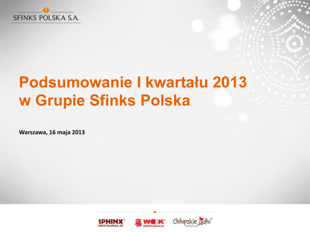 Podsumowanie I kwartału 2013 w Grupie Sfinks Polska Warszawa, 16 maja 2013 I kwartał 2013 w skrócie • Dalsza poprawa rentowności sieci • Dokapitalizowanie w wyniku emisji obligacji zamiennych i akcji (6,02 mln zł) • Rozwój sieci (otwarcie 3 restauracji, kolejne w przygotowaniu) • Chłopskie Jadło w najnowszej odsłonie (Luboń, Annopol) • Nowe menu w sieci Sphinx • Telewizyjna kampania reklamowa • Prace nad nowym menu w WOOK 2 Warszawa, 16 maja 2013 r. Skonsolidowane wyniki finansowe 1 kw. 2013 1 kw. 2012 PLN ‘000 PLN ‘000 Przychody ze sprzedaży 40 143 41 008 Koszt własny sprzedaży (35 645) 37 308 Zysk (strata) brutto na sprzedaży 4 498 3 700 Zysk (strata) na działalności operacyjnej (154) (1 505) (1 580) (3 279) 639 1 184 Zysk (strata) netto Zysk (strata) netto przypadający akcjonariuszom mniejszościowym 3 Warszawa, 16 maja 2013 r. Skonsolidowana sprzedaż 45 Skonsolidowane przychody ze sprzedaży (w mln zł) 40 Skonsolidowane koszty własne sprzedaży (w mln zł) 38 37 35 -4,5% 36 35 41,01 30 40,14 34 33 25 37,31 35,65 32 31 30 20 1 kw. 2012 1 kw. 2013 1 kw. 2012 1 kw. 2013 I kwartał – relatywnie trudniejszy sprzedażowo okres dla gastronomii ze względu na niższą liczbę dni roboczych i pogodę Styczeń-marzec 2013 – surowa zima, Wielkanoc – nieczynne centra handlowe 4 Warszawa, 16 maja 2013 r. Dalsza poprawa rentowności sieci 5 4,5 Skonsolidowany zysk brutto ze sprzedaży (w mln zł) 4 +22% 3,5 3 2,5 2 4,5 3,7 1,5 1 0,5 0 1 kw. 2012 5 Warszawa, 16 maja 2013 r. 1 kw. 2013 Wyższa rentowność sieci własnych restauracji – potencjał poprawy wyników sieci franczyzowej Wynik operacyjny i wynik netto w I kw. 2013 Skonsolidowany wynik operacyjny (w mln zł) 0 Skonsolidowany wynik netto (w mln zł) 0 1 kw. 2012 -0,2 1 kw. 2013 -0,15 1 kw. 2012 1 kw. 2013 -0,5 -1,58 -0,4 -1 -0,6 -0,8 -1,51 -1,5 +90% -3,28 -2 -1 -2,5 -1,2 -3 -1,4 -3,5 6 Warszawa, 16 maja 2013 r. +52% Dokapitalizowanie spółki Zobowiązanie wynikające z nowego porozumienia z PKO BP i ING Bankiem Śląskim Termin: marzec 2013 Kwota: 6,02 mln zł Forma: 2,21 mln akcji o wartości 3,02 mln zł oraz 3 tys. obligacji zamiennych na akcje o wartości 3 mln zł Emisje zrealizowane na podstawie uchwał ZWZ z 2012 oraz 2011 7 Warszawa, 16 maja 2013 r. Rozwój sieci restauracji w 2013 r. Powrót do lokalizacji prestiżowych i generujących wysoką sprzedaż Zrealizowane otwarcia: Factory Annopol (x2), Factory Luboń, Galeria Krakowska (II kw.) Wzrost możliwości inwestycyjnych dzięki umowie z bankami W przygotowaniu: Warszawa Galeria Mokotów (x2), Poznań City Center, Wrocław Futura Park – pierwsza wolnostojąca restauracja Sphinx 8 Warszawa, 16 maja 2013 r. Negocjacje dot. kolejnych atrakcyjnych lokalizacji Działania prosprzedażowe w sieciach Zmiany organizacyjne w restauracjach umożliwiające wzrost sprzedaży (liczba stolików, rotacja klientów etc.) Kampanie promocyjne w mediach ogólnopolskich Współpraca marketingowa z dostawcami Średni rachunek w całej sieci Sfinks Polska (w zł, I kw. 2013) 58 57 56 55 54 57 53 52 51 50 52 52 2010 2011 53 49 2012 2013 Promocje okolicznościowe Wzrost średniego rachunku we wszystkich sieciach 9 Warszawa, 16 maja 2013 r. Sphinx - nowe menu i kampania w TV 10 Warszawa, 16 maja 2013 r. Chłopskie Jadło – przygotowania do rozwoju 11 V-VI 2012 Rebranding i zmiana oferty Nowe logo i elementy wizerunkowe, zmiany w wystroju, nowe menu VII-XII 2012 Ocena wprowadzonych zmian Wzrost sprzedaży i wzrost średniego rachunku o ok. 10% I-III 2013 Dalsza uniwersalizacja konceptu – możliwość powielania i rozwój Otwarcie 2 restauracji w zupełnie nowym wystroju – nowoczesny folk 2013 Doskonalenie konceptu Dalszy rozwój sieci i poprawa wyników Warszawa, 16 maja 2013 r. Chłopskie Jadło – nowoczesny folk Zdecydowanej większości ankietowanych klientów Chłopskiego Jadła podobał się nowy wystrój restauracji Czy podoba się Pani/Panu wystrój restauracji Chłopskie Jadło? (III-IV 2013) 70 60 56 58 50 40 32 35 30 20 10 3 0 2 7 4 3 0 Zdecydowanie nie Raczej nie Trudno powiedzieć Luboń 12 Warszawa, 16 maja 2013 r. Raczej tak Annopol Zdecydowanie tak Źródło: Sfinks Polska WOOK I półrocze 2013 - prace nad nowym menu 2013 Prace nad konceptem, by zapewnić jego powtarzalność, poprawę rentowności oraz rozwój sieci Bieżące działania prosprzedażowe (np. Dni Kuchni Tajskiej pod patronatem Ambasady Tajlandii) 13 Warszawa, 16 maja 2013 r. Zadania na kolejne kwartały 2013 14 • Rozwój sieci restauracji dzięki większym możliwościom inwestycyjnym (niższe koszty finansowe, dokapitalizowanie) • Coraz większa obecność marek w prestiżowych i wysokosprzedażowych lokalizacjach • Dalsza poprawa wyników sieci restauracji oraz grupy • Inwestycje w marketing (kampanie telewizyjne sieci Sphinx) oraz działania prosprzedażowe dotyczące wszystkich marek • Doskonalenie konceptu Chłopskiego Jadła w kierunku uniwersalizacji, by ułatwić jego sprawny rozwój • Analiza konceptu WOOK i opracowanie planu rozwoju oraz poprawy wyników tej sieci Warszawa, 16 maja 2013 r. Dziękujemy za uwagę 15