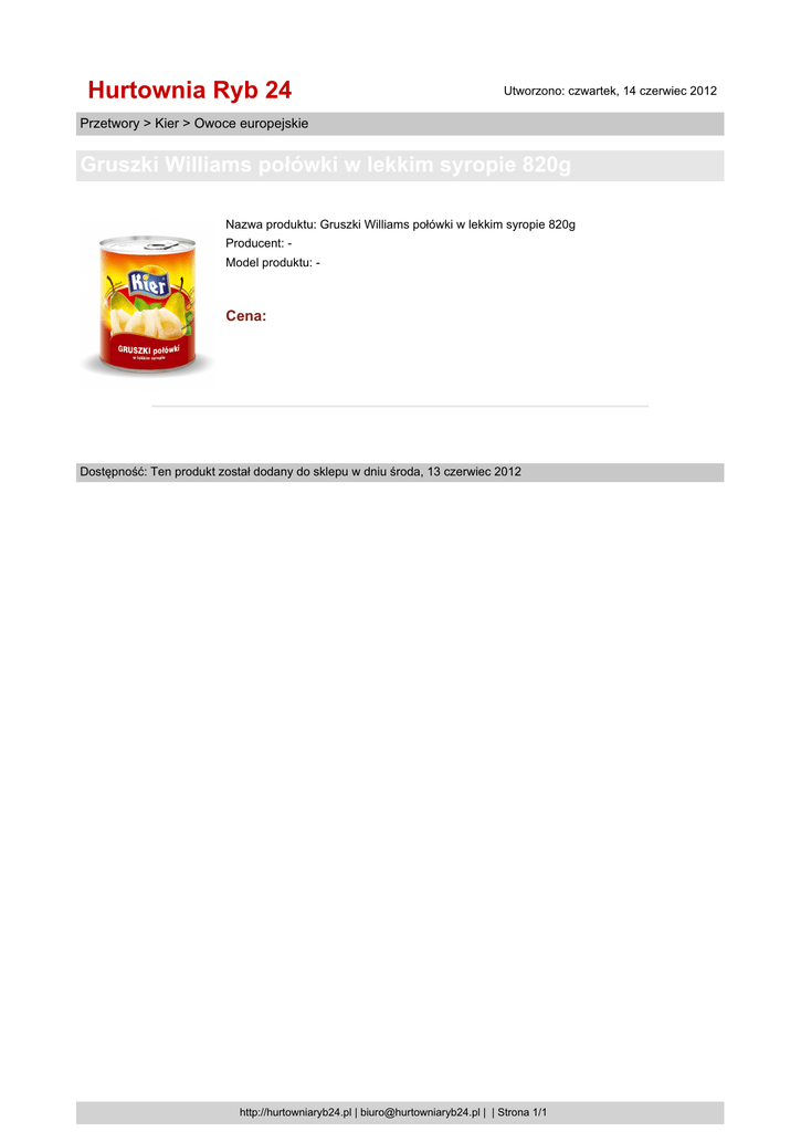 Hurtownia Ryb 24 Utworzono: czwartek, 14 czerwiec 2012 Przetwory > Kier > Owoce europejskie Gruszki Williams połówki w lekkim syropie 820g Nazwa produktu: Gruszki Williams połówki w lekkim syropie 820g Producent: Model produktu: - Cena: Dostępność: Ten produkt został dodany do sklepu w dniu środa, 13 czerwiec 2012 http://hurtowniaryb24.pl | [email protected] | | Strona 1/1