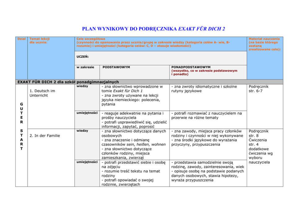 PLAN WYNIKOWY DO PODRĘCZNIKA EXAKT FÜR DICH 2 Dział Temat lekcji dla ucznia: Cele szczegółowe (czynności do opanowania przez ucznia/grupę w zakresie wiedzy (kategoria celów A- wie, Brozumie) i umiejętności (kategoria celów: C, D – stosuje wiadomości) Materiał nauczania (na bazie którego zostaną zrealizowane cele): UCZEŃ: w zakresie PODSTAWOWYM EXAKT FÜR DICH 2 dla szkół ponadgimnazjalnych wiedzy - zna słownictwo wprowadzone w 1. Deutsch im tomie Exakt für Dich 1 Unterricht - zna zwroty używane na lekcji języka niemieckiego: polecenia, G pytania U umiejętności - reaguje adekwatnie na pytania i T E prośby nauczyciela R - potrafi usprawiedliwić się, udzielić informacji, zapytać, poprosić wiedzy S - zna słownictwo dotyczące danych T 2. In der Familie osobowych A - zna znaczenie i odmianę R czasowników sein, heißen, wohnen T - zna słownictwo dotyczące członków rodziny, miejsca zamieszkania, zwierząt umiejętności - potrafi przedstawić siebie i osobę na zdjęciu - rozumie treść tekstu na temat rodziny - potrafi opowiadać o swojej rodzinie, zwierzętach PONADPODSTAWOWYM (wszystko, co w zakresie podstawowym i ponadto) - zna zwroty idiomatyczne i szkolne rutyny językowe Podręcznik str. 6-7 - potrafi rozmawiać z nauczycielem na przerwie na różne tematy - zna zawody, miejsca pracy członków rodziny i czynności w niej wykonywane - zna środki językowe do wyrażania przyczyny, przypuszczenia - przedstawia samodzielnie swoją rodzinę, zawody, zainteresowania, wiek - opisuje osobę na podstawie podanych danych osobowych, stawia hipotezy, wyraża przypuszczenia Podręcznik str. 8 Ćwiczenia str. 4 dodatkowe ćwiczenia wg wyboru nauczyciela 3. Bei uns zu Hause wiedzy - nazywa typy mieszkań, domów, pomieszczeń, meble i wyposażenie - zna słownictwo wykraczające poza teksty podręcznikowe umiejętności - potrafi opisać miejsce zamieszkania, mieszkanie, pokój - określa położenie mebli, sprzętów - potrafi zrozumieć tekst na temat mieszkania Jany - pyta i wyraża opinię na temat urządzenia pokoju - potrafi opowiedzieć o plusach i minusach swojego osiedla, mieszkania, pokoju - potrafi wyrazić i zapytać o opinię - bezbłędnie określa położenie - prowadzi dialog z właścicielem mieszkania wiedzy - zna nazwy przedmiotόw, zajęć dodatkowych i przyborόw szkolnych - zna słownictwo dotyczące szkolnictwa umiejętności - opowiada o swojej szkole, planie lekcji, kołach zainteresowań - rozumie teksty na tematy szkolne - podaje argumenty za mundurkami i przeciw nim - określa czas, liczbę i ilość - potrafi opisać swoich nauczycieli - podejmuje rozmowę na temat problemόw szkolnych - potrafi wymienić priorytety, wyrazić przyzwolenie i zakaz, zgodę i sprzeciw wiedzy - zna nazwy produktów spożywczych, potraw, posiłków i lokali - zna nazwy rzadkich owoców, warzyw, przypraw umiejętności - odpowiada na pytania dotyczące żywienia - potrafi podać przepis na danie, złożyć zamówienie w lokalu - potrafi określać czas, ilość, umiejętność, reagować na opinie - potrafi rozmawiać na temat nawyków żywieniowych w swojej rodzinie, zdrowego i niezdrowego żywienia wiedzy - zna słownictwo związane z miejscami i instytucjami w mieście - pyta o lokalizację i określa ją - zna rutyny językowe (prośba o wskazanie drogi, pytanie o miejsce, podziękowanie, reakcja na 4. Schulalltag 5. Guten Appetit! 6. Touristen unterwegs Podręcznik str.9 Ćwiczenia str. 5 Podręcznik str. 10 Ćwiczenia str. 6 dodatkowe ćwiczenia Podręcznik str. 11 Ćwiczenia str. 7 Podręcznik str. 12 Ćwiczenia 7. Shoppen umiejętności - potrafi odpowiedzieć na pytania o drogę, opisać drogę, wyrazić pewność wiedzy - zna nazwy artykułόw - nazywa miejsca spędzania wolnego czasu - zna czasowniki zwrotne umiejętności - określa miejsce i czas - udziela rad - składa, przyjmuje i odrzuca propozycję wiedzy - zna odmianę czasowników rozdzielnie złożonych - zna odmianę czasowników nieregularnych typu fahren, laufen, schlafen - zna słownictwo przydatne do opisu dnia umiejętności - potrafi opisać dzień, łącząc informacje - potrafi określać czas, nazywać pory dnia - odpowiada na pytania dotyczące audycji telewizyjnych - zna słownictwo dotyczące prac domowych - zna odmianę czasowników mögen i müssen - zna odmianę formy möchte 9. Ein normaler Tag 10.-11. Hausarbeit und Träume. Czasowniki modalne mögen, müssen möchte str. 8 - zna słownictwo związane z zakupami Podręcznik str. 13 Ćwiczenia str. 9 - opowiada o zakupach w internecie - opowiada o zakupach w supermarkecie i innych miejscach 8. TEST A L L T A G S T R O T T podziękowanie) - potrafi odegrać rolę przewodnika wiedzy Ćwiczenia str. 10-11 Podręcznik str. 14-17 Ćwiczenia str. 12-15 - swobodnie wypowiada się na tematy poruszane w polskich i niemieckich audycjach telewizyjnych - relacjonuje przebieg dnia innych osób Podręcznik str. 18-19 Ćwiczenia str. 16-17 12. Jans Tagesablauf umiejętności - potrafi opowiadać o swoich obowiązkach - prowadzi dialogi na temat przebiegu dnia - wyszukuje informacje na temat wydarzeń dnia codziennego - potrafi opowiadać o marzeniach innych osób - potrafi przeprowadzić wywiad wiedzy - zna pozycję przedrostków czasowników rozdzielnie złożonych w różnych typach zdań - odpowiada na pytania partnera na temat życia codziennego - rozumie tekst pisany - zna środki językowe do relacjonowania i wyrażania życzeń umiejętności 13.-14. Trainiere jetzt! zna wymagane w rozdziale słownictwo i struktury - częściowo rozumie tekst pisany na temat życia codziennego - zna nazwy zainteresowań - nazywa cechy charakteru - zna pytanie o opinię - zna sposoby wyrażania opinii - rozumie tekst pisany na temat przebiegu dnia - posiada bogate słownictwo określające osoby umiejętności - rozumie teksty o przyjaciołach - opowiada o innych osobach - precyzuje cechy charakteru - stosuje w wypowiedziach urozmaicone słowni