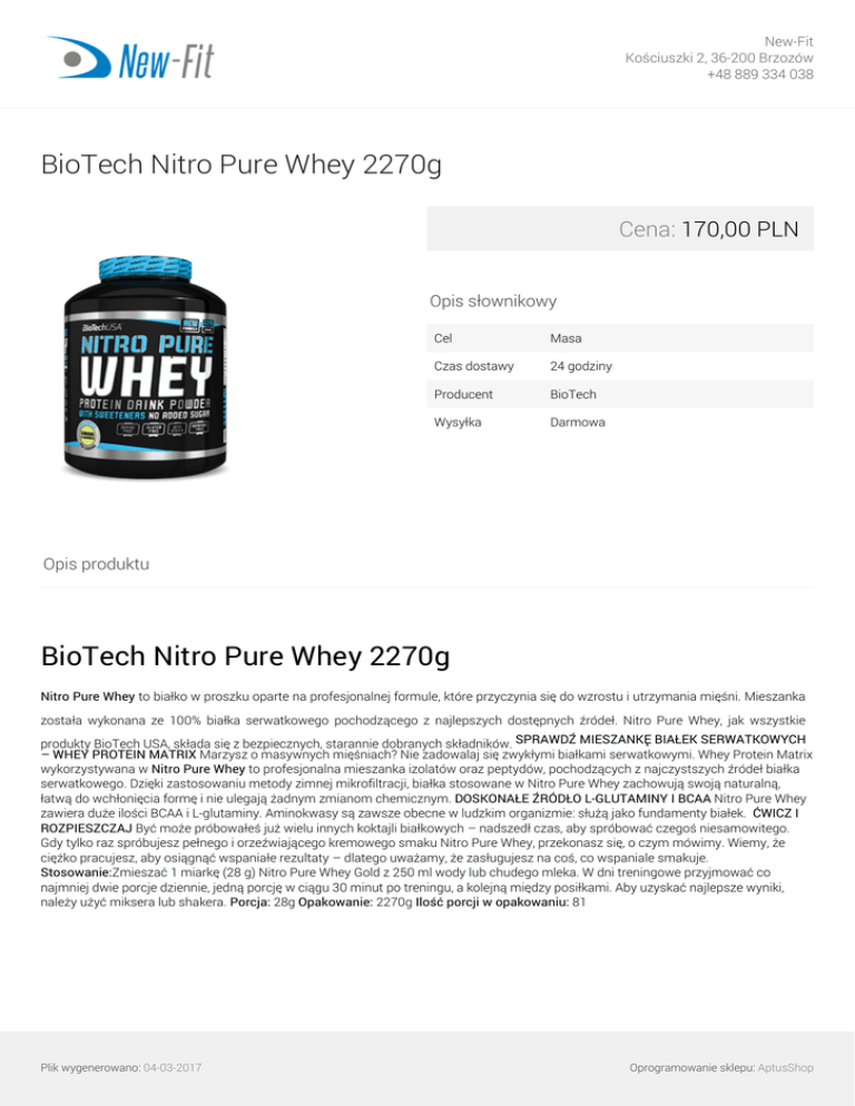 New-Fit Kościuszki 2, 36-200 Brzozów +48 889 334 038 BioTech Nitro Pure Whey 2270g Cena: 170,00 PLN Opis słownikowy Cel Masa Czas dostawy 24 godziny Producent BioTech Wysyłka Darmowa Opis produktu BioTech Nitro Pure Whey 2270g Nitro Pure Whey to białko w proszku oparte na profesjonalnej formule, które przyczynia się do wzrostu i utrzymania mięśni. Mieszanka została wykonana ze 100% białka serwatkowego pochodzącego z najlepszych dostępnych źródeł. Nitro Pure Whey, jak wszystkie produkty BioTech USA, składa się z bezpiecznych, starannie dobranych składników. SPRAWDŹ MIESZANKĘ BIAŁEK SERWATKOWYCH – WHEY PROTEIN MATRIX Marzysz o masywnych mięśniach? Nie zadowalaj się zwykłymi białkami serwatkowymi. Whey Protein Matrix wykorzystywana w Nitro Pure Whey to profesjonalna mieszanka izolatów oraz peptydów, pochodzących z najczystszych źródeł białka serwatkowego. Dzięki zastosowaniu metody zimnej mikrofiltracji, białka stosowane w Nitro Pure Whey zachowują swoją naturalną, łatwą do wchłonięcia formę i nie ulegają żadnym zmianom chemicznym. DOSKONAŁE ŹRÓDŁO L-GLUTAMINY I BCAA Nitro Pure Whey zawiera duże ilości BCAA i L-glutaminy. Aminokwasy są zawsze obecne w ludzkim organizmie: służą jako fundamenty białek. ĆWICZ I ROZPIESZCZAJ Być może próbowałeś już wielu innych koktajli białkowych – nadszedł czas, aby spróbować czegoś niesamowitego. Gdy tylko raz spróbujesz pełnego i orzeźwiającego kremowego smaku Nitro Pure Whey, przekonasz się, o czym mówimy. Wiemy, że ciężko pracujesz, aby osiągnąć wspaniałe rezultaty – dlatego uważamy, że zasługujesz na coś, co wspaniale smakuje. Stosowanie:Zmieszać 1 miarkę (28 g) Nitro Pure Whey Gold z 250 ml wody lub chudego mleka. W dni treningowe przyjmować co najmniej dwie porcje dziennie, jedną porcję w ciągu 30 minut po treningu, a kolejną między posiłkami. Aby uzyskać najlepsze wyniki, należy użyć miksera lub shakera. Porcja: 28g Opakowanie: 2270g Ilość porcji w opakowaniu: 81 Plik wygenerowano: 04-03-2017 Powered by TCPDF (www.tcpdf.org) Oprogramowanie sklepu: AptusShop