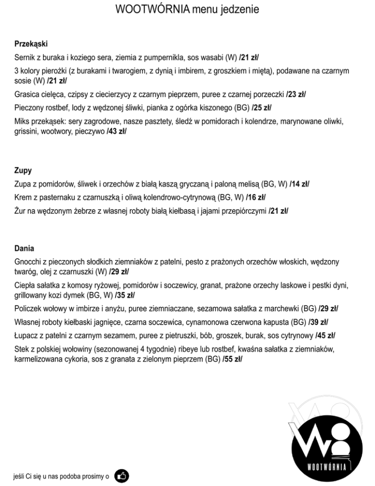 WOOTWÓRNIA menu jedzenie Przekąski Sernik z buraka i koziego sera, ziemia z pumpernikla, sos wasabi (W) /21 zł/ 3 kolory pierożki (z burakami i twarogiem, z dynią i imbirem, z groszkiem i miętą), podawane na czarnym sosie (W) /21 zł/ Grasica cielęca, czipsy z ciecierzycy z czarnym pieprzem, puree z czarnej porzeczki /23 zł/ Pieczony rostbef, lody z wędzonej śliwki, pianka z ogórka kiszonego (BG) /25 zł/ Miks przekąsek: sery zagrodowe, nasze pasztety, śledź w pomidorach i kolendrze, marynowane oliwki, grissini, wootwory, pieczywo /43 zł/ Zupy Zupa z pomidorów, śliwek i orzechów z białą kaszą gryczaną i paloną melisą (BG, W) /14 zł/ Krem z pasternaku z czarnuszką i oliwą kolendrowo-cytrynową (BG, W) /16 zł/ Żur na wędzonym żebrze z własnej roboty białą kiełbasą i jajami przepiórczymi /21 zł/ Dania Gnocchi z pieczonych słodkich ziemniaków z patelni, pesto z prażonych orzechów włoskich, wędzony twaróg, olej z czarnuszki (W) /29 zł/ Ciepła sałatka z komosy ryżowej, pomidorów i soczewicy, granat, prażone orzechy laskowe i pestki dyni, grillowany kozi dymek (BG, W) /35 zł/ Policzek wołowy w imbirze i anyżu, puree ziemniaczane, sezamowa sałatka z marchewki (BG) /29 zł/ Własnej roboty kiełbaski jagnięce, czarna soczewica, cynamonowa czerwona kapusta (BG) /39 zł/ Łupacz z patelni z czarnym sezamem, puree z pietruszki, bób, groszek, burak, sos cytrynowy /45 zł/ Stek z polskiej wołowiny (sezonowanej 4 tygodnie) ribeye lub rostbef, kwaśna sałatka z ziemniaków, karmelizowana cykoria, sos z granata z zielonym pieprzem (BG) /55 zł/ jeśli Ci się u nas podoba prosimy o WOOTWÓRNIA menu jedzenie Sałaty Cykoria, sałata, kalarepa, jabłka, karmelizowane pomarańcze, prażone orzechy włoskie, sos czosnkowocytrynowy (BG, W) /29 zł/ Sałata z kopconym łososiem, kaparami i rzodkiewką, sos musztardowo miodowy (BG) /35 zł/ Desery Trzy: mus z gorzkiej czekolady z wódką, śliwki z imbirem, lody pieprzowe (BG, W) /14 zł/ Czekoladowy fondant, gorzkie kakao, sorbet z czerwonej porzeczki (BG, W) /16 zł/ - czas oczekiwania ok. 15 min. Lody własnej roboty w słoiku (tajska bazylia z miętą) (BG, W) /12 zł/ Ciasto dnia (W) /12 zł/ Śniadania (podawane od 10 do 12) Czar Edka /12 zł/ Jajecznica/omlet/sadzone z 3 jaj od Edka (lub innych dobrych ze wsi) z dodatkami (szczypiorek, cebula, pomidor, szynka). Podawane z pieczywem i masłem. Za zdrowo /12 zł/ Owsianka z owocami sezonowymi. Mniej zdrowo /12 zł/ Dwie dobre parówki z własnej roboty adjiką ser bursztyn. Podawane z pieczywem i masłem. Śniadanie Mistrzów /19 zł/ Jajecznica/omlet/sadzone z 2 jaj, domowy pasztet, szynka, parówka, ser bursztyn, ser biały, wootwory. Podawane z pieczywem i masłem. Jaja po benedyktyńsku /21 zł/ 2 jaja w koszulkach na toście z szynką dojrzewającą i sosem holenderskim. Dodatkowe pieczywo /2 zł/ zamelduj się u nas na WOOTWÓRNIA menu napoje Zimne napoje Kawa Cisowianka Perlage/niegazowana 6 zł Espresso 6 zł San Pellegrino 9 zł Macchiato 9 zł Woda karafka mała /0,4 l/ 7 zł Americano 7zł Woda karafka duża /0,9 l/ 12 zł Cappuccino 10 zł Sok jabłko/pomidor 7zł Sok wyciskany pomarańcza/grejpfrut/mix 14 zł WOOTWORY Jeśli nie znasz, spróbuj. Zapytaj obsługę o zestaw do spróbowania. Doppio 9 zł Latte 12 zł Latte Macchiato 14 zł Flat white 14 zł Kawa mrożona (2 espresso, mleko, lód ) 14 zł Cola 5 zł Mleko sojowe +2 zł Sanbitter 10 zł Dodatkowe mleko +1zł San San Sanbitter, SanPellegrino, lód, pomarańcza 15 zł Dodatkowe espresso +3 zł ZESTAWY Od poniedziałku do piątku zestawy obiadowe za 22 zł Zawsze zupa i do wyboru danie wege lub z mięsem Lemoniada cytrynowa 10 zł Lemoniada sezonowa 12 zł Gorące napoje John Lemon 10 zł Herbaty wybór filiżanka 7 zł Yerbata 10 zł Herbaty wybór dzbanek 11 zł Smoothie Fimaro 10 zł Grzejnik (herbata, imbir, miód, cytryna, kardamon, goździki) 11 zł Chai Cola 10 zł Fentimans 12 zł Napar imbirowy z cytrusami, różowym pieprzem i miodem 12 zł Buenos Mate/Lapachos 12 zł Gorąca N czekolada (słodka lub wytrawna) 11 zł + chilli 12 zł Cola Rebell Maxx Chill / Imbir / Stewia 10 zł Puchacz (słodka N czekolada, spienione mleko, cynamon) 12 zł Organizujemy PRZYJĘCIA. Przyjmujemy zamówienia na własnej roboty PASZTETY I WYPIEKI. Wootwórnia Bistro ul. Królowej Aldony 5 Saska Kępa, Warszawa tel. 726 308 169 e-mail: [email protected] www.wootwornia.pl Hasło: WOOTWORY jeśli Ci się u nas podoba prosimy o WOOTWÓRNIA menu napoje Alkohole, Aperol Spritz prosecco, Aperol, lód, woda mineralna gazowana, pomarańcza 14 zł Aperol Tonic fentimans tonic, Aperol, lód, woda mineralna gazowana, pomarańcza 14 zł Spritzer białe/czerwone wino domowe, woda mineralna gazowana, lód 12 zł Cydr Lubelski 7 zł Grzańce Grzany cydr (imbir, cynamon, goździki, jabłka) 9 zł Grzane piwo (imbir, miód, kardamon, cynamon) 11 zł Grzane wino (pomarańcza, cynamon, anyż, goździki) 12 zł Piwa Piwa butelkowe Czechy /0,5 l/ (Skalak, Svijany, Budweiser, Breznak, Cerna Hora Pszeniczne) 10 zł Piwa craftowe Litwa /0,33 l/ (Rinkuskiai) 12 zł 0,4 0,9 Wina czerwone, wytrawne Domowe (Włochy, Cabernet) – lekkie, dla każdego………….…………………………………….……27,- 54,- 9,- - Tarima (Hiszpania, Alicante, Monastrell) – intensywne……………...………………………………….. - - 11,- 55,- Amendola (Włochy, Puglia, Primitivo) – bogate, z nutą słodyczy………………………..................... - - 12,- 60,- Las Perdices (Argentyna, Syrah/Viognier) – intensywne, głębokie………..…………………………... - - 13,- 70,- La Butiniere (Francja, Limoux, Syrah/Malbec/Cabernet/Merlot) – łagodne, aksamitne, pełne…..... - - - 90,- Domowe (Włochy, Chardonnay) – lekkie, dla każdego………………………………………………… 27,- 54,- 9,- - Prosecco Bedin Spumante (Włochy, Wenecja, Glera) – musujące, szlachetne..