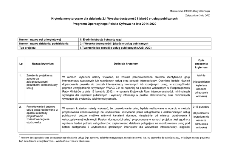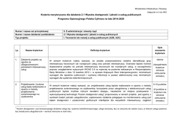 Ministerstwo Infrastruktury i Rozwoju Załącznik nr 3 do OPZ Kryteria merytoryczne dla działania 2.1 Wysoka dostępność i jakość e-usług publicznych Programu Operacyjnego Polska Cyfrowa na lata 2014-2020 Numer i nazwa osi priorytetowej II. E-administracja i otwarty rząd Numer i nazwa działania/ poddziałania 2.1 Wysoka dostępność i jakość e-usług publicznych Typ projektu I. Tworzenie lub rozwój e-usług publicznych (A2B, A2C) Lp. 1. 2. 1 Nazwa kryterium Założenia projektu są zgodne ze zdiagnozowanymi potrzebami interesariuszy usług Projektowanie i budowa usług będą realizowane w oparciu o metody projektowania zorientowanego na użytkownika Definicja kryterium W ramach kryterium należy wykazać, że została przeprowadzona rzetelna identyfikacja grup interesariuszy tworzonych lub rozwijanych usług oraz potrzeb interesariuszy. Oceniane będzie również dopasowanie projektu do potrzeb interesariuszy tworzonych lub rozwijanych usług, w szczególności poprzez uwzględnienie wytycznych WCAG 2.0 co najmniej na poziomie wskazanym w Rozporządzeniu Rady Ministrów z dnia 12 kwietnia 2012 r. w sprawie Krajowych Ram Interoperacyjności, minimalnych wymagań dla rejestrów publicznych i wymiany informacji w postaci elektronicznej oraz minimalnych wymagań dla systemów teleinformatycznych. W ramach kryterium należy wykazać, że: projektowanie usług będzie realizowane w oparciu o metody projektowania zorientowanego na użytkownika; korzystanie przez usługobiorcę z elektronicznych usług publicznych będzie możliwe różnymi kanałami dostępu, niezależnie od miejsca przebywania i 1 wykorzystywanej technologii; Poziom dostępności usług proponowany w ramach projektu jest zgodny z wynikami badań potrzeb usługobiorców; zaplanowano działania polegające na monitorowaniu usług pod kątem dostępności i użyteczności graficznych interfejsów dla wszystkich interesariuszy, ciągłości Opis znaczenia kryterium tak/nie (niespełnienie kryterium oznacza odrzucenie wniosku) 0-15 punktów (0 punktów w kryterium nie oznacza odrzucenia wniosku) Poziom dostępności: czas bezawaryjnego działania usługi (np. systemu teleinformatycznego, usługi sieciowej, itp.) w stosunku do całości czasu, w którym usługa powinna być świadczona usługobiorcom – wartość mierzona w skali roku. działania i powszechności wykorzystania. 3. 4. 5. 6. W projekcie będą realizowane potrzeby wskazane w dokumencie strategicznym dla danego obszaru tematycznego W ramach kryterium wnioskodawca jest zobowiązany wskazać nazwę aktualnie obowiązującego dokumentu strategicznego dla właściwej polityki publicznej lub dla właściwego resortu, w którym to dokumencie wskazano potrzebę realizacji projektu, oraz wskazać konkretne zapisy ww. strategii stanowiące podstawę do realizacji projektu. Konieczność realizacji projektu wynika ze zobowiązań nałożonych prawem Unii Europejskiej W ramach kryterium wnioskodawca powinien wykazać, że konieczność realizacji projektu wynika z prawnych zobowiązań wobec UE. Projekt wpisuje się w jeden z priorytetowych obszarów tematycznych wskazanych w POPC Projekt został zapisany w Kontrakcie Terytorialnym W ramach kryterium należy wykazać, że działania objęte projektem wpisują się w jeden z priorytetowych obszarów tematycznych wskazanych w dokumencie programowym POPC. W przypadku, gdy wnioskodawca wykaże, że projekt dodatkowo realizuje wskazane w POPC zalecenia Rady Unii Europejskiej w sprawie krajowego programu reform Polski na rok 2014 (Country Specific Recommendations), projekt otrzyma dodatkowe punkty. W ramach kryterium wnioskodawca powinien wykazać, że projekt został wpisany do Kontraktu Terytorialnego zawartego pomiędzy Ministrem Infrastruktury i Rozwoju a Samorządem Województwa. 2 tak/nie (niespełnienie kryterium oznacza odrzucenie wniosku) 0-3 punkty (0 punktów w kryterium nie oznacza odrzucenia wniosku) 0-10 punktów (0 punktów w kryterium nie oznacza odrzucenia wniosku) 0-3 punkty (0 punktów w kryterium nie oznacza odrzucenia wniosku) 7. 8. 9. 10. 11. Projekt realizuje jasno określone, społecznie istotne cele, wyrażone mierzalnymi wskaźnikami W ramach kryterium należy wykazać, że: projekt realizuje społecznie istotne cele odnoszące się do poprawy warunków funkcjonowania przedsiębiorców lub poprawy jakości życia obywateli lub usprawnienia funkcjonowania państwa; projekt realizuje obligatoryjne wskaźniki produktu; projekt ma wpływ na realizację wskaźników rezultatu strategicznego wskazanych na poziomie POPC. Ponadto wnioskodawca powinien wykazać, że wybrał wskaźniki produktu odpowiednie do celu i zakresu projektu, uzasadnić ich dobór oraz określić i uzasadnić ich wartości bazowe i docelowe. W ramach kryterium należy również wskazać sposób pomiaru wskaźników. Projekt jest zorientowany usługowo W ramach kryterium wnioskodawca powinien jasno zdefiniować usługi objęte projektem oraz wskazać ich obecny i docelowy poziom e-dojrzałości (dotyczy usług A2C/A2B). Dla e-usług rozwijanych, które już istnieją w formie elektronicznej, należy również wskazać planowane nowe funkcjonalności, tj. szczególne cechy lub elementy danej usługi. Usługi realizowane w ramach projektu będą powszechnie wykorzystywane W ramach kryterium wnioskodawca powinien wiarygodnie wykazać, że co najmniej jedna z usług objętych projektem będzie powszechnie wykorzystywana, tzn. że jest skierowana do licznej lub często korzystającej grupy odbiorców oraz że istnieje znaczne prawdopodobieństwo, że będzie wykorzystywana przez znaczny odsetek danej grupy odbiorców. W ramach projektu zostaną udostępnione usługi o wysokim poziomie e-dojrzałości W ramach kryterium wnioskodawca powinien wykazać, że co najmniej jedna z usług objętych projektem będzie udostępniona na czwartym (pełna transakcyjność) lub piątym (personalizacja) poziomie edojrzałości. Zakres rzeczowy i struktu