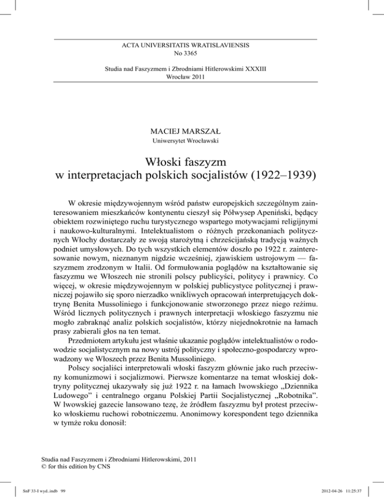 ACTA UNIVERSITATIS WRATISLAVIENSIS No 3365 Studia nad Faszyzmem i Zbrodniami Hitlerowskimi XXXIII Wrocław 2011 MACIEJ MARSZAŁ Uniwersytet Wrocławski Włoski faszyzm w interpretacjach polskich socjalistów (1922–1939) W okresie międzywojennym wśród państw europejskich szczególnym zainteresowaniem mieszkańców kontynentu cieszył się Półwysep Apeniński, będący obiektem rozwiniętego ruchu turystycznego wspartego motywacjami religijnymi i naukowo-kulturalnymi. Intelektualistom o różnych przekonaniach politycznych Włochy dostarczały ze swoją starożytną i chrześcijańską tradycją ważnych podniet umysłowych. Do tych wszystkich elementów doszło po 1922 r. zainteresowanie nowym, nieznanym nigdzie wcześniej, zjawiskiem ustrojowym — faszyzmem zrodzonym w Italii. Od formułowania poglądów na kształtowanie się faszyzmu we Włoszech nie stronili polscy publicyści, politycy i prawnicy. Co więcej, w okresie międzywojennym w polskiej publicystyce politycznej i prawniczej pojawiło się sporo nierzadko wnikliwych opracowań interpretujących doktrynę Benita Mussoliniego i funkcjonowanie stworzonego przez niego reżimu. Wśród licznych politycznych i prawnych interpretacji włoskiego faszyzmu nie mogło zabraknąć analiz polskich socjalistów, którzy niejednokrotnie na łamach prasy zabierali głos na ten temat. Przedmiotem artykułu jest właśnie ukazanie poglądów intelektualistów o rodowodzie socjalistycznym na nowy ustrój polityczny i społeczno-gospodarczy wprowadzony we Włoszech przez Benita Mussoliniego. Polscy socjaliści interpretowali włoski faszyzm głównie jako ruch przeciwny komunizmowi i socjalizmowi. Pierwsze komentarze na temat włoskiej doktryny politycznej ukazywały się już 1922 r. na łamach lwowskiego „Dziennika Ludowego” i centralnego organu Polskiej Partii Socjalistycznej „Robotnika”. W lwowskiej gazecie lansowano tezę, że źródłem faszyzmu był protest przeciwko włoskiemu ruchowi robotniczemu. Anonimowy korespondent tego dziennika w tymże roku donosił: Studia nad Faszyzmem i Zbrodniami Hitlerowskimi, 2011 © for this edition by CNS SnF 33-I wyd..indb 99 2012-04-26 11:25:37 100 Maciej Marszał wstrząśnięta swym panowaniem burżuazja nie mogąc legalnymi metodami dojść do wyłącznej władzy, stworzyć chce zbrojne kadry, aby na nich oprzeć swą dyktatorską władzę i zdusić wszystko, co żyć i działać pragnie1. Natomiast pierwsze relacje i próby oceny genezy faszyzmu zamieszczone zostały także w „Robotniku”. Już w październiku 1922 r. na łamach tego dziennika rozpoczęła się agresywna agitacja przeciw Mussoliniemu i jego „marszowi na Rzym” określanemu jako „rokosz”2. Korespondent dziennika nazwał faszystów „bojówką kapitalistyczno-obszarniczą”, ponieważ posługiwali się oni podobnymi metodami rewolucyjnymi jak komuniści i w rezultacie stali się „prawicowymi bolszewikami”3. Zdaniem nieznanego publicysty gazety faszyzm we Włoszech odniósł zwycięstwo z powodu „dezorganizacji sił ludowych”, które w nieudany sposób dążyły do gwałtownych zmian społeczno-politycznych4. Faszyzm był politycznym „wykładnikiem kapitalizmu”, który korumpował życie gospodarcze Italii5 i stał się „ucieczką jego przed bankructwem”6. W nurcie socjalistycznym do interpretatorów włoskiego faszyzmu zaliczyć można czołowych polityków polskiej lewicy niepodległościowej, posłów Polskiej Partii Socjalistycznej i publicystów „Robotnika”, a mianowicie Kazimierza Czapińskiego i Mieczysława Niedziałkowskiego. Czapiński w swoich licznych artykułach na łamach „Robotnika” przekonywał, że komunizm i faszyzm to zjawiska polityczne bardzo do siebie zbliżone, ponieważ oba ruchy cechuje duże pokrewieństwo metod terrorystycznych, rządów oligarchicznych, niechęci do demokracji i wolności obywatelskich7. Pisał, że istotą faszyzmu jest „dyktatura uzbrojonej burżuazji skierowanej przeciwko klasie robotniczej”8. Co znamienne, Czapiński, podobnie jak niektórzy publicyści prawicowi, intelektualnych źródeł włoskiego faszyzmu szukał w teorii krążenia elit Vilfreda Pareto, rewolucyjnym syndykalizmie Georga Sorela i „ideologii Romy” Enrica Corradiniego9. Według niego faszyzm przechodził dwie fazy rozwoju. Pierwsza nacechowana była nieustannymi walkami z działaczami robotniczymi w imię obrony interesów tzw. 1 „Ideały” faszystów, „Dziennik Ludowy” 1922, nr 280, s. 1. Rokosz faszystów, „Robotnik” 1922, nr 297, s. 1. 3 Rząd faszystów, „Robotnik” 1922, nr 298, s. 4. 4 Zwycięstwo faszystów, „Robotnik” 1922, nr 299, s. 1; zob. także: Mussoliniada, „Robotnik” 1922, nr 330, s. 3; Nieco o faszyzmie, „Robotnik” 1923, nr 3, s.1; W faszystowskim raju, „Robotnik” 1923, nr 108, s. 1; Pod jarzmem faszyzmu, „Robotnik” 1923, nr 124, s. 1; Rok faszyzmu we Włoszech, „Robotnik” 1923, nr 352, s. 1. 5 Prawdziwe oblicze faszyzmu, „Robotnik” 1924, nr 168, s. 1. 6 Dziesięciolecie faszyzmu, „Robotnik” 1932, nr 358, s. 2; por. The road to fascism, „Contemporary European History” 2002, nr 11, s. 273–303. 7 K. Czapiński, Komunizm a faszyzm. Ciekawe pokrewieństwa, „Robotnik” 1927, nr 28, s. 1; zob. także: idem, Studiujemy faszyzm. Dyspozycje odczytowe, „Oświata i Kultura” 1931, nr 4 i 5; idem, Walka robotników o zwycięstwo. Zarys dziejów myśli socjalistycznej, Warszawa 1935, s. 3–32. 8 K. Czapiński, Pięciolecie faszyzmu. Faszyzm a klasa robotnicza, „Robotnik” 1927, nr 324, s. 1. 9 K. Czapiński, Faszyzm współczesny, Warszawa 1932, s. 17–21. 2 Studia nad Faszyzmem i Zbrodniami Hitlerowskimi, 2011 © for this edition by CNS SnF 33-I wyd..indb 100 2012-04-26 11:25:37 Włoski faszyzm w interpretacjach polskich socjalistów (1922–1939) 101 średniej burżuazji. Drugi okres charakteryzował się reprezentowaniem wielkiej burżuazji i oznaczał całkowite zniesienie demokracji prze