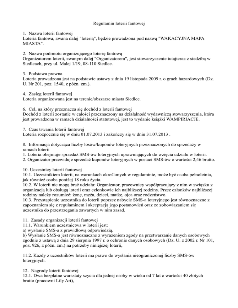 Regulamin loterii fantowej 1. Nazwa loterii fantowej Loteria fantowa, zwana dalej "loterią", będzie prowadzona pod nazwą "WAKACYJNA MAPA MIASTA". 2. Nazwa podmiotu organizującego loterię fantową Organizatorem loterii, zwanym dalej "Organizatorem", jest stowarzyszenie tutajteraz z siedzibą w Siedlcach, przy ul. Małej 1/19, 08-110 Siedlce. 3. Podstawa prawna Loteria prowadzona jest na podstawie ustawy z dnia 19 listopada 2009 r. o grach hazardowych (Dz. U. Nr 201, poz. 1540, z późn. zm.). 4. Zasięg loterii fantowej Loteria organizowana jest na terenie/obszarze miasta Siedlce. 6. Cel, na który przeznacza się dochód z loterii fantowej Dochód z loterii zostanie w całości przeznaczony na działalność wydawniczą stowarzyszenia, która jest prowadzona w ramach działalności statutowej, jest to wydanie książki WAMPIRIACJE. 7. Czas trwania loterii fantowej Loteria rozpocznie się w dniu 01.07.2013 i zakończy się w dniu 31.07.2013 . 8. Informacja dotycząca liczby losów/kuponów loteryjnych przeznaczonych do sprzedaży w ramach loterii 1. Loteria obejmuje sprzedaż SMS-ów loteryjnych uprawniających do wzięcia udziału w loterii. 2. Organizator przewiduje sprzedaż kuponów loteryjnych w postaci SMS-ów o wartości 2,46 brutto. 10. Uczestnicy loterii fantowej 10.1. Uczestnikiem loterii, na warunkach określonych w regulaminie, może być osoba pełnoletnia, jak również osoba poniżej 18 roku życia. 10.2. W loterii nie mogą brać udziału: Organizator, pracownicy współpracujący z nim w związku z organizacją lub obsługą loterii oraz członkowie ich najbliższej rodziny. Przez członków najbliższej rodziny należy rozumieć: żonę, męża, dzieci, matkę, ojca oraz rodzeństwo. 10.3. Przystąpienie uczestnika do loterii poprzez nabycie SMS-a loteryjnego jest równoznaczne z zapoznaniem się z regulaminem i akceptacją jego postanowień oraz ze zobowiązaniem się uczestnika do przestrzegania zawartych w nim zasad. 11. Zasady organizacji loterii fantowej 11.1. Warunkiem uczestnictwa w loterii jest: a) wysłanie SMS-a z prawidłową odpowiedzią. b) Wysłanie SMS-a jest równoznaczne z wyrażeniem zgody na przetwarzanie danych osobowych zgodnie z ustawą z dnia 29 sierpnia 1997 r. o ochronie danych osobowych (Dz. U. z 2002 r. Nr 101, poz. 926, z późn. zm.) na potrzeby niniejszej loterii, 11.2. Każdy z uczestników loterii ma prawo do wysłania nieograniczonej liczby SMS-ów loteryjnych. 12. Nagrody loterii fantowej 12.1. Dwa bezpłatne warsztaty szycia dla jednej osoby w wieku od 7 lat o wartości 40 złotych brutto (pracowni Lily Art), 12.2. Bon dla dwóch osób o wartości 40 zł do kawiarni Fado, 12.3. kupon na pizzę familijną dla 4 osób i 4 dowolne napoje bezalkoholowew Pizzerii Verona, 12.4. kolacja dla dwóch osób w Panderosie 12.5. 3-daniowa kolacja dla 2 osób w restauracji Zaścianek Polski 12.6. 1 godz. zajęć indywidualnych wybranego tańca dla jednej osoby lub pary w Studiu Tańca Towarzyskiego Anny & Jana Jaroszyńskich 12.7. zestaw gadżetów z Sali Zabaw Młynek, czyli koszulka, czapka i worek 12.8. zaproszenie dla dwóch osób o wartości 100 zł do Restauracji Barbarossa 12.9. bon podarunkowy na 1 godzinę gry w kręgle w Kręgielni Lemon 12.10. 5 wejściówek na płatne imprezy w Bollywood Hollywood 12.11. sauna na włosy w Pasja i Styl 12.12. karta podarunkowa o wartości 100 zł w Silk Touch 12.13.zabieg pielęgnacyjny na twarz o wartości 150 zł w Oazie Urody 12.14. karnet na minigolfa dla 2 osób na 2 godziny (wartość nagrody 40 zł) w Ośrodku Wczasowym Stanica 12.15. 10 podwójnych zaproszeń na sobotnią imprezę w Milenium Club 12.16. stylizacja w Pracownii Mody Agutti 12.17. bon podarunkowy o wartości 50 zł na dowolne pozycje w menu 22? Wschód Cafe 13. Miejsce i termin losowania nagród 13.1. Losowanie nagród odbędzie się w dniu 1 sierpnia 2013 w siedzibie Organizatora o godz. 10.00. Losowanie odbędzie się spośród wszystkich SMS-ów. 13.2. Losowanie poszczególnych nagród zostanie przeprowadzone przez osoby wchodzące w skład Komisji Loterii "WAKACYJNA MAPA MIASTA" powołanej przez Organizatora, której przewodniczyć będzie osoba posiadająca znajomość przepisów ustawy z dnia 19 listopada 2009 r. o grach hazardowych w zakresie loterii fantowych. 13.3. Zwycięzców powiadomimy telefonicznie. 13.4. W przypadku, gdy zwycięzca nie zgłosi się, w ciągu 14 dni po odbiór nagrody nagroda pozostanie własnością Organizatora. 14. Miejsce, sposób i termin wydawania nagród 14.1. Wydanie nagród będzie w siedzibie Organizatora. 14.2. W przypadku nieodebrania nagrody w terminie 14 dni od rozstrzygnięcia zwycięzca loterii traci prawo do nagrody i nagroda pozostaje własnością Organizatora. 15. Sposób zapewnienia prawidłowości organizowanej loterii fantowej 15.1. W celu zapewnienia prawidłowości urządzania loterii Organizator powoła Komisję Loterii "WAKACYJNA MAPA MIASTA", której zasady funkcjonowania określać będzie regulamin działania tej Komisji. W skład Komisji wchodzić będzie m.in. osoba posiadająca znajomość przepisów ustawy z dnia 19 listopada 2009 r. o grach hazardowych w zakresie loterii fantowych. 15.2. Komisja Loterii "WAKACYJNA MAPA MIASTA" sporządzi z przebiegu losowania protokół/sprawozdanie z podaniem wyników losowania loterii. 16. Zasady postępowania reklamacyjnego 16.1. Reklamacje mogą być zgłaszane przez cały czas trwania loterii oraz po jej zakończeniu, nie później niż do 7 dni od daty upływu terminu wydania nagród. 16.2. Rozpatrzeniu podlegają wyłącznie reklamacje zgłoszone w formie pisemnej. 16.3. Za datę wniesienia reklamacji uznaje się datę złożenia jej osobiście w siedzibie Organizatora lub datę stempla pocztowego w przypadku złożenia reklamacji listownie. 16.4. Reklamacje rozpatrzy Komisja Loterii "WAKACYJNA MAPA MIASTA". Termin rozpatrzenia reklamacji wynosi 14 dni od dnia jej wpływu na adres Organizatora. Zawiadomienie o wyniku reklamac