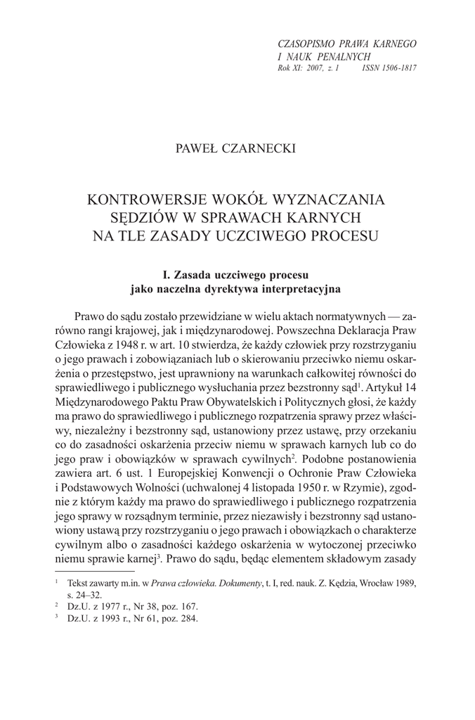 CZASOPISMO PRAWA KARNEGO I NAUK PENALNYCH Rok XI: 2007, z. 1 ISSN 1506-1817 PAWEŁ CZARNECKI KONTROWERSJE WOKÓŁ WYZNACZANIA SĘDZIÓW W SPRAWACH KARNYCH NA TLE ZASADY UCZCIWEGO PROCESU I. Zasada uczciwego procesu jako naczelna dyrektywa interpretacyjna Prawo do sądu zostało przewidziane w wielu aktach normatywnych — zarówno rangi krajowej, jak i międzynarodowej. Powszechna Deklaracja Praw Człowieka z 1948 r. w art. 10 stwierdza, że każdy człowiek przy rozstrzyganiu o jego prawach i zobowiązaniach lub o skierowaniu przeciwko niemu oskarżenia o przestępstwo, jest uprawniony na warunkach całkowitej równości do sprawiedliwego i publicznego wysłuchania przez bezstronny sąd1. Artykuł 14 Międzynarodowego Paktu Praw Obywatelskich i Politycznych głosi, że każdy ma prawo do sprawiedliwego i publicznego rozpatrzenia sprawy przez właściwy, niezależny i bezstronny sąd, ustanowiony przez ustawę, przy orzekaniu co do zasadności oskarżenia przeciw niemu w sprawach karnych lub co do jego praw i obowiązków w sprawach cywilnych2. Podobne postanowienia zawiera art. 6 ust. 1 Europejskiej Konwencji o Ochronie Praw Człowieka i Podstawowych Wolności (uchwalonej 4 listopada 1950 r. w Rzymie), zgodnie z którym każdy ma prawo do sprawiedliwego i publicznego rozpatrzenia jego sprawy w rozsądnym terminie, przez niezawisły i bezstronny sąd ustanowiony ustawą przy rozstrzyganiu o jego prawach i obowiązkach o charakterze cywilnym albo o zasadności każdego oskarżenia w wytoczonej przeciwko niemu sprawie karnej3. Prawo do sądu, będąc elementem składowym zasady 1 2 3 Tekst zawarty m.in. w Prawa człowieka. Dokumenty, t. I, red. nauk. Z. Kędzia, Wrocław 1989, s. 24–32. Dz.U. z 1977 r., Nr 38, poz. 167. Dz.U. z 1993 r., Nr 61, poz. 284. 28 Paweł Czarnecki uczciwego procesu, jest podmiotowym uprawnieniem jednostki, wobec czego może się ona zgodnie z art. 45 Konstytucji RP domagać sprawiedliwego i jawnego rozpatrzenia sprawy, bez nieuzasadnionej zwłoki, przez właściwy, niezależny, bezstronny i niezawisły sąd. Uregulowania te nie są właściwe i charakterystyczne wyłącznie dla systemów prawnych Starego Kontynentu, ponieważ podobne postanowienia znajdują się w Amerykańskiej Konwencji Praw Człowieka uchwalonej 22 listopada 1969 r. w San Jose (art. 8 ust. 1) oraz w Afrykańskiej Karcie Praw Człowieka uchwalonej 27 czerwca 1981 r. w Nairobii (art. 7 ust. 1)4. Pamiętajmy jednak, że ponieważ Rzeczypospolita Polska w 1993 r. ratyfikowała wspomnianą Europejską Konwencję o Ochronie Praw Człowieka i Podstawowych Wolności, a Europejski Trybunał Praw Człowieka wielokrotnie wypowiadał się na temat interpretacji i wymagań dotyczących pojęcia uczciwego procesu, może nam to pomóc przy dokonywaniu wykładni norm kodeksowych regulujących powoływanie składów sędziowskich. Zasada sądowego wymiaru sprawiedliwości sprzyja umocnieniu praworządności oraz należytemu zabezpieczeniu praw człowieka. Ustalenie odpowiedzialności sprawcy danego czynu i wymierzenie mu kary wymaga szczególnie wysokich kwalifikacji oraz nieskalanego poziomu etycznego podmiotów tworzących wymiar sprawiedliwości. Oczywiście konieczne jest przy tym przestrzeganie właściwej procedury sądowej, nie tylko po to, aby organ orzekający nie popełniał więcej pomyłek, ale również miał pewną swobodę w orzekaniu. W gruncie rzeczy chodzi o zapewnienie zasady uczciwego procesu (fr. le procés equitable, ang. fair trial, fair hearing). W polskiej nauce przedmiotu bywa to tłumaczone jako proces rzetelny, praworządny, sprawiedliwy i uczciwy; czyli chodzi o przestrzeganie zespołu wymogów składających się na „model dobrego sędziego”; nieuczciwość zaś to przeciwstawienie temu typowi. Uczciwy wobec społeczeństwa proces musi być zgodny ze społecznymi oczekiwaniami i zakończony zaakceptowanym przez społeczeństwo orzeczeniem5. Z uwagi na niebagatelne 4 5 Świetne zestawienie praw w wyżej wymienionych czterech źródłach prawa międzynarodowego zostało zawarte w pracy P. H o f m a ń s k i e g o, Konwencja europejska a prawo karne, Toruń 1995, s. 39 i n. A. M u r z y n o w s k i, Istota i zasady procesu karnego, Warszawa 1994, s. 220. Pojęcie wyznaczników zasady uczciwego procesu zostało szeroko omówione w piśmiennictwie. Na szczególne uwzględnienie zasługują prace: M. B a r ą c z, Pojęcie i cechy uczciwego procesu karnego, PiP 1991, nr 12; M.P. W ę d r y c h o w s k i, Prawo do uczciwej rozprawy w Europejskiej Konwencji Praw Człowieka, „Przegląd Sądowy” 1991, nr 5/6; P. H o f m a ńs k i, Ochrona praw człowieka w prawie karnym procesowym. Zasada fair trial, w: Standardy praw człowieka a polskie prawo karne, red. J. Skupiński, J. Jakubowska, Warszawa 1995. Kontrowersje wokół wyznaczania sędziów w sprawach karnych na tle zasady uczciwego procesu 29 znaczenie dla prawidłowego działania mechanizmów demokracji, pojęcie „uczciwego procesu” absolutnie w żadnym wypadku nie może być wąsko interpretowane6. Kluczowe znaczenie ma przy tym wynikająca z art. 6 ust. 1 Konwencji Europejskiej cecha bezstronności, która ma w zasadzie dwa aspekty: sąd musi być bezstronny subiektywnie, a więc żaden sędzia nie może być osobiście stronniczy lub uprzedzony, a ponadto sąd musi być bezstronny obiektywnie, czyli dawać gwarancje wystarczające do wykluczenia wszelkich uprawnionych wątpliwości7. Gdy prawnie reprezentowany skarżący nie zgłosi zastrzeżeń co do składu sądu, należy uznać, że zrezygnował on z prawa do kwestionowania jego niezależności i bezstronności. Tym samym domniemywa się osobistą bezstronność, chyba że pojawią się dowody przeciwne8. Prawidłowa obsada sądu powinna odpowiadać wymaganiom stawianym przez ustawodawcę, który przyporządkował określone rodzaje spraw sądom danego szczebla, określając jednocześnie właściwe składy orzekające. Nie stworzył takich wymagań w oderwaniu od rze