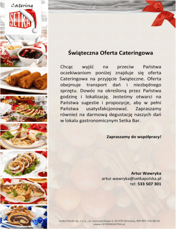 Świąteczna Oferta Cateringowa Chcąc wyjść na przeciw Państwa oczekiwaniom poniżej znajduje się oferta Cateringowa na przyjęcie Świąteczne. Oferta obejmuje transport dań i niezbędnego sprzętu. Dowóz na określoną przez Państwa godzinę i lokalizację. Jesteśmy otwarci na Państwa sugestie i propozycje, aby w pełni Państwa usatysfakcjonować. Zapraszamy również na darmową degustację naszych dań w lokalu gastronomicznym Setka Bar. Zapraszamy do współpracy! Artur Wawryka [email protected] tel: 533 507 301 ZESTAW 1 Cena 60 zł / za osobę Przekąski 1. Śledź w oleju 2. Ryba po grecku 3. Sałatka jarzynowa Zupa ( do wyboru zupa lub krem ) 1. Barszczyk czerwony z uszkami 2. Krem z borowikami podany z groszkiem ptysiowym Dania główne 1. Pierogi z kapustą i grzybami 2. Karp Wigilijny 3. Kapusta zasmażana z grochem Deser 1. Sernik z bakaliami w towarzystwie sosu malinowego Napoje 1. Kompot z suszu ZESTAW 2 Cena 70 zł / za osobę Przekąski 1. Śledź w oleju 2. Śledź po japońsku 3. Ryba po grecku 4. Sałatka jarzynowa Zupa ( do wyboru zupa lub krem ) 1. Barszczyk czerwony z uszkami 2. Krem z borowikami podany z groszkiem ptysiowym Dania główne 1. Pierogi z kapustą i grzybami 2. Karp Wigilijny 3. Kapusta zasmażana z grochem Deser 1. Sernik z bakaliami w towarzystwie sosu malinowego 2. Tradycja wigilijna - kutia Napoje 1. Kompot z suszu ZESTAW 3 Cena 80 zł / za osobę Przekąski 1. Śledź w oleju 2. Śledź po japońsku 3. Ryba po grecku 4. Sałatka jarzynowa 5.Karp w galarecie Zupa ( do wyboru zupa lub krem ) 1. Barszczyk czerwony z uszkami 2. Krem z borowikami podany z groszkiem ptysiowym Dania główne 1. Pierogi z kapustą i grzybami 2. Karp Wigilijny 3. Kapusta zasmażana z grochem 4. Kulebiak z łososia Deser 1. Sernik z bakaliami w towarzystwie sosu malinowego 2. Tradycja wigilijna - kutia 3. Makowiec Napoje 1. Kompot z suszu ZESTAW 4 Cena 100 zł / za osobę Przekąski 1. Śledź w oleju 2. Śledź po japońsku 3. Ryba po grecku 4. Sałatka jarzynowa 5. Karp w galarecie po Żydowsku 6. Terina z łososia Zupa ( do wyboru zupa lub krem ) 1. Barszczyk czerwony z uszkami 2. Krem z borowikami podany z groszkiem ptysiowym 3. Grzybowa z łazankami Dania główne 1. Pierogi z kapustą i grzybami 2. Karp Wigilijny 3. Kapusta zasmażana z grochem 4. Kulebiak z łososia 5. Sandacz z torcikiem warzywnym Deser 1. Sernik z bakaliami w towarzystwie sosu malinowego 2. Tradycja wigilijna - kutia 3. Makowiec Napoje ( po dwie pozycje ) 1. Kompot z suszu Zapraszamy do współpracy! Artur Wawryka [email protected] tel: 533 507 301