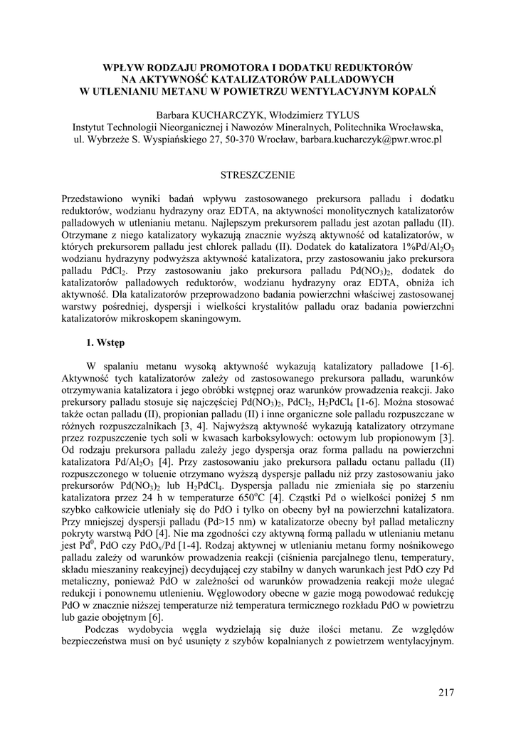 WPŁYW RODZAJU PROMOTORA I DODATKU REDUKTORÓW NA AKTYWNOŚĆ KATALIZATORÓW PALLADOWYCH W UTLENIANIU METANU W POWIETRZU WENTYLACYJNYM KOPALŃ Barbara KUCHARCZYK, Włodzimierz TYLUS Instytut Technologii Nieorganicznej i Nawozów Mineralnych, Politechnika Wrocławska, ul. Wybrzeże S. Wyspiańskiego 27, 50-370 Wrocław, [email protected] STRESZCZENIE Przedstawiono wyniki badań wpływu zastosowanego prekursora palladu i dodatku reduktorów, wodzianu hydrazyny oraz EDTA, na aktywności monolitycznych katalizatorów palladowych w utlenianiu metanu. Najlepszym prekursorem palladu jest azotan palladu (II). Otrzymane z niego katalizatory wykazują znacznie wyższą aktywność od katalizatorów, w których prekursorem palladu jest chlorek palladu (II). Dodatek do katalizatora 1%Pd/Al2O3 wodzianu hydrazyny podwyższa aktywność katalizatora, przy zastosowaniu jako prekursora palladu PdCl2. Przy zastosowaniu jako prekursora palladu Pd(NO3)2, dodatek do katalizatorów palladowych reduktorów, wodzianu hydrazyny oraz EDTA, obniża ich aktywność. Dla katalizatorów przeprowadzono badania powierzchni właściwej zastosowanej warstwy pośredniej, dyspersji i wielkości krystalitów palladu oraz badania powierzchni katalizatorów mikroskopem skaningowym. 1. Wstęp W spalaniu metanu wysoką aktywność wykazują katalizatory palladowe [1-6]. Aktywność tych katalizatorów zależy od zastosowanego prekursora palladu, warunków otrzymywania katalizatora i jego obróbki wstępnej oraz warunków prowadzenia reakcji. Jako prekursory palladu stosuje się najczęściej Pd(NO3)2, PdCl2, H2PdCl4 [1-6]. Można stosować także octan palladu (II), propionian palladu (II) i inne organiczne sole palladu rozpuszczane w różnych rozpuszczalnikach [3, 4]. Najwyższą aktywność wykazują katalizatory otrzymane przez rozpuszczenie tych soli w kwasach karboksylowych: octowym lub propionowym [3]. Od rodzaju prekursora palladu zależy jego dyspersja oraz forma palladu na powierzchni katalizatora Pd/Al2O3 [4]. Przy zastosowaniu jako prekursora palladu octanu palladu (II) rozpuszczonego w toluenie otrzymano wyższą dyspersje palladu niż przy zastosowaniu jako prekursorów Pd(NO3)2 lub H2PdCl4. Dyspersja palladu nie zmieniała się po starzeniu katalizatora przez 24 h w temperaturze 650oC [4]. Cząstki Pd o wielkości poniżej 5 nm szybko całkowicie utleniały się do PdO i tylko on obecny był na powierzchni katalizatora. Przy mniejszej dyspersji palladu (Pd>15 nm) w katalizatorze obecny był pallad metaliczny pokryty warstwą PdO [4]. Nie ma zgodności czy aktywną formą palladu w utlenianiu metanu jest Pd0, PdO czy PdOx/Pd [1-4]. Rodzaj aktywnej w utlenianiu metanu formy nośnikowego palladu zależy od warunków prowadzenia reakcji (ciśnienia parcjalnego tlenu, temperatury, składu mieszaniny reakcyjnej) decydującej czy stabilny w danych warunkach jest PdO czy Pd metaliczny, ponieważ PdO w zależności od warunków prowadzenia reakcji może ulegać redukcji i ponownemu utlenieniu. Węglowodory obecne w gazie mogą powodować redukcję PdO w znacznie niższej temperaturze niż temperatura termicznego rozkładu PdO w powietrzu lub gazie obojętnym [6]. Podczas wydobycia węgla wydzielają się duże ilości metanu. Ze względów bezpieczeństwa musi on być usunięty z szybów kopalnianych z powietrzem wentylacyjnym. 217 Metan ten jest wykorzystany w niewielkim stopniu, ponieważ jego stężenie nie przekracza 0,75% i z tego powodu jest on w większości odprowadzany do atmosfery. Z powietrzem wentylacyjnym wprowadza się do atmosfery około 581 mln m3 metanu rocznie [7]. Metan jest gazem cieplarnianym o działaniu 23 razy silniejszym od ditlenku węgla i jego obecność w atmosferze przyczynia się do zmiany klimatu powodując globalne ocieplenie. Ponieważ jego stężenie w atmosferze stale wzrasta, powinien być usuwany z powietrza wentylacyjnego kopalń. Najlepszą metodą usuwania metanu jest jego katalityczne spalanie. W procesie tym bardzo wysoką aktywność wykazują katalizatory palladowe na nośniku monolitycznym. Jako nośniki można stosować monolity ceramiczne wykonane z tlenku glinu, ditlenku krzemu, kordierytu, mulitu lub nośniki metaliczne z folii żaroodpornej o grubości 0,04-0,05 mm. Nośniki te muszą być pokryte warstwą pośrednią o wysokiej powierzchni właściwej np. z Al2O3. Głównym zadaniem warstwy pośredniej jest zwiększenie powierzchni właściwej nośnika metalicznego i stabilizacja powierzchni w taki sposób, aby w wysokich temperaturach nie następowało łączenie się krystalitów składników aktywnych powodujące wzrost ich wielkości [8]. Zastosowanie nośników monolitycznych jest korzystne ze względu na niski koszt nośnika i wysoką aktywność przy stosunkowo małej ilości fazy aktywnej. Nośniki monolityczne dają małe opory przepływu przy wysokich prędkościach przepływu gazów (>105 h-1), co umożliwia stosowanie wysokich obciążeń katalizatorów monolitycznych bez dużych spadków ciśnienia na warstwie katalitycznej [8, 9]. Cieńsze ścianki nośnika w monolitach metalicznych w stosunku do monolitów ceramicznych powodują, że katalizator o podłożu metalicznym ma większy przekrój swobodny niż monolity ceramiczne. Dzięki temu takie samo przereagowanie uzyskuje się przy objętości monolitów metalicznych o 20-30% mniejszej od objętości monolitów ceramicznych [9]. Zalety te są ważne przy usuwaniu metanu z powietrza wentylacyjnego kopalń, gdzie w bardzo dużej objętości powietrza stężenie metanu nie przekracza 0,75%. W niniejszej pracy przedstawiono badania wpływu rodzaju zastosowanego prekursora palladu i dodatku reduktorów do palladowego katalizatora monolitycznego na jego aktywność w spalaniu metanu. Przeprowadzono badania powierzchni właściwej zastosowanej w katalizatorach warstwy pośredniej, dyspersji i wielkości krystalitów palladu oraz badania XRD i SEM powierzchni katalizatorów. 2. Preparatyka i metodyka badań katali