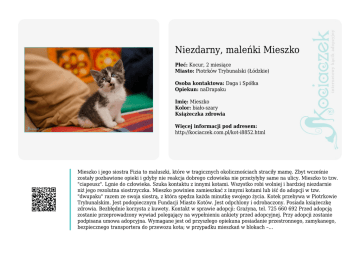 Niezdarny, maleńki Mieszko Płeć: Kocur, 2 miesiące Miasto: Piotrków Trybunalski (Łódzkie) Osoba kontaktowa: Daga i Spółka Opiekun: naDrapaku Imię: Mieszko Kolor: biało-szary Książeczka zdrowia Więcej informacji pod adresem: http://kociaczek.com.pl/kot-i8852.html Mieszko i jego siostra Fizia to maluszki, które w tragicznych okolicznościach straciły mamę. Zbyt wcześnie zostały pozbawione opieki i gdyby nie reakcja dobrego człowieka nie przeżyłyby same na ulicy. Mieszko to tzw. "ciapeusz". Lgnie do człowieka. Szuka kontaktu z innymi kotami. Wszystko robi wolniej i bardziej niezdarnie niż jego rezolutna siostrzyczka. Mieszko powinien zamieszkać z innymi kotami lub iść do adopcji w tzw. "dwupaku" razem ze swoja siostrą, z która spędza każda minutkę swojego życia. Kotek przebywa w Piotrkowie Trybunalskim. Jest podopiecznym Fundacji Miasto Kotów. Jest odpchlony i odrobaczony. Posiada książeczkę zdrowia. Bezbłędnie korzysta z kuwety. Kontakt w sprawie adopcji: Grażyna, tel. 725 660 692 Przed adopcją zostanie przeprowadzony wywiad polegający na wypełnieniu ankiety przed adopcyjnej. Przy adopcji zostanie podpisana umowa adopcyjna. Wymagane jest od przyszłego opiekuna posiadanie przestronnego, zamykanego, bezpiecznego transportera do przewozu kota; w przypadku mieszkań w blokach –…