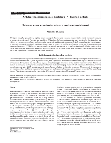NOWOTWORY Journal of Oncology • 2010 • volume 60 Number 4 • 305–309 Artykuł na zaproszenie Redakcji • Invited article Ochrona przed promieniowaniem w medycynie nuklearnej Marjorie R. Rose Niniejszy przegląd przedstawia ogólny zarys wymagań dotyczących ochrony pracowników przed promieniowaniem w medycynie nuklearnej. Przegląd jest wynikiem 35-letniego doświadczenia autorki w tej dziedzinie. Przedstawione są różnice w wymaganiach ochrony radiologicznej w medycynie nuklearnej i rentgenografii. Całe zagadnienie jest rozpatrywane w czterech głównych aspektach: ogólnego obrazowania w medycynie nuklearnej, leczenia emiterami beta, pozytonowej tomografii emisyjnej (PET) i coraz powszechniejszego obecnie stosowania w leczeniu emiterów alfa. Nacisk położony jest raczej na praktyczne wskazówki, jak unikać typowych błędów, niż na teorię leżącą u ich podstawy. Część uwagi poświęcono różnicom w praktykach stosowanych w różnych ośrodkach. Radiation protection in nuclear medicine This review provides a general overview of requirements for the radiation protection of staff working in nuclear medicine, derived from the author’s 35 years experience in the field. Differences between requirements in X-ray and nuclear medicine are outlined, for example, the importance of good housekeeping for protection of the nuclear medicine worker. The whole subject is considered under four headings: general nuclear medicine imaging, treatment with unsealed beta emitters, positron emission tomography (PET) and the currently expanding use of alpha emitters for treatment. The emphasis throughout is on practical advice and the avoidance of common errors and misapprehensions, rather than an account of the underlying theory. There is some consideration given to the differences in practice found between different centres. Słowa kluczowe: medycyna nuklearna, ochrona przed promieniowaniem, obrazowanie, emitery beta, emitery alfa, pozytonowa tomografia emisyjna Key words: nuclear medicine, radiation protection, imaging, beta emitters, alpha emitters, positron emission tomography Wstęp Odpowiednie utrzymanie pracowni jest równie ważnym wymogiem ochrony przed promieniowaniem w medycynie nuklearnej co czas ekspozycji, odległość od źródła promieniowania i stosowanie osłon. Są to trzy, dobrze znane każdemu pracownikowi, sposoby redukcji narażenia na promieniowanie. Istnieją także inne kwestie, które muszą oni dodatkowo wziąć pod uwagę w porównaniu z ich kolegami zatrudnionymi w pracowni rentgenowskiej. Przykładowo, źródłem promieniowania jonizującego w medycynie nuklearnej jest także pacjent. W większości przypadków jest on świadomy, że stanowić będzie źródło promieniowania także po opuszczeniu pracowni medycyny nuklearnej w trakcie powrotu do domu lub na oddział szpitalny. Dodatkowo substancje radioaktywne są często usuwane poprzez układ moczowy, dlatego trzeba The Christie NHS Foundation Trust Manchester United Kingdom brać pod uwagę również wpływ potencjalnego skażenia toalet i kanalizacji. Osoby zatrudnione w pracowniach rentgenowskich rzadko rejestrują na swych osobistych dozymetrach dawki o istotnym znaczeniu, podczas gdy pracownicy pracowni medycyny nuklearnej zwykle tak. Nadal istnieją na świecie poważne problemy z dostarczaniem generatorów molibdenowych. Okoliczności te są dobrze udokumentowane na stronach internetowych różnych organizacji zawodowych [1-3]. Jednak pracownie medycyny nuklearnej nadal stosują do obrazowania 99 mTechnet ze względu na jego sześciogodzinny półokres rozpadu, emisję promieniowania gamma o energii 140 keV oraz właściwości pozwalające na znakowanie licznych związków chemicznych, wykorzystywanych do badania funkcji różnych narządów i układów. Zapis „m” w 99 mTc oznacza metastabilność, co jest następną doskonałą cechą znacznika – brak jakiejkolwiek emisji beta, która podwyższałaby dawkę promieniowania, nie wpływając na jakość obrazowania. 306 Ochrona przed promieniowaniem w medycynie nuklearnej Spośród różnych sposobów redukcji narażenia na promieniowanie, szczególnie istotne w medycynie nuklearnej są czas ekspozycji i odległość od źródła promieniowania, gdyż osłona przed źródłami może być niewykonalna. Tam gdzie jest to możliwe, wymagana jest osłona silniejsza niż przed promieniowaniem rentgenowskim, ponieważ przeciętna energia przekracza 50-60 keV, tj. wartość typową dla pracowni rentgenowskich. Standardowa osłona przed promieniowaniem rentgenowskim zmniejsza energię promieniowania gamma (140 keV) jedynie o połowę. Pozostawanie za tego rodzaju osłoną może prowadzić do złudnego poczucia bezpieczeństwa. Fakt, iż promieniowanie w medycynie nuklearnej jest znacznie słabsze niż w pracowniach rentgenowskich, oznacza, że technicy nierzadko pozostają w pomieszczeniu, w którym pacjent jest poddawany badaniu (w maksymalnej możliwej odległości, ale bez korzystania z osłon). Rosnąca ilość gamma kamer, sprzężonych z tomografem komputerowym, eliminuje takie sytuacje. Pacjenci poddawani badaniu stanowią źródło promieniowania, do którego należy podejść blisko, by móc zoptymalizować jakość obrazów, a technicy medyczni muszą wykonać to profesjonalnie, ale w jak najkrótszym czasie. W trakcie przygotowywania radioizotopu najbardziej narażone na promieniowanie są palce (Ryc. 1). Przynajmniej w tej sytuacji użycie osłon jest możliwe, ponieważ źródła promieniowania są przetrzymywane w małych szklanych fiolkach, które z kolei są umieszczone w ołowianych pojemnikach. Taki pojemnik o grubości 3 milimetrów redukuje wielkość dawki promieniowania 99 mTc do jednej tysięcznej. W przypadku promieniowania gamma o wyższej energii potrzebne są znacznie grubsze pojemniki (Ryc. 2). Radioizotop jest zazwyczaj podawany dożylnie. Mimo iż w strzykawkach stosowane są osłony wolframowe lub ołowiane, nie da 