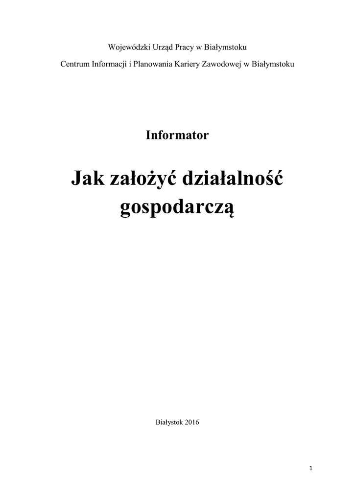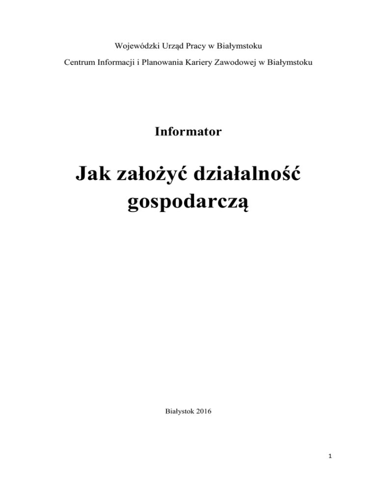 Wojewódzki Urząd Pracy w Białymstoku Centrum Informacji i Planowania Kariery Zawodowej w Białymstoku Informator Jak założyć działalność gospodarczą Białystok 2016 1 Wojewódzki Urząd Pracy w Białymstoku ul. Pogodna 22 15-354 Białystok Tel.: (85) 749 72 00 Fax: (85) 749 72 09 E-mail: [email protected] http://wupbialystok.praca.gov.pl/ Niniejsza publikacja ma charakter informacyjny. Została opracowana na podstawie informacji uznanych za wiarygodne i nie stanowi wykładni ani opinii prawnej. 2 SPIS TREŚCI 1. Predyspozycje do prowadzenia firmy ................................................................................................. 4 2. Pomysły na działalność gospodarczą .................................................................................................. 6 3. Biznesplan ........................................................................................................................................... 7 4. Formy prawne działalności gospodarczej ......................................................................................... 10 5. Formy opodatkowania działalności gospodarczej ............................................................................. 17 6. Rejestracja firmy ............................................................................................................................... 27 7. Zakład Ubezpieczeń Społecznych ..................................................................................................... 33 8. Źródła finansowania .......................................................................................................................... 34 9. Baza wiedzy ...................................................................................................................................... 42 3 1. Predyspozycje do prowadzenia firmy Na sukces działalności gospodarczej składa się wiele czynników. Oprócz lokalizacji firmy, pomysłu, czy działań marketingowych liczą się również umiejętności samego przedsiębiorcy, jego cechy osobowości, predyspozycje oraz wiedza z zakresu funkcjonowania firmy. Powodzenie w biznesie często osiągają ci, którzy stale poszukują nowej wiedzy, są otwarci na innowacje, potrafią planować długofalowo i konsekwentnie dążą do realizacji swojej wizji. Aby część tej wiedzy zdobyć, warto uczestniczyć w kursach i szkoleniach, dotyczących różnych aspektów prowadzenia działalności gospodarczej. W prowadzeniu własnej firmy przydają się: - odporność na stres - umiejętność analitycznego myślenia - umiejętność podejmowania decyzji - umiejętność organizacji pracy, zarzadzania sobą w czasie, zarządzania zespołem - zdolności przywódcze - umiejętności negocjacyjne - umiejętność współpracy. Jeśli myślisz o założeniu własnej działalności gospodarczej, to warto abyś odpowiedział/a sobie na pytanie: Czy ja się do tego nadaję? Jedni spełniają się pracując na etacie, inni prowadząc własne firmy. Alternatywą dla osób, które są fachowcami w swoim zawodzie, ale nie są przekonane, że poradzą sobie z prowadzeniem jednoosobowej działalności gospodarczej, jest znalezienie wspólnika, który zajmie się kwestiami formalnymi związanymi z ZUS i US i założenie spółki cywilnej. Aby sprawdzić/określić jakie posiadasz predyspozycje zawodowe możesz zgłosić się do Centrum Informacji i Planowania Kariery Zawodowej. Doradca zawodowy z pomocą standaryzowanych narzędzi pomoże ustalić Twoje predyspozycje do pracy lub prowadzenia działalności gospodarczej. 4 Kontakty do doradców zawodowych w Wojewódzkim Urzędzie Pracy w Białymstoku: Centrum Informacji i Planowania Kariery Zawodowej w Białymstoku ul. Pogodna 22, pok. 4, 10 15-354 Białystok tel.: 85 74 97 243 85 74 97 244 85 74 97 241 e-mail: [email protected] Centrum Informacji i Planowania Kariery Zawodowej Oddział w Łomży ul. Nowogrodzka 1 18-400 Łomża tel.: (86) 216 74 79 e-mail: [email protected] Centrum Informacji i Planowania Kariery Zawodowej Oddział w Suwałkach ul. Przytorowa 9B 16-400 Suwałki tel.: (87) 566 66 01 e-mail: [email protected] 5 2. Pomysły na działalność gospodarczą Powodzenie firmy na rynku zleży również od profilu działalności gospodarczej, którą zamierzasz założyć. Większość powstałych firm bazuje na powielaniu pomysłów już istniejących na rynku biznesowym. Tylko bardzo niewielki odsetek podmiotów gospodarczych powstaje w oparciu o innowacje (produkt lub usługa została wynaleziona i opracowana przez przedsiębiorcę). Wiele osób z sukcesem adaptuje różne ciekawe rozwiązania podpatrzone za granicą, dokonując czasem ich modyfikacji lub przeniesienia koncepcji wprost na grunt lokalny. Pomysły na biznes można czerpać z różnych źródeł: Rys. 1. Źródła pomysłów na działalność gospodarczą W oparciu o dane z 2014 roku można wskazać sektory, w jakich powstają nowe firmy: handel (ok. 30%), budowlanka (25%), transport (7%), medycyna (7%), motoryzacja (6%), uroda (6%), edukacja (5%), finanse i ubezpieczenia (4%), informatyka (4%), gastronomia (4%).1 1 G. Morawski, Własna firma na każdą kieszeń, Własny biznes. Franchising, kwiecień 2015, s. 9. 6 3. Biznesplan Podejmując decyzję o złożeniu własnej działalności gospodarczej warto odpowiedzieć sobie na kilka pytań: - Dlaczego zamierzam prowadzić działalność? - Jaki rodzaj działalności gospodarczej zamierzam prowadzić? - Jakie będą zasady funkcjonowania mojej działalności? - Jak będę sprzedawał/a swój produkt/ swoją usługę? - Jak zdobędę klienta? - Jaką formę organizacyjno – prawną wybieram dla prowadzenia mojej działalności? - Będę uświadamiać moim klientom, że moja firma jest najlepsza w następujący sposób.... - Moim największym i najsilniejszym konkurentem jest.... - Gdzie ulokuję swoją firmę? - Jakie chcę sprawić wrażenie? - Jaki jest mój rynek docelowy? - Kim są m