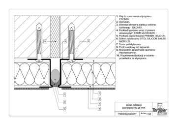 10 8 7 1. Klej do mocowania styropianu EKOMIX. 2. Styropian. 3. Warstwa zbrojona siatką z włókna szklanego EKOMIX. 4. Podkład tynkarski wraz z tynkiem elewacyjnym EKOR lub EKOMIX. 5. Podłoże zagruntowane PRIMER SILICON. 6. Silikon dylatacyjny SITOL SILICON BASSO MODULO. 7. Sznur polietylenowy. 8. Profil cokołowy lub kątownik. 9. Mocowanie za pomocą łączników mechanicznych. 10. Wypełnienie dylatacji w scianie przekładka ze styropianu. 9 1 2 6 5 3 4 Detal dylatacji szerokości do 35 mm. Przekrój poziomy Nr rys. 1.08