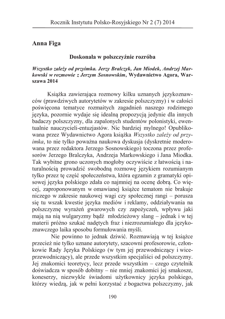 Rocznik Instytutu Polsko-Rosyjskiego Nr 2 (7) 2014 Anna Figa Doskonała w polszczyźnie rozróba Wszystko zależy od przyimka. Jerzy Bralczyk, Jan Miodek, Andrzej Markowski w rozmowie z Jerzym Sosnowskim, Wydawnictwo Agora, Warszawa 2014 Książka zawierająca rozmowy kilku uznanych językoznawców (prawdziwych autorytetów w zakresie polszczyzny) i w całości poświęcona tematyce rozmaitych zagadnień naszego rodzimego języka, pozornie wydaje się idealną propozycją jedynie dla innych badaczy polszczyzny, dla zapalonych studentów polonistyki, ewentualnie nauczycieli-entuzjastów. Nic bardziej mylnego! Opublikowana przez Wydawnictwo Agora książka Wszystko zależy od przyimka, to nie tylko poważna naukowa dyskusja (dyskretnie moderowana przez redaktora Jerzego Sosnowskiego) toczona przez profesorów Jerzego Bralczyka, Andrzeja Markowskiego i Jana Miodka. Tak wybitne grono uczonych mogłoby oczywiście z łatwością i naturalnością prowadzić swobodną rozmowę językiem rozumianym tylko przez tę część społeczeństwa, która egzamin z gramatyki opisowej języka polskiego zdała co najmniej na ocenę dobrą. Co więcej, zaproponowanym w omawianej książce tematom nie brakuje niczego w zakresie naukowej wagi czy społecznej rangi – porusza się tu wszak kwestie języka mediów i reklamy, oddziaływania na polszczyznę wyrażeń gwarowych czy zapożyczeń, wpływu jaki mają na nią wulgaryzmy bądź młodzieżowy slang – jednak i w tej materii próżno szukać nadętych fraz i niezrozumiałego dla językoznawczego laika sposobu formułowania myśli. Nie powinno to jednak dziwić. Rozmawiają w tej książce przecież nie tylko uznane autorytety, szacowni profesorowie, członkowie Rady Języka Polskiego (w tym jej przewodniczący i wiceprzewodniczący), ale przede wszystkim specjaliści od polszczyzny. Jej znakomici teoretycy, lecz przede wszystkim – czego czytelnik doświadcza w sposób dobitny – nie mniej znakomici jej smakosze, koneserzy, niezwykle świadomi użytkownicy języka polskiego, którzy wiedzą, jak w pełni korzystać z bogactwa polszczyzny, jak 190 Rocznik Instytutu Polsko-Rosyjskiego Nr 2 (7) 2014 z wyczuciem i niewymuszoną naturalnością penetrować rozmaite jej meandry, zaułki, załamania i szczeliny. Jak – wciąż pozostając wiernym poprawnej wymowie – ubierać polszczyznę w zabawę, jak z nią igrać i jednocześnie obdarzać ją wielkim szacunkiem. Profesorowie Bralczyk, Markowski i Miodek zdają sobie sprawę, jak okiełznać „wieczną w polszczyźnie rozróbę”47, czyniąc ją (polszczyznę, nie rozróbę) – wskutek namysłu, słusznego zastanowienia i świadomości językowej – niemniej żywiołową, czarującą, po prostu piękną. w jednej z rozmów profesor Jerzy Bralczyk wypowiada niezwykle znamienne zdanie: Nie jestem pewien, czy w ogóle należy uczyć poprawności. Trzeba raczej uczyć świadomości języka. Bo jeżeli ja znam formy poprawne i niepoprawne, to nie jestem zobligowany do używania tych poprawnych. Tak jak mówił Gombrowicz: jeżeli wiem, że nie można dłubać w nosie, to już mogę dłubać. (s. 231) Wydaje się, że to jest właśnie samo sedno owej polszczyźnianej rozróby, rozróby podniesionej do właściwych granic, bowiem – by posłużyć się słowami profesora Jana Miodka z innego miejsca omawianej książki – „Miałem takich znajomych, którzy nie potrafili być potoczni w języku. Moim zdaniem to jest bardzo wielka tragedia stylistyczna” (s. 150). Wypowiedziom uczonych zebranym w tym tomie owa tragedia nie grozi, są od niej jak najdalsze. Tym większa więc jest przyjemność lektury, obcowania ze słowem pozbawionym tego, co prof. Bralczyk nazywa poczuciem „krygowania się, pretensjonalności, sztucznego, fałszywego używania języka” (s. 150). Wczytując się w te fascynujące – nie tylko dla polonisty – rozmowy o języku, warto wsłuchiwać się więc w sam język, wyobrażać sobie jego brzmienie, melodię, ton – te wszystkie szmery, szepty, rozciągnięcia i ściągnięcia, które akustycznie dostrajały przekazywaną treść. Książka Wszystko zależy od przecinka dzieli się na trzynaście rozdziałów, z których każdy stanowi odrębną rozmowę poświęconą innemu – nie mniej istotnemu – zjawisku typowemu dla 47 Niezapomniana fraza użyta przez Mariana Pankowskiego, która stała się również tytułem książkowego wydania wywiadu-rzeki z pisarzem (P. Marecki, Nam wieczna w polszczyźnie rozróba. Marian Pankowski mówi, Kraków 2011). 191 Rocznik Instytutu Polsko-Rosyjskiego Nr 2 (7) 2014 współczesnej polszczyzny. Wstęp, który poprzedza właściwe dyskusje, jest nie tylko wprowadzeniem, przybliżającym czytelnikowi sylwetki rozmówców (skądinąd świetnie znanych większości Polaków), ale i wprowadzeniem uświadamiającym odbiorcy charakter prezentowanej książki. Polszczyznę traktuje się tu z największym uznaniem, co nie przeszkadza robić z niej użytek, bawić się rozmaitymi jej stylami i niekończącymi się możliwościami. Jerzy Sosnowski słusznie zauważa, że „nie tylko ja mówię językiem, ale sam język mówi do mnie” (s. 8). Uzmysłowienie sobie tego zjawiska, dojrzenie pełni bogactwa języka, który zmienia wektor, by przemawiać do nas poprzez swoje niuanse, wieloznaczności, słabości i niepewności, daje nam (o czym zapewnia prof. Jerzy Bralczyk) wiele przyjemności. Książkę otwiera rozdział zatytułowany Etykieta i netykieta z przecinkiem w tle i poświęcony sposobom mówienia/pisania charakterystycznym dla polszczyzny doby Internetu. To znamienne rozpoczęcie, pokazuje bowiem dynamikę przemian, jakim podlega współczesny język polski. Myśląc o budowie językoznawczej książki czy nawet cyklu popularyzatorskich wywiadów bądź programów poświęconych polszczyźnie, tematykę przemian języka dyktowanych czy uwypuklanych przez sieć zwykliśmy raczej marginalizować, spychać w otchłanie ostatnich rozd