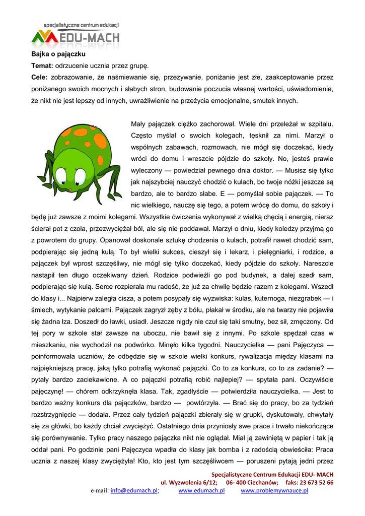 Bajka o pajączku Temat: odrzucenie ucznia przez grupę. Cele: zobrazowanie, że naśmiewanie się, przezywanie, poniżanie jest złe, zaakceptowanie przez poniżanego swoich mocnych i słabych stron, budowanie poczucia własnej wartości, uświadomienie, że nikt nie jest lepszy od innych, uwrażliwienie na przeżycia emocjonalne, smutek innych. Mały pajączek ciężko zachorował. Wiele dni przeleżał w szpitalu. Często myślał o swoich kolegach, tęsknił za nimi. Marzył o wspólnych zabawach, rozmowach, nie mógł się doczekać, kiedy wróci do domu i wreszcie pójdzie do szkoły. No, jesteś prawie wyleczony — powiedział pewnego dnia doktor. — Musisz się tylko jak najszybciej nauczyć chodzić o kulach, bo twoje nóżki jeszcze są bardzo, ale to bardzo słabe. E — pomyślał sobie pajączek. — To nic wielkiego, nauczę się tego, a potem wrócę do domu, do szkoły i będę już zawsze z moimi kolegami. Wszystkie ćwiczenia wykonywał z wielką chęcią i energią, nieraz ścierał pot z czoła, przezwyciężał ból, ale się nie poddawał. Marzył o dniu, kiedy koledzy przyjmą go z powrotem do grupy. Opanował doskonale sztukę chodzenia o kulach, potrafił nawet chodzić sam, podpierając się jedną kulą. To był wielki sukces, cieszył się i lekarz, i pielęgniarki, i rodzice, a pajączek był wprost szczęśliwy, nie mógł się tylko doczekać, kiedy pójdzie do szkoły. Nareszcie nastąpił ten długo oczekiwany dzień. Rodzice podwieźli go pod budynek, a dalej szedł sam, podpierając się kulą. Serce rozpierała mu radość, że już za chwilę będzie razem z kolegami. Wszedł do klasy i... Najpierw zaległa cisza, a potem posypały się wyzwiska: kulas, kuternoga, niezgrabek — i śmiech, wytykanie palcami. Pajączek zagryzł zęby z bólu, płakał w środku, ale na twarzy nie pojawiła się żadna łza. Doszedł do ławki, usiadł. Jeszcze nigdy nie czuł się taki smutny, bez sił, zmęczony. Od tej pory w szkole stał zawsze na uboczu, nie bawił się z innymi. Po szkole spędzał czas w mieszkaniu, nie wychodził na podwórko. Minęło kilka tygodni. Nauczycielka — pani Pajęczyca — poinformowała uczniów, że odbędzie się w szkole wielki konkurs, rywalizacja między klasami na najpiękniejszą pracę, jaką tylko potrafią wykonać pajączki. Co to za konkurs, co to za zadanie? — pytały bardzo zaciekawione. A co pajączki potrafią robić najlepiej? — spytała pani. Oczywiście pajęczynę! — chórem odkrzyknęła klasa. Tak, zgadłyście — potwierdziła nauczycielka. — Jest to bardzo ważny konkurs dla pajączków, bardzo — powtórzyła. — Brać się do pracy, bo za tydzień rozstrzygnięcie — dodała. Przez cały tydzień pajączki zbierały się w grupki, dyskutowały, chwytały się za główki, bo każdy chciał zwyciężyć. Ostatniego dnia przyniosły swe prace i trwało niekończące się porównywanie. Tylko pracy naszego pajączka nikt nie oglądał. Miał ją zawiniętą w papier i tak ją oddał pani. Po godzinie pani Pajęczyca wpadła do klasy jak bomba i z radością obwieściła: Praca ucznia z naszej klasy zwyciężyła! Kto, kto jest tym szczęśliwcem — poruszeni pytają jedni przez Specjalistyczne Centrum Edukacji EDU- MACH ul. Wyzwolenia 6/12; 06- 400 Ciechanów; faks: 23 673 52 66 e-mail: [email protected]; www.edumach.pl www.problemywnauce.pl drugich. Pani rozwinęła rulon i przed ich oczyma ukazała się cala utkana z promieni słońca sieć, mieniąca się wszystkimi kolorami tęczy. Jaka piękna, cudowna — szepcą. Ale, ale, proszę pani, to nie jest praca żadnego z nas — powiedzieli uczniowie, zawiedzeni. To jest pajęczynowa sieć naszego pajączka — powiedziała pani i podeszła do niego, całując go serdecznie. On, ten kuter... to niemożliwe — kiwały główkami. Tak pięknie tkać nie potrafi nikt — powiedziała pani. — Dzięki niemu nasza klasa wygrała konkurs i w nagrodę pojedziemy do grot zobaczyć najstarsze sieci pajęcze. Hurra, hurra! — rozległy się gromkie krzyki. Rzucili się wszyscy na pajączka, gratulując mu i ściskając go. Od tej pory już nikt go nie przezywał, przeciwnie — wszyscy chcieli się z nim bawić i uczyć, byli dumni z jego umiejętności. Bajka ta dotyka problemu odmienności i odrzucenia przez grupę. Dzieci przekonują się dzięki niej, że przekreślanie kogoś ze względu na jedną cechę jest niesprawiedliwe i krzywdzące, a przysparzanie innym powodów do smutku i przykrości wcale nie świadczy o nas dobrze. Może stanowić wstęp do dyskusji na temat sposobów radzenia sobie w podobnych sytuacjach. Proponowane pytania pogłębiające: - Co spotkało pajączka? - Dlaczego był smutny? - Co powinniśmy zrobić gdy widzimy, że ktoś komuś dokucza? - Czy należy wyśmiewać się z innych np. gdy wyglądają inaczej? Prace plastyczne Dzieci mogą wykonać ilustracje dla bajki, np. namalować jak pajączek wykonuje wyjątkową pajęczynę. Bajkę zaczerpnięto z książki M. Molickiej Bajkoterapia. O lękach dzieci i nowej metodzie terapii. (2002). Poznań: Wydawnictwo Media Rodzina. s.164. Obrazek pochodzi ze strony: pm1debica.strefa.pl/wiersz510.html Specjalistyczne Centrum Edukacji EDU- MACH ul. Wyzwolenia 6/12; 06- 400 Ciechanów; faks: 23 673 52 66 e-mail: [email protected]; www.edumach.pl www.problemywnauce.pl