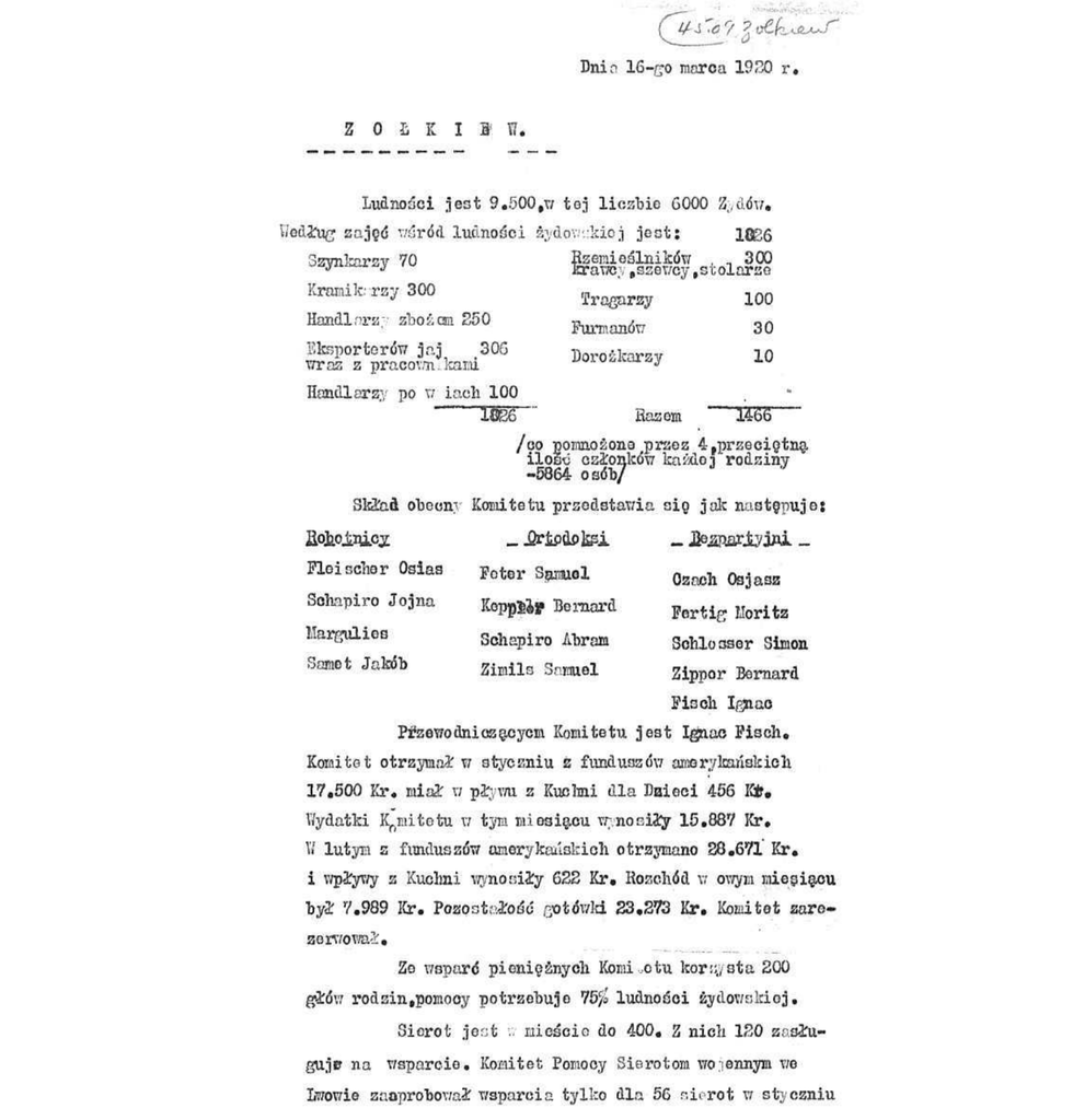 Dnio 16-go maroa 1920 r . Z 0 £ K I » W. M-no^ci jest 9.500 # T/ tej liczbie 6000 Zj/ddn, V/etUtag zajoc* v/s*rdd ludnodci aydovj'.,:kiej j e s t : 1826 RzemiesUnikdw ^ _ 300 Szynkarzy 70 KraTvey #szer/cy ,stolarze Kramik;-rzy 300 Tragarzy 100 Handlnrz,;; zbo&cm 250 Furmandw 30 Bksporterdw jaj 306 Doroskarzy 10 wraz z pracovm..kami Handlarzy po vr iach 100 im —ISET Razem /oo pomno&one przez 4 f przecigtna ilosc csionkow ka&dei rodziny -5864 osdb/ Skfefi obeony Komitetu przedstavria sio jak nastepujej Rofcojinics _ JSripdPksi Pleiseller Oslaa _ JtouKiyjai. _ Peter Spiaiel Ozaoh Osjasz Schapiro Jojna Kepp$Jf Bernard Fertig Moritz Margulies Schapiro A"brata Sohlooser Simon Samet Jakdb Zimils Samel Zippor Bernard Pisoh Igaao Ptfzewodniozacyem Komitetu jest Ignao Fisch. Komitet otrzymai w styczniu z funduszdw amerykanskich 17.500 Kr. mia3: v piywu z Kuclmi dla Daieci 456 Kfc« Wydatki K0mitetu u tym miosiacu wrnosi^ 15.887 Kr. VI lutym z fun&uszdw ornery kaiiskich otrzymano 28.671" Kr. i wp2#wy z Kuchni v#nosi3ty 622 Kr. Rozchdd w owym miesiacu by£ 7.989 Kr. Pozosta^odc* gotdwki 23.273 Kr. Komitet zarezerwowa*. Ze wspard pienieznyoh Komi.otu korzyata 200 gk6vi rodzin,pomooy potrzebuje 75$ ludnoa*oi zydov/skiej, Sierot jest v: iniegcie do 400. Z nioh 120 zasitogujp na wsparoie, Komitet Pomooy Sierotom wo;iennym we Lwowie zaoprobov/a£ wsparcia tylko dla 56 sierot w styczniu i 57 w lutym. W styczniu Komitet dw wyznaczyi po 30 KB. na g£owota w lutym po 60. Z instytucji spoiecznych nalezy wymienid: 1 . Talmud Tore,-duszna,brudna i ciasna szkoie - do ktdrej uczeszcza 300 d z i e c i , a wykl'alda 8 keiameddw. Wiadze szko£y\groza jej zamknieciem w razie nieotrzymania skutecznej powazniej3zej zapomogi. W miegcie i s t n i e j $ jeszcze nast^pujace instytucje: • Dom Sierot ,mogacy umie^oid 30 dzieci. Dom zajety j e s t przez \\. w&tdze wojskowe, Poczyniono odpov/iednie kroki f by go zwolnid o d V \ rekwizycji. n \ I.Iojszew Zkonim" dom dla starcdwt\v ktorym przeb;,wa od 20-30 osdb. Magi strait miejski v/yznacza na utrzymanie kazdej osoby 36 Kr. miesiecznie i to nie s t a l e . P.K.P.D. wyznacza kuchni dzieciecej 368 r a c j i zywnoseiowych,z ktdrych korzysta dwa razy dziennie 420 dzieci zydowski<h< i 120 wyrostkdw. i Z odziezy otrzymano dla dzieci zydowskich 98 par obuwia, 99 par poiiczoch i skarpetek,105 kurtek dziee4§cych. W miegcie panuje brak zywnodci i odzie&y.Odbudowie bytu ekonomicznego ludnodci zydowskiej mozna byioby pomdc przez utworzenie instytucji kredyto?/ej t-ktdraby udzielaia pozyczek w formie gotdwki i rnaterjaidw. Nastepnie poniewaz okolica jest zasobna w len,przez zaiozenie fabryki w2:dki$B2kffi§zej.Skdr j e s t tez poddostatkiem -za£o&enie fabryld obuwia by£oby na ozasie .Potrzebne sa maszyny do szycia.dla szewcdw i krawcdw. Odczuwa sio brak domdw mieszkalnych:Li!che odzywianie, ktdremu narazie mosna zaradzid jedynie przez za^ozenie kuchniy ludowej in.eiaanota',nedza i-niechlujnodd t droi,yzna lekdw przyozyniaja sie do rozpowszechniania chordb,"W ezczegdlnodci tyfusu.Poniewaz wiele dzieci pozostawa£o bez opieki lekarskioj, Komitet postanowi2: na sta3:e zaangazowad lekarza.piacao od poszczegdlnych porad. \ Zapomoga miesieczna udzielana przez Geniral© Lwowska Zdikwi jest oaZkiem niewystarczajaca.Nadomiar zie'go izapomoga nieraz nadchodzi z opd^nieniem 2-u miesiecznym.. \,