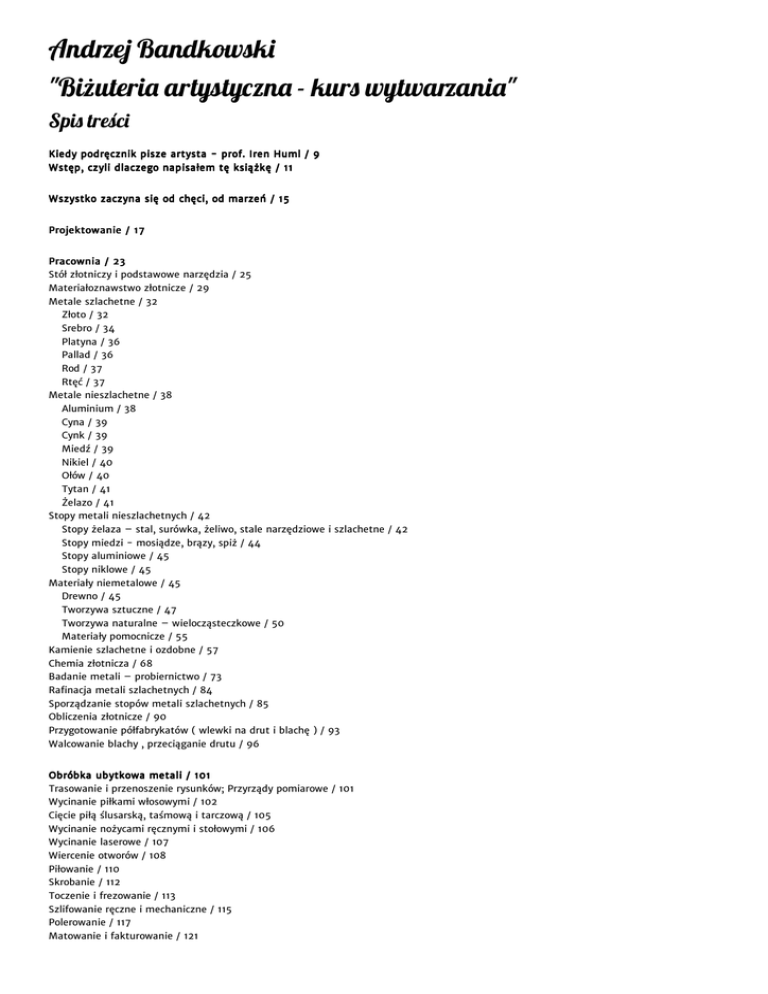 Andrzej Bandkowski "Biżuteria artystyczna - kurs wytwarzania" Spis treści Kiedy podręcznik pisze artysta - prof. Iren Huml / 9 Wstęp, czyli dlaczego napisałem tę książkę / 11 Wszystko zaczyna się od chęci, od marzeń / 15 Projektowanie / 17 Pracownia / 23 Stół złotniczy i podstawowe narzędzia / 25 Materiałoznawstwo złotnicze / 29 Metale szlachetne / 32 Złoto / 32 Srebro / 34 Platyna / 36 Pallad / 36 Rod / 37 Rtęć / 37 Metale nieszlachetne / 38 Aluminium / 38 Cyna / 39 Cynk / 39 Miedź / 39 Nikiel / 40 Ołów / 40 Tytan / 41 Żelazo / 41 Stopy metali nieszlachetnych / 42 Stopy żelaza – stal, surówka, żeliwo, stale narzędziowe i szlachetne / 42 Stopy miedzi - mosiądze, brązy, spiż / 44 Stopy aluminiowe / 45 Stopy niklowe / 45 Materiały niemetalowe / 45 Drewno / 45 Tworzywa sztuczne / 47 Tworzywa naturalne – wielocząsteczkowe / 50 Materiały pomocnicze / 55 Kamienie szlachetne i ozdobne / 57 Chemia złotnicza / 68 Badanie metali – probiernictwo / 73 Rafinacja metali szlachetnych / 84 Sporządzanie stopów metali szlachetnych / 85 Obliczenia złotnicze / 90 Przygotowanie półfabrykatów ( wlewki na drut i blachę ) / 93 Walcowanie blachy , przeciąganie drutu / 96 Obróbka ubytkowa metali / 101 Trasowanie i przenoszenie rysunków; Przyrządy pomiarowe / 101 Wycinanie piłkami włosowymi / 102 Cięcie piłą ślusarską, taśmową i tarczową / 105 Wycinanie nożycami ręcznymi i stołowymi / 106 Wycinanie laserowe / 107 Wiercenie otworów / 108 Piłowanie / 110 Skrobanie / 112 Toczenie i frezowanie / 113 Szlifowanie ręczne i mechaniczne / 115 Polerowanie / 117 Matowanie i fakturowanie / 121 Obróbka plastyczna metalu / 129 Kucie / 129 Klepanie / 130 Wyoblanie / 134 Repusowanie i cyzelowanie / 137 Tłoczenie / 145 Wygniatanie / 150 Metody łączenia elementów wyrobu złotniczego / 153 Spawanie / 153 Lutowanie / 155 Lutowanie miękkie / 155 Lutowanie twarde / 155 Lutowanie srebra / 164 Lutowanie złota / 164 Lutowanie platyny i palladu / 165 Lutowanie stali nierdzewnej / 165 Zgrzewanie / 165 Nitowanie / 167 Połączenia gwintowe / 172 Połączenia blacharskie / 177 Klejenie / 177 Wykonywanie podstawowych elementów biżuterii / 179 Rurka – szarnir / 179 Kula , soczewka / 185 Ramka – carga; Ramka z rurki / 191 Puszka / 193 Zawiasy / 196 Zapięcia – konstrukcja i wykonanie / 198 Obrączka płaska, szyna, szeroka wypukła i wklęsła / 204 Produkcja obrączek / 211 Ćwiczenia wycinania inicjału lub ornamentu – możliwości / 214 Pierścionek z kamieniem (kaboszon) - konstrukcja klasyczna / 216 Techniki złotnicze / 219 Grawerowanie / 219 Giloszowanie / 226 Wytrawianie / 228 Aplikacje / 230 Filigran / 233 Inkrustacja i nabijanie / 238 Emalia / 240 Emalia ogniowa / 240 Emalie na bazie żywic epoksydowych / 253 Emalie światło utwardzalne / 254 Niello / 255 Mokume-gane / 258 Kaum-boo / 263 Złocenie ogniowe / 266 Kameryzacja – ozdabianie kamieniami szlachetnymi i ozdobnymi / 269 Szlify kamieni / 269 Oprawa kaboszonu / 276 Oprawa kamieni o szlifie brylantowym / 278 Oprawa rurkowa / 278 Kastownik - oprawy stożkowe i ostrosłupowe / 281 Konstruowanie koronki / 283 Abdek / 285 Chaton – konstrukcja koszyczków / 287 Oprawa gładka – lusterko / 290 Oprawa w korn / 294 Fałszywy korn / 296 Oprawa pereł i kamieni kulek / 297 Odlewnictwo artystyczne / 299 Podział odlewnictwa / 299 Odlewanie w formach piaskowych / 300 Odlewanie na tracony wosk / 303 Odlewanie dużych rzeźb i przedmiotów użytkowych / 304 Modele do powielania / 305 Formy gumowe i silikonowe / 309 Woski i woskowniki / 312 Tworzenie choinki / 314 Sporządzanie formy / 317 Wyżarzanie formy / 318 Przygotowanie stopu i topienie / 320 Odlewanie, urządzenia odlewnicze / 321 Wykańczanie odlewów / 324 Odlewanie z kamieniami / 325 Obróbka końcowa / 327 Bejcowanie / 327 Odzłacanie i polerowanie elektrolityczne / 328 Powłoki galwaniczne / 329 Galwanoplastyka / 331 Oksydowanie i barwienie metali / 332 Barwienie srebra i metali kolorowych / 335 Anodowanie aluminium / 337 Barwienie tytanu / 340 Konserwacja i naprawy / 341 Badanie metalu i oczyszczanie z lutów miękkich / 341 Usuwanie wgnieceń / 343 Dorabianie ubytków i lutowanie / 344 Wykańczanie (starzenie, fakturowanie, polerowanie) / 346 Przykłady / 347 Dokładny opis kolejnych procesów technologicznych wykonywanych przy realizacji kilku wybranych przedmiotów zrealizowanych w różnych okresach mojej twórczości Przykłady realizacji większych przedmiotów / 429 Literatura / 445 Andrzej Bandkowski – publikacje, wycinki prasowe, zdjęcia / 446 Andrzej Bandkowski – nota biograficzna / 449 Indeks / 453